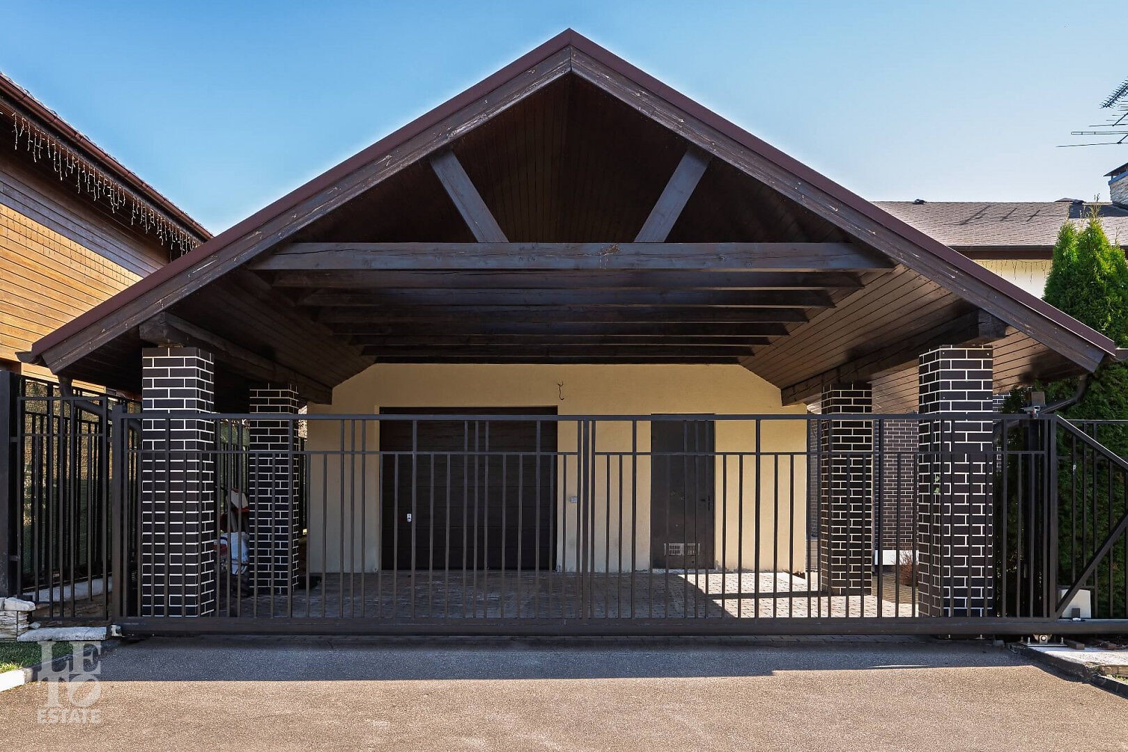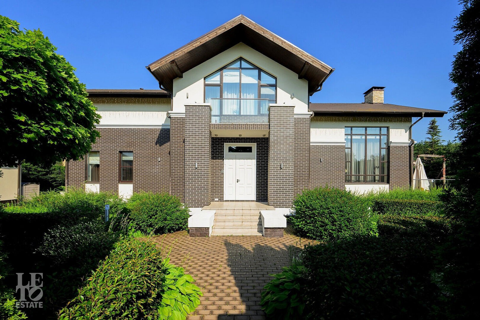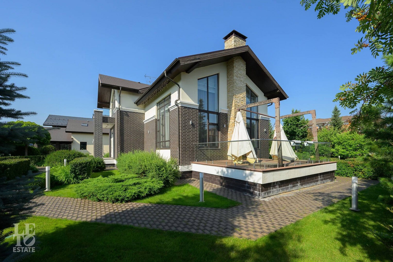 В доме: 3 спальни, светлая гостиная с выходом на живописную террасу, объединенная кухня-столовая, спа-зона (хамам и комната отдыха), кабинет, просторная прихожая, с/у, постирочная. На участке - отдельно стоящий гараж на 2 м/м с квартирой для персонала на втором этаже и навес на 2 м/м.