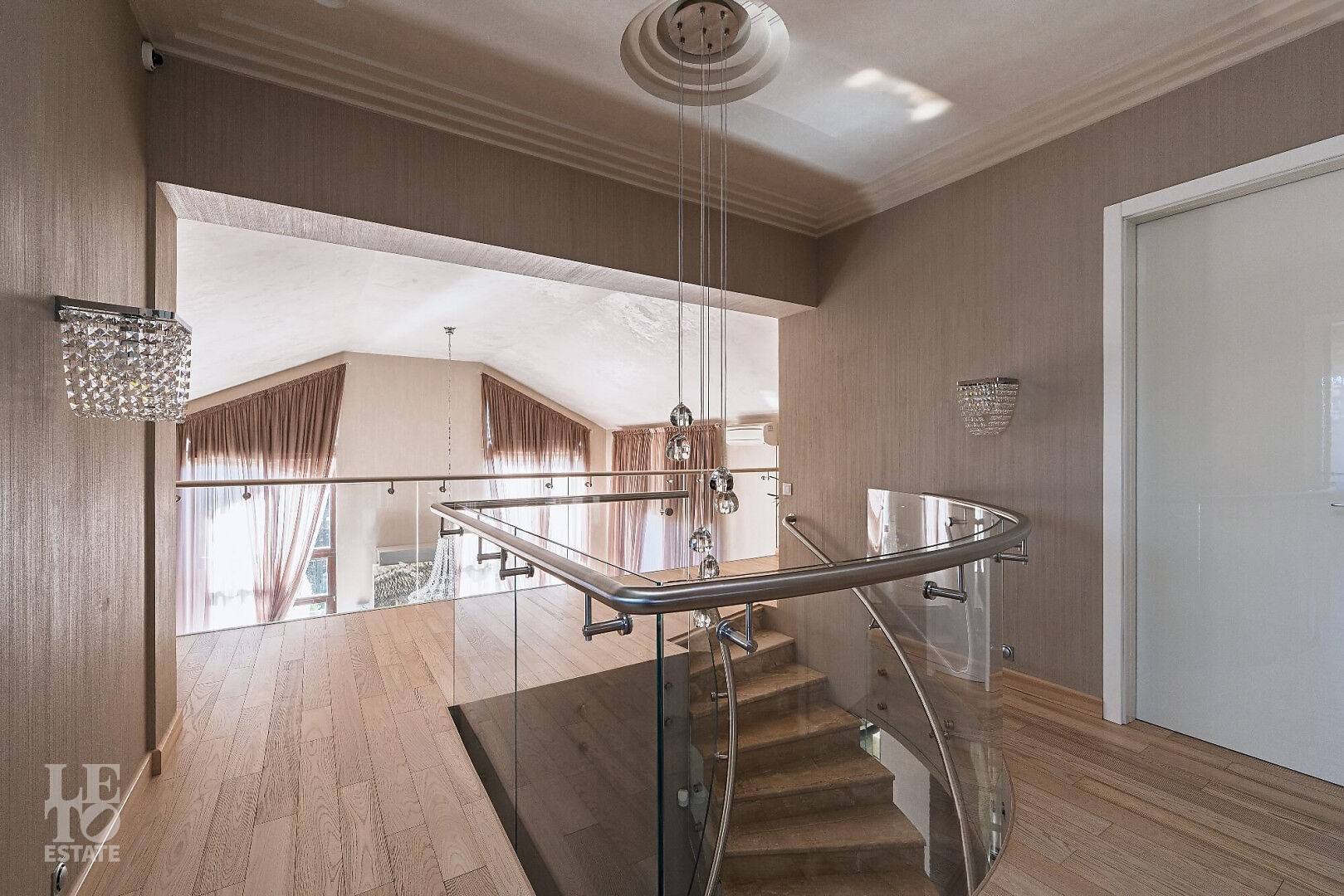Статусный фасад в стиле английской классики, второй свет в гостиной высотой 8 м, модная лестница на второй этаж, круглая кровать в одной из спален, дорогие материалы в отделке.