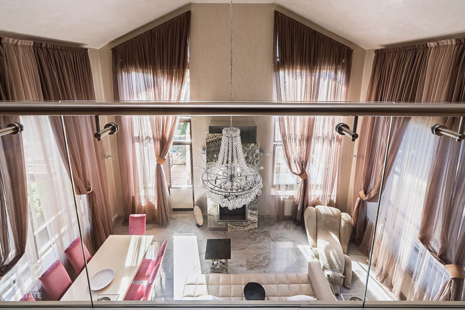 Первый этаж: прихожая, гардеробная, кухня-столовая, гостиная с выходом на террасу, санузел, хамам, комната отдыха, кабинет с выходом на балкон, крыльцо, постирочная, кладовая.