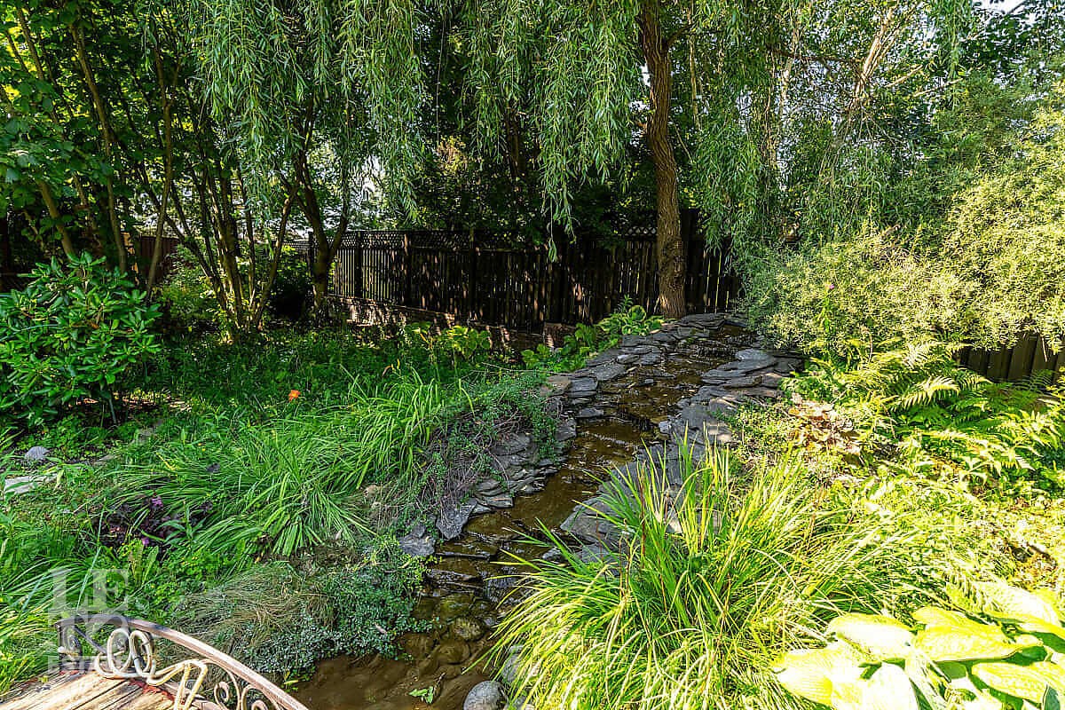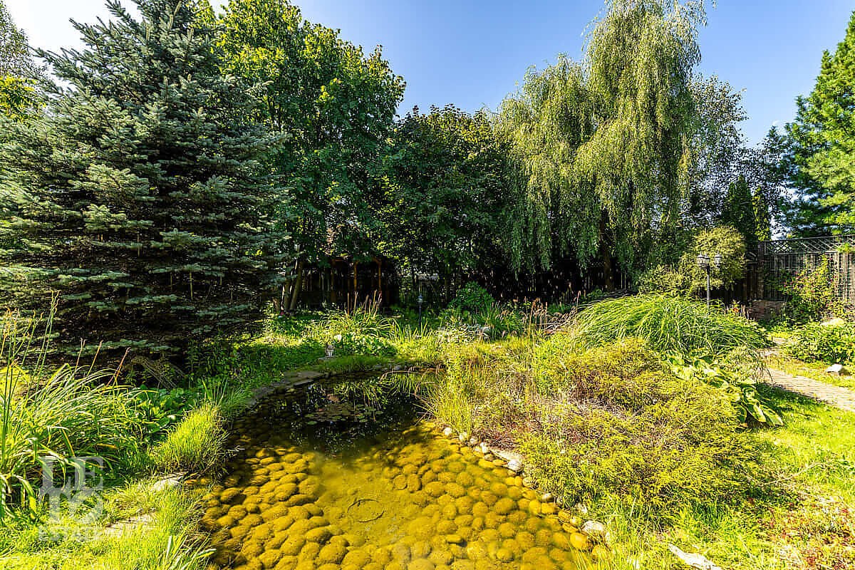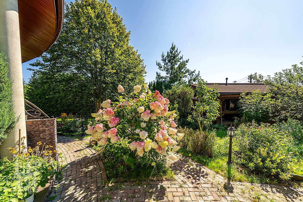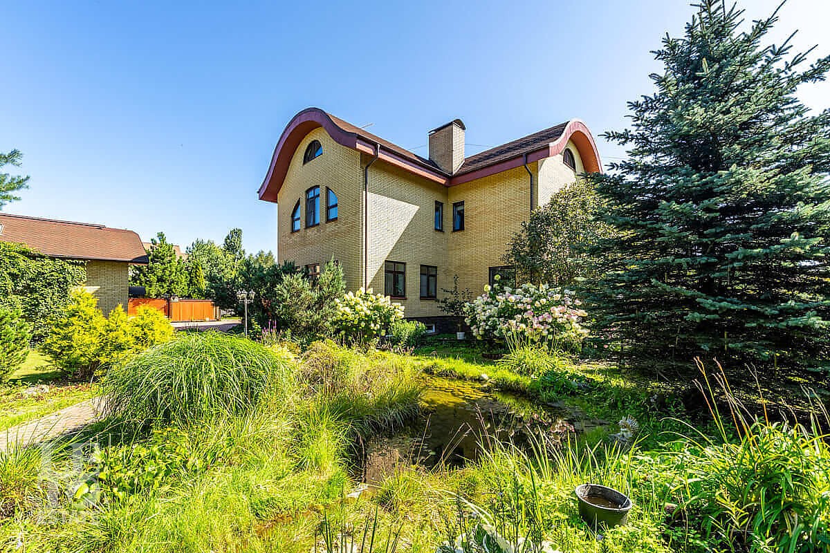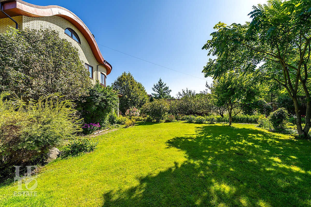 На участке выполнен ландшафтный дизайн, посажены лесные и плодовые деревья, кустарники, цветы, дорожки вымощены брусчаткой и природным камнем, установлено ландшафтное освещение. На участке площадью 27 соток расположен искусственный ручей с прудом и декоративной рыбой.