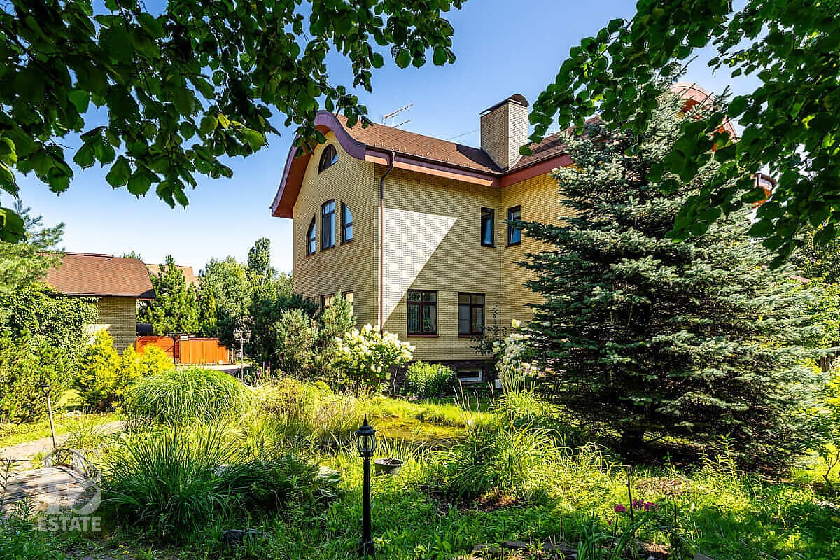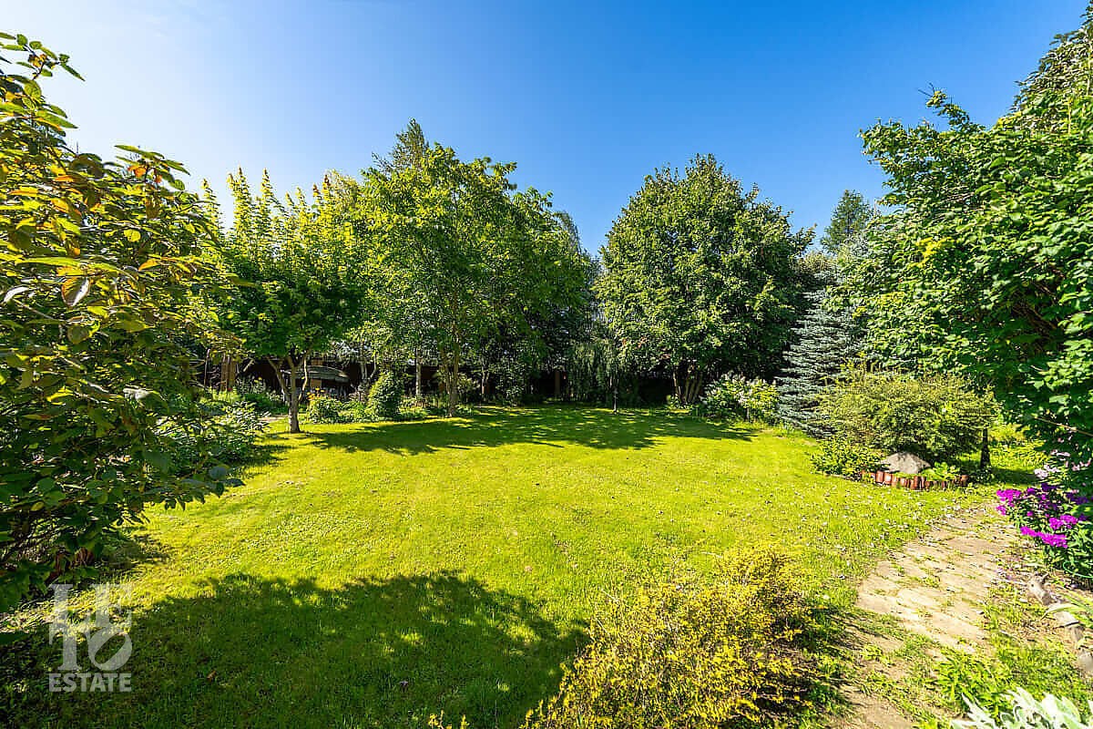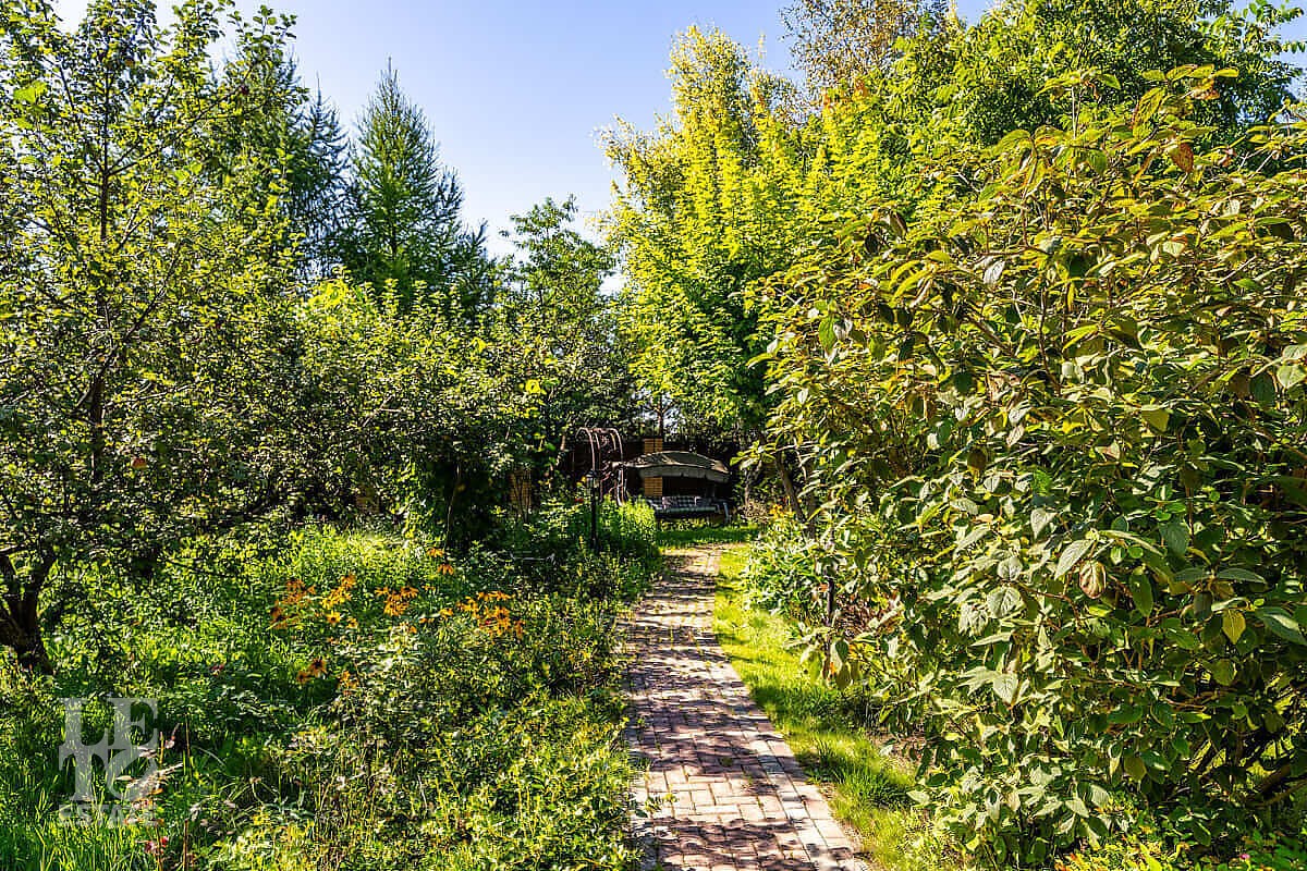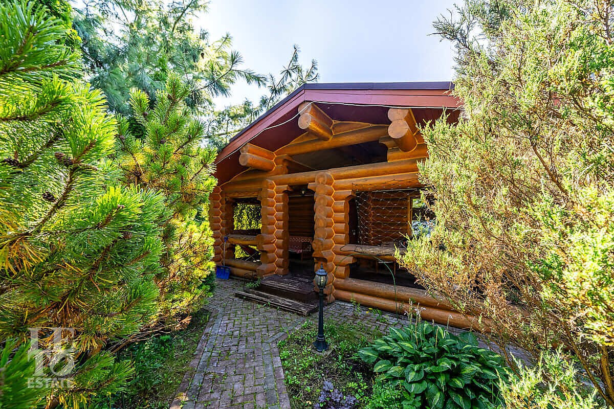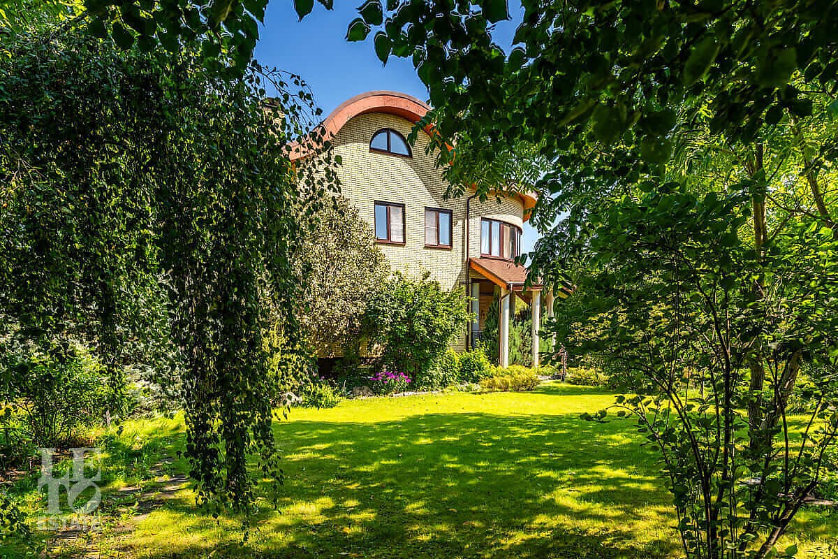 На участке выполнен ландшафтный дизайн, посажены лесные и плодовые деревья, кустарники, цветы, дорожки вымощены брусчаткой и природным камнем, установлено ландшафтное освещение. На участке площадью 27 соток расположен искусственный ручей с прудом и декоративной рыбой.