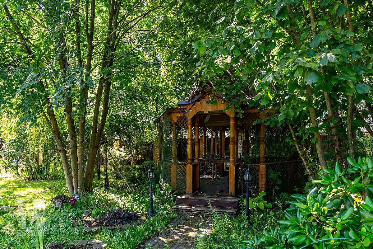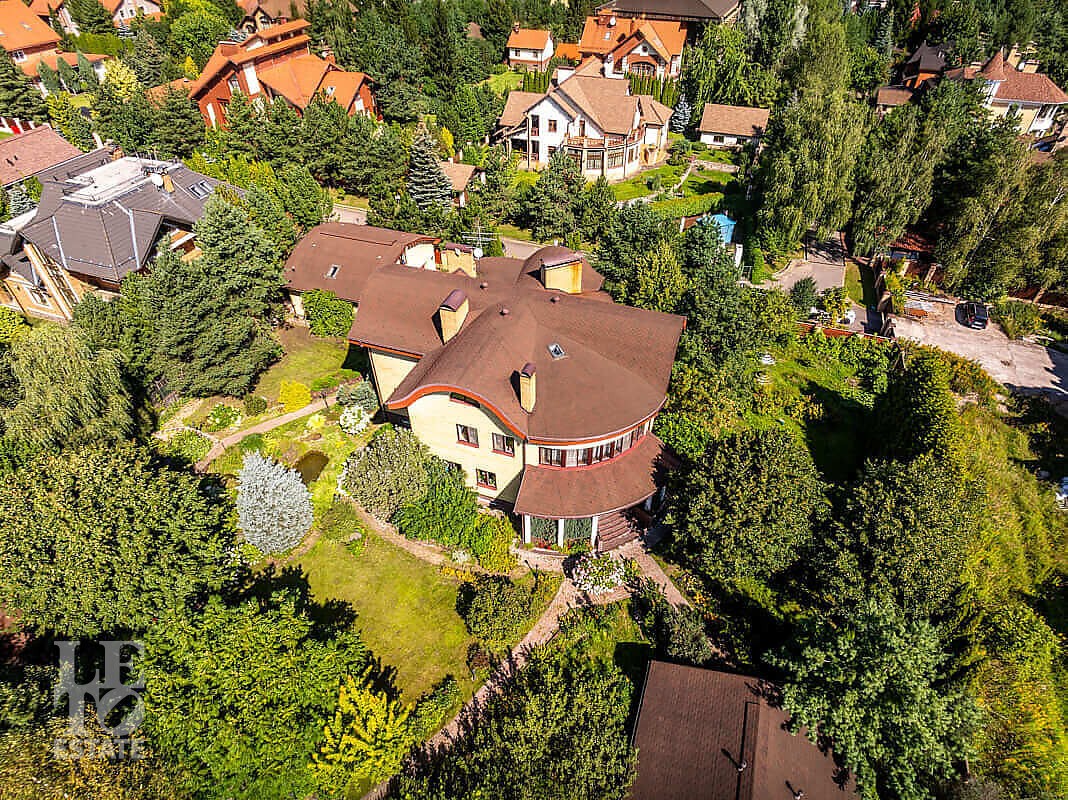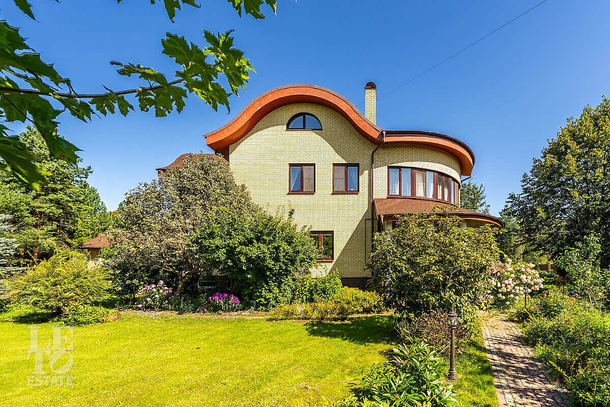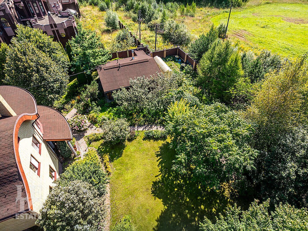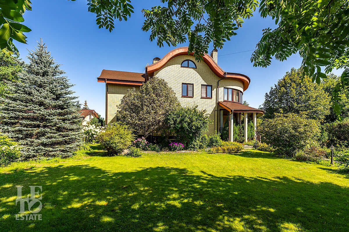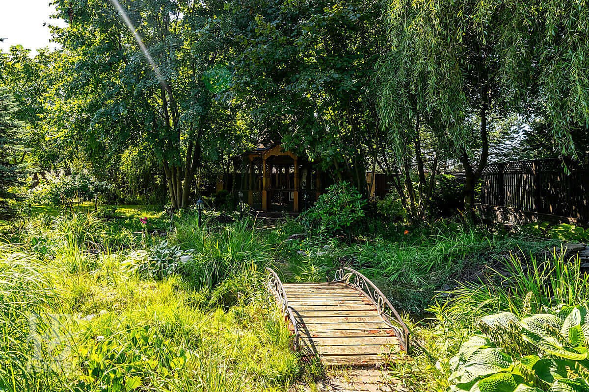 На участке выполнен ландшафтный дизайн, посажены лесные и плодовые деревья, кустарники, цветы, дорожки вымощены брусчаткой и природным камнем, установлено ландшафтное освещение. На участке площадью 27 соток расположен искусственный ручей с прудом и декоративной рыбой.