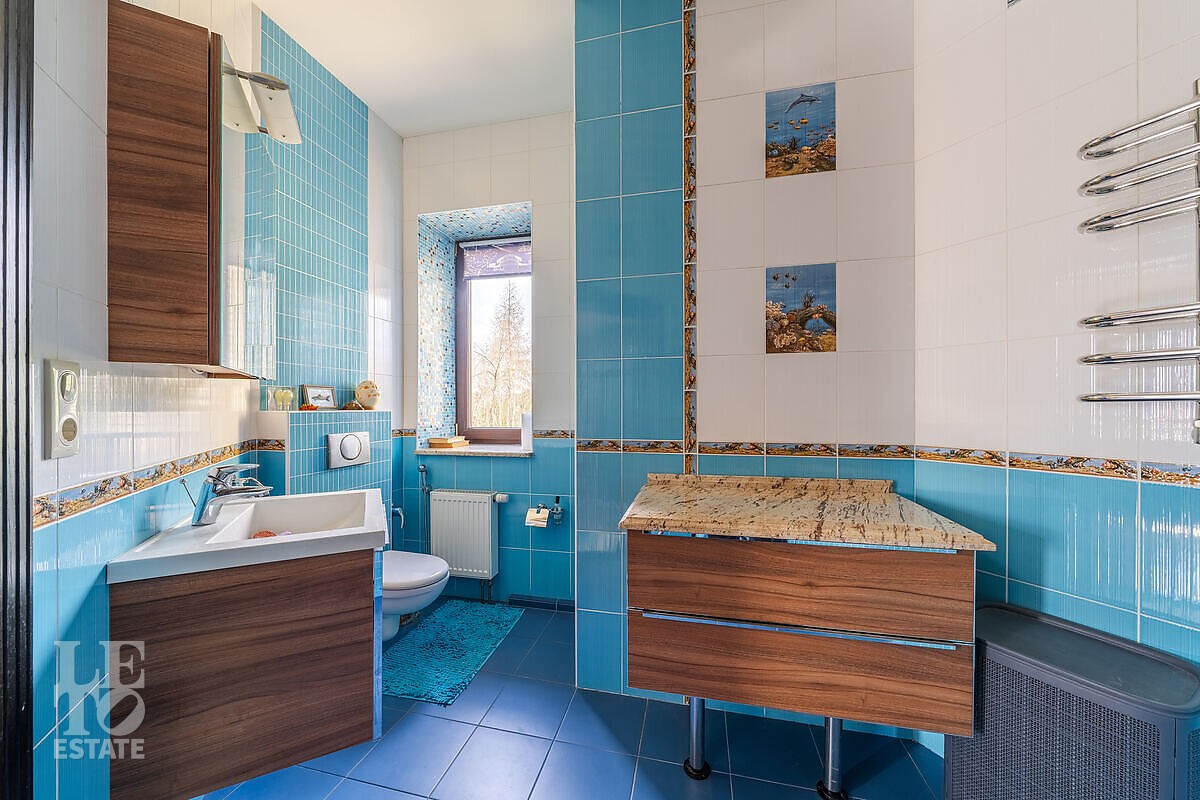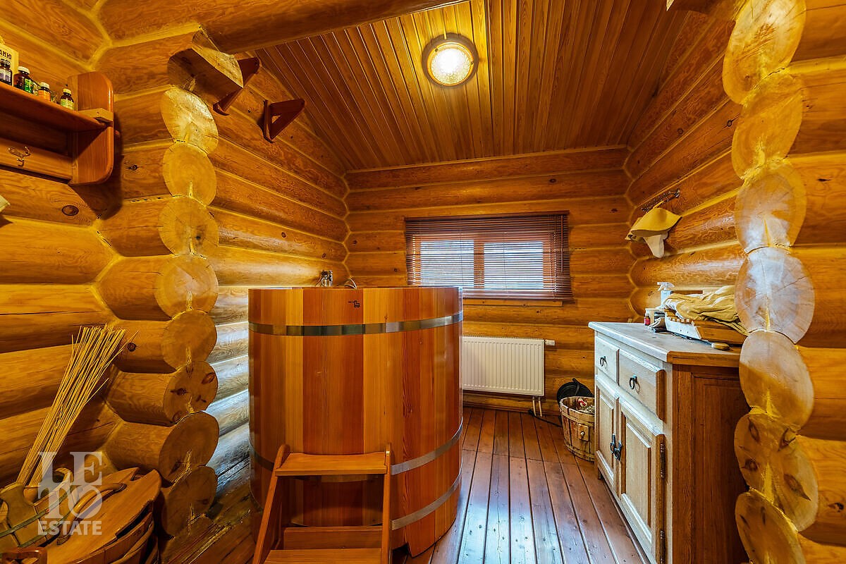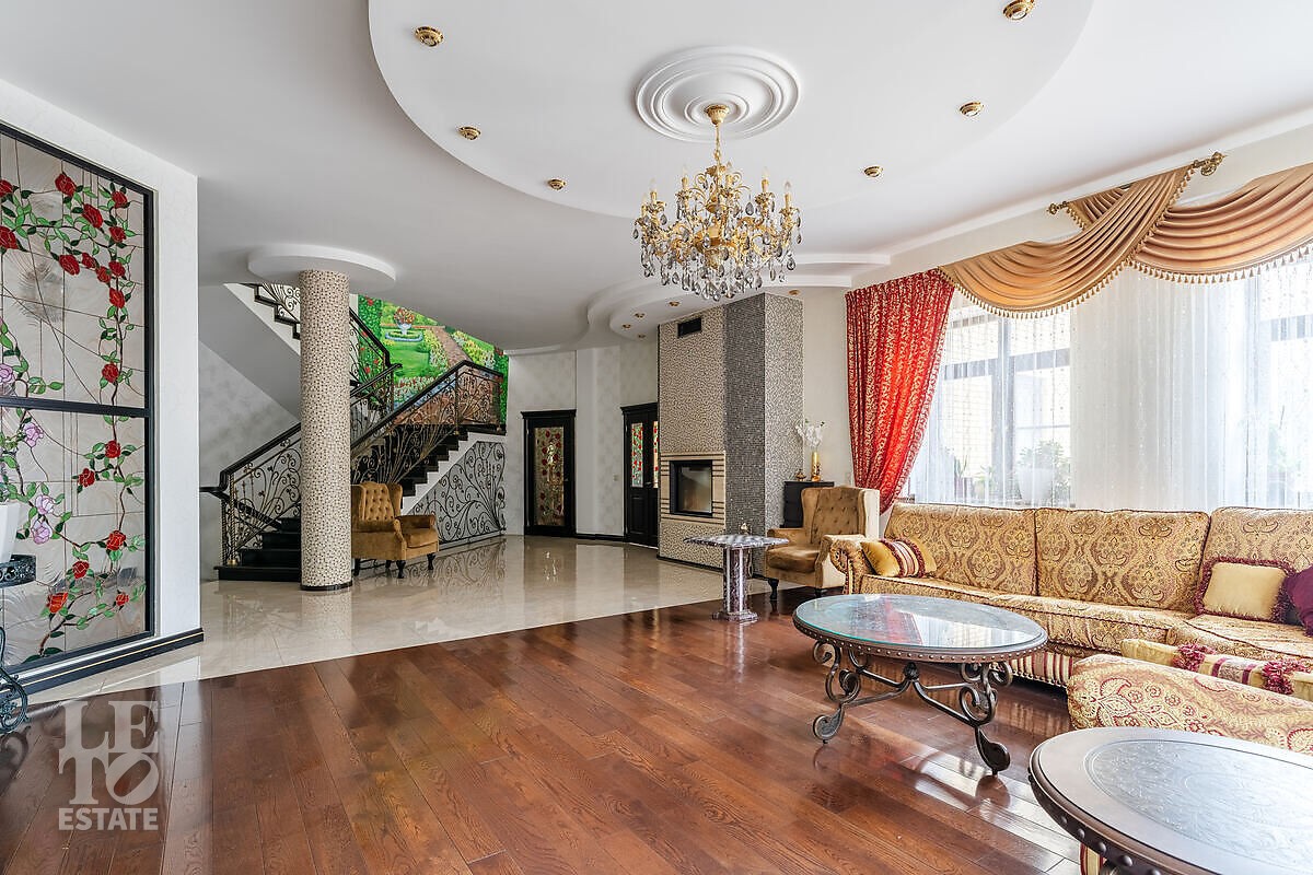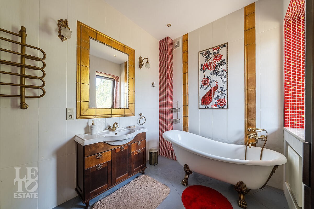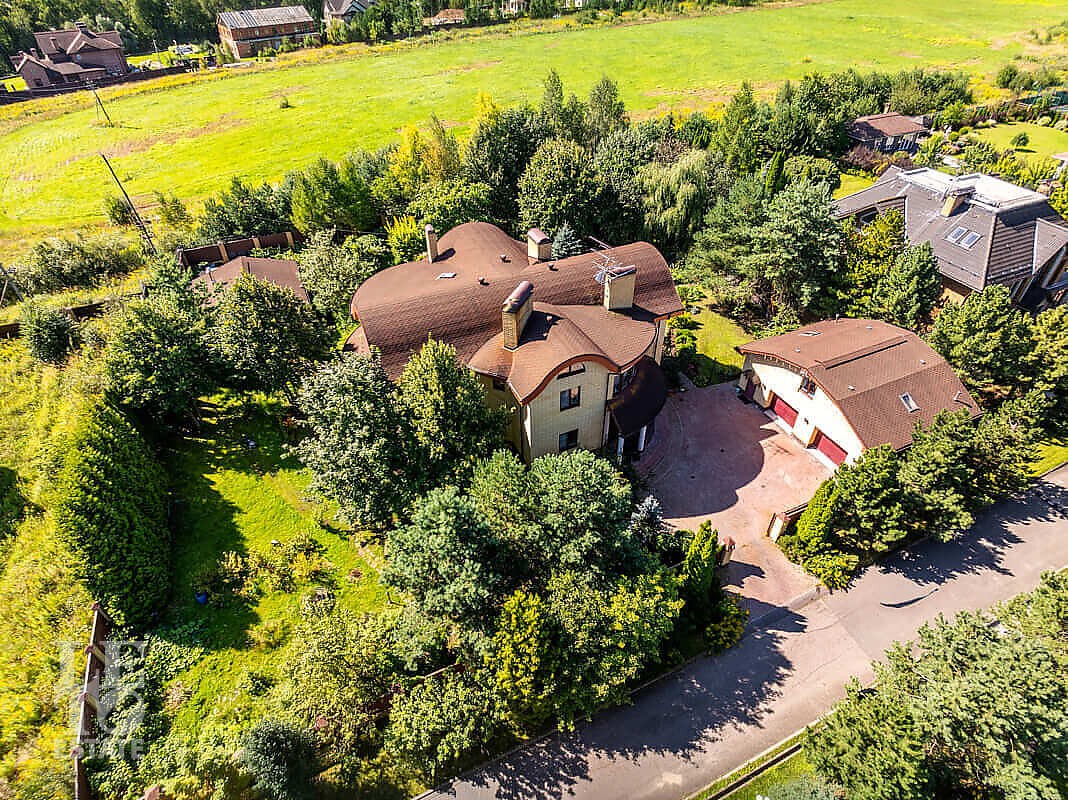 На участке выполнен ландшафтный дизайн, посажены лесные и плодовые деревья, кустарники, цветы, дорожки вымощены брусчаткой и природным камнем, установлено ландшафтное освещение. На участке площадью 27 соток расположен искусственный ручей с прудом и декоративной рыбой.