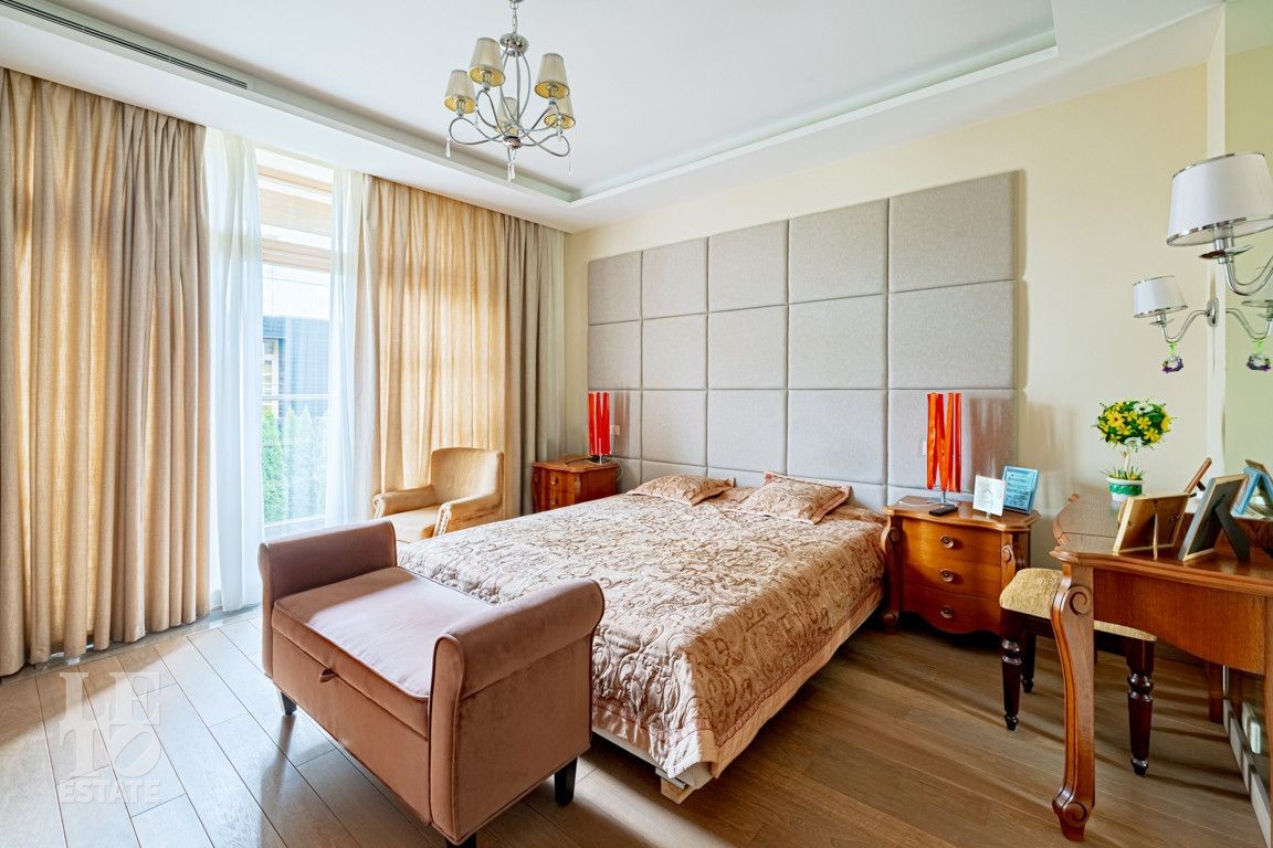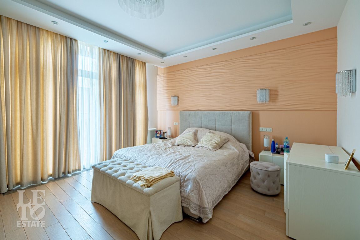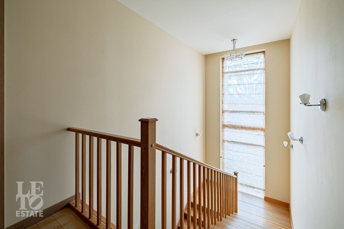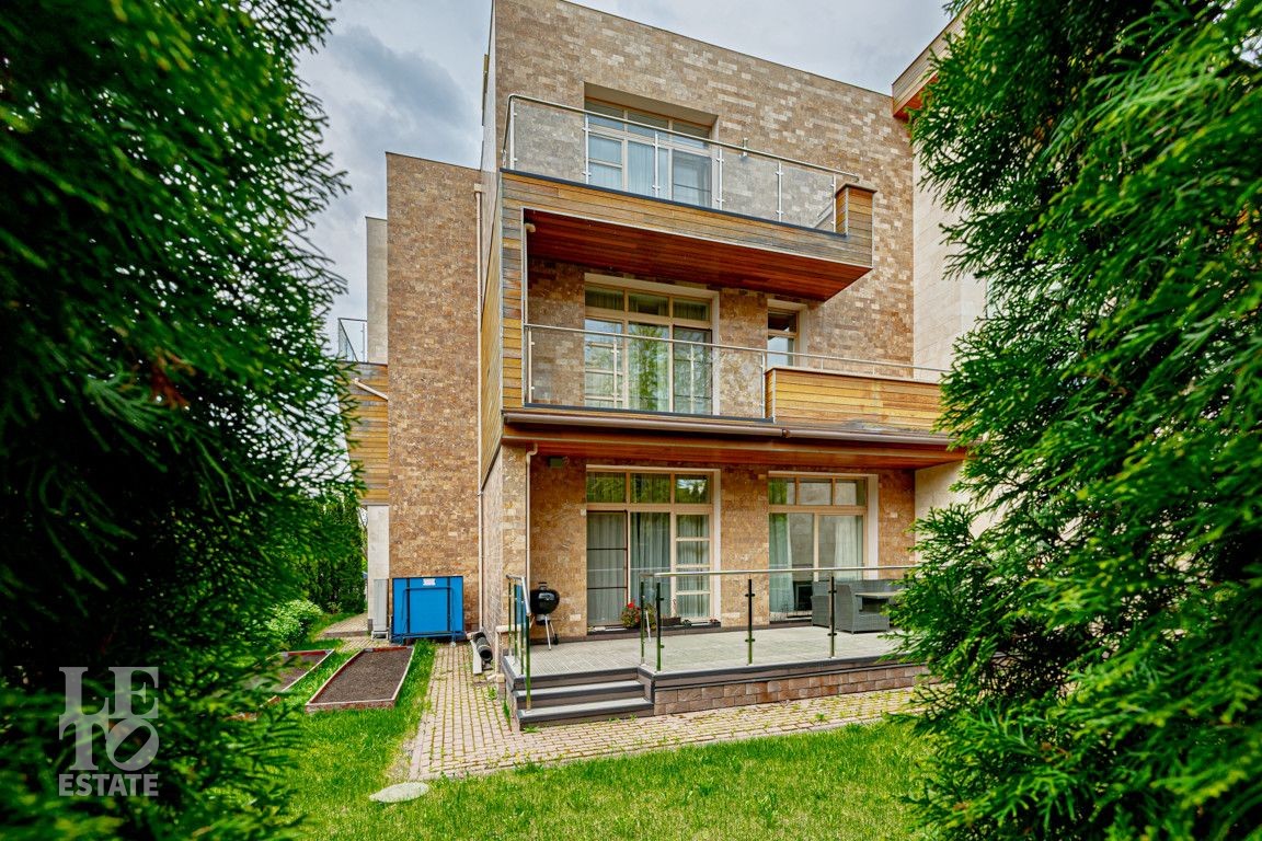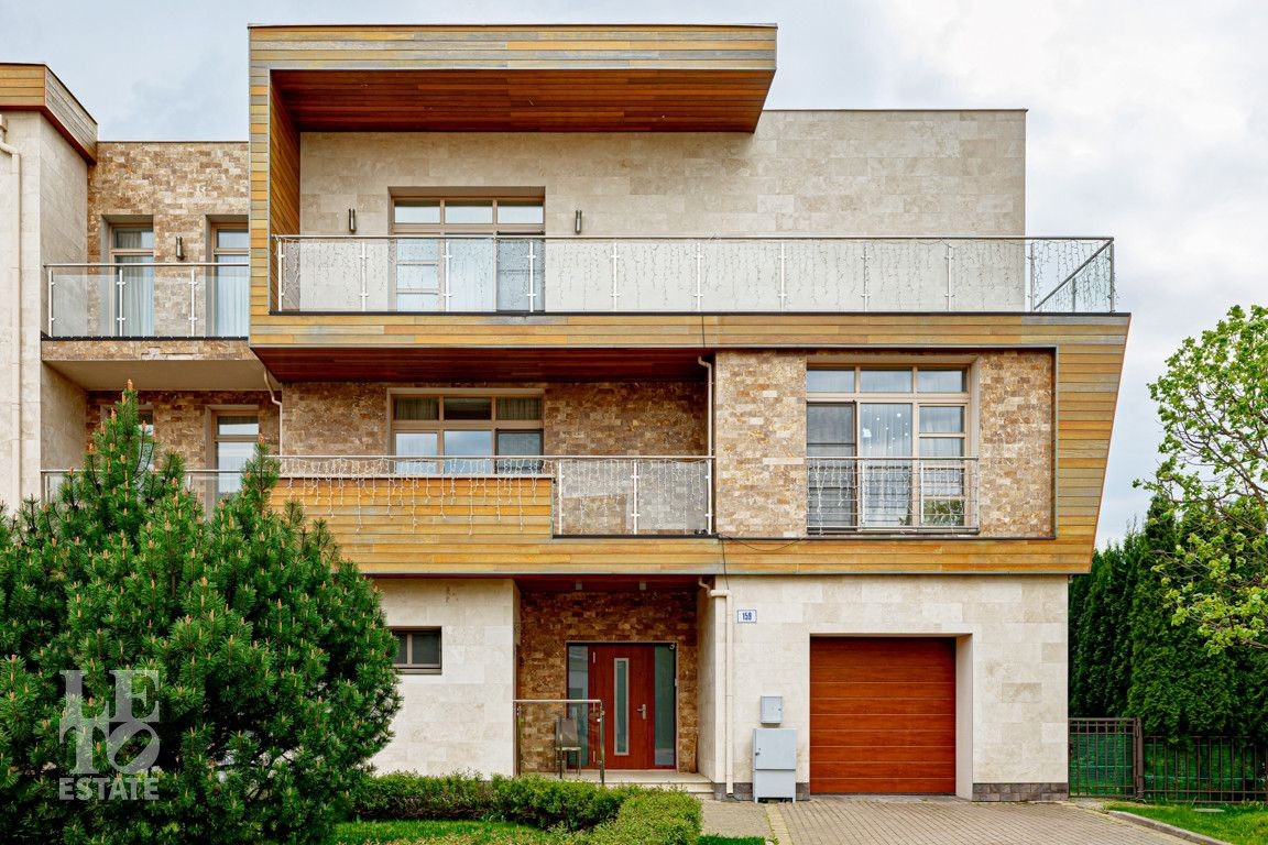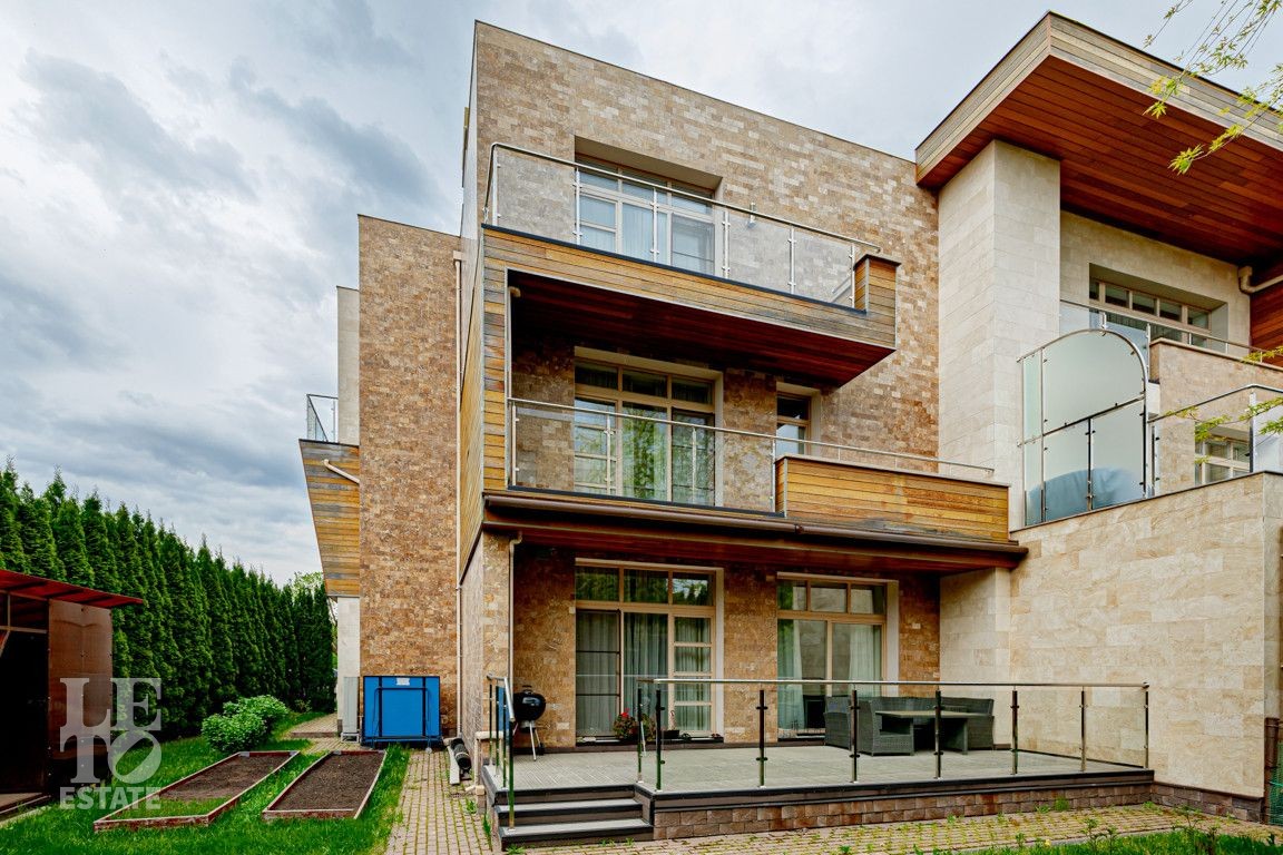Современная архитектурная концепция. Фасад облицова натуральным камнем и деревом. Большие панорамные окна ориентированы на три стороны. Во внутренней отделке - исключительно премиальные материалы, дорогая мебель, встроенная бытовая техника, сантехника.