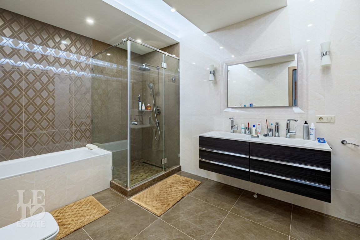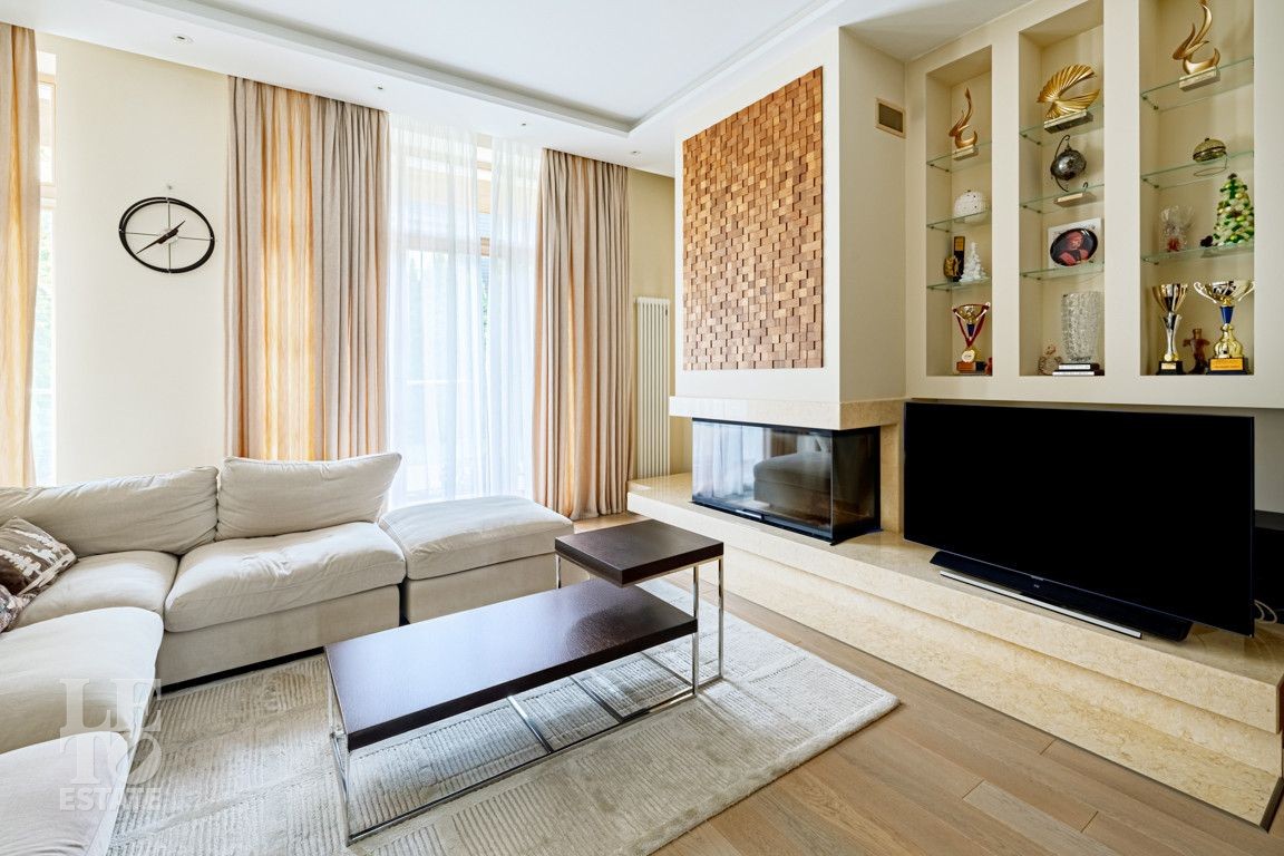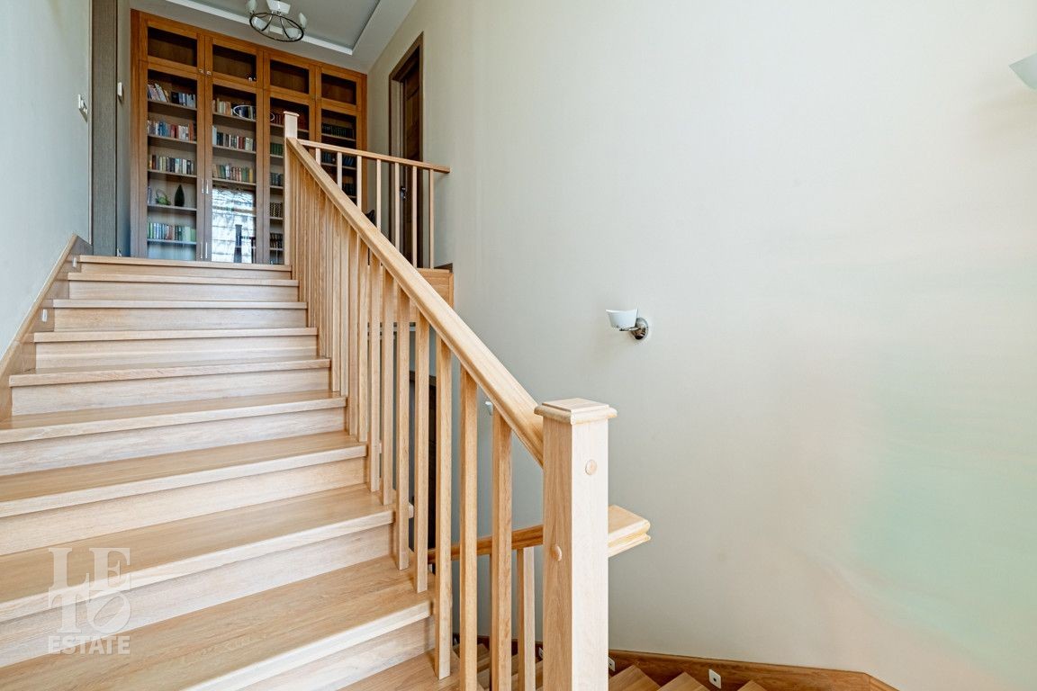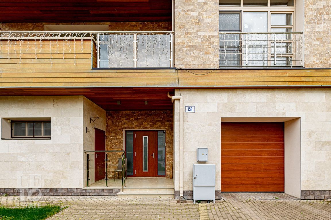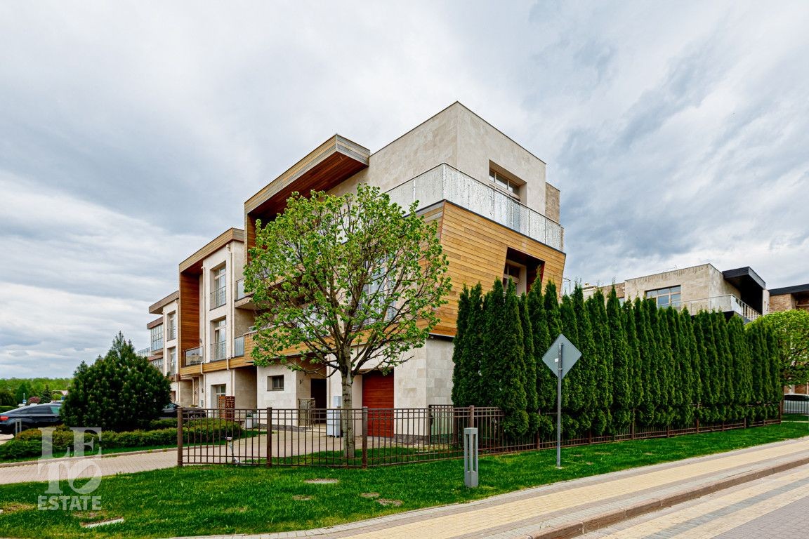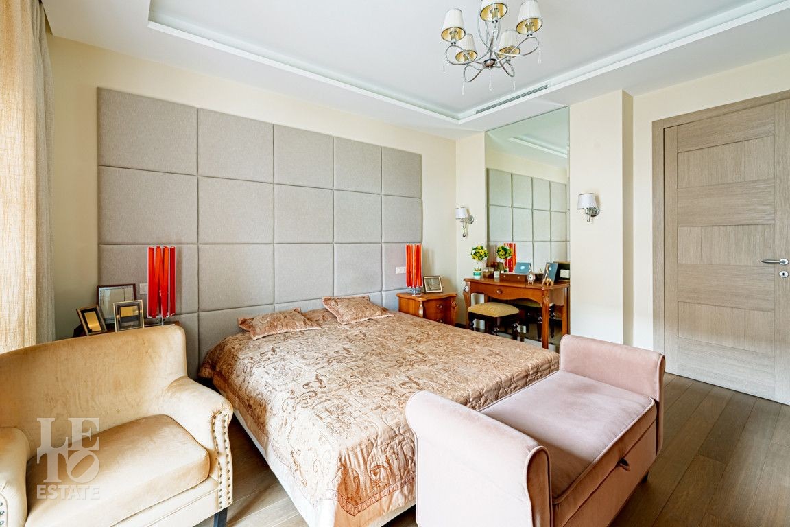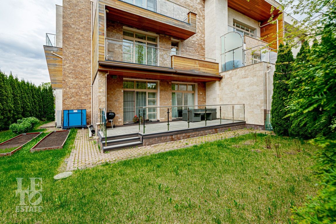 Современная архитектурная концепция. Фасад облицова натуральным камнем и деревом. Большие панорамные окна ориентированы на три стороны. Во внутренней отделке - исключительно премиальные материалы, дорогая мебель, встроенная бытовая техника, сантехника.