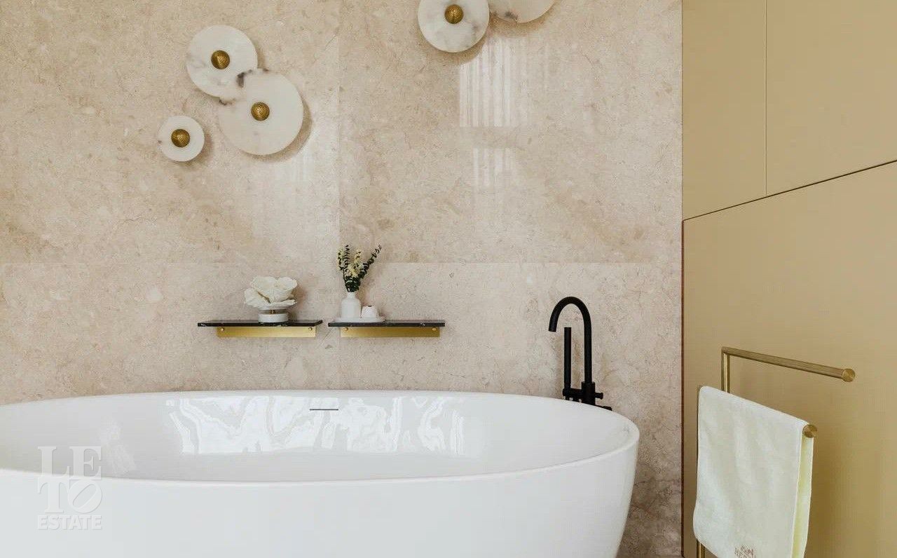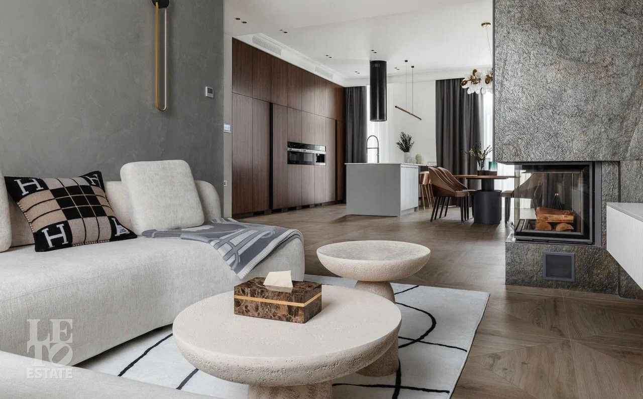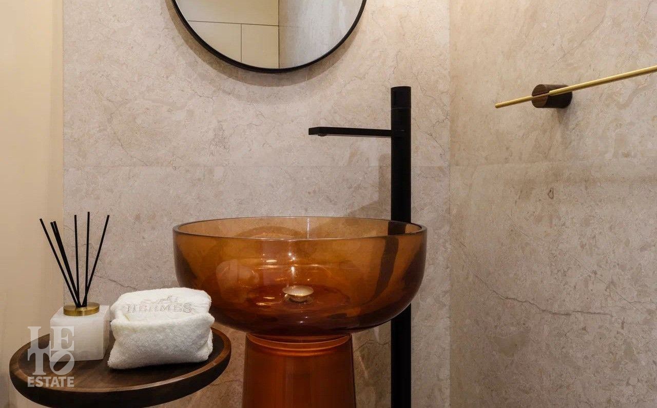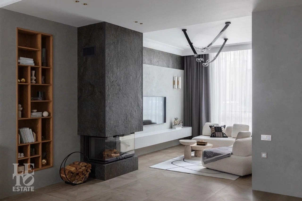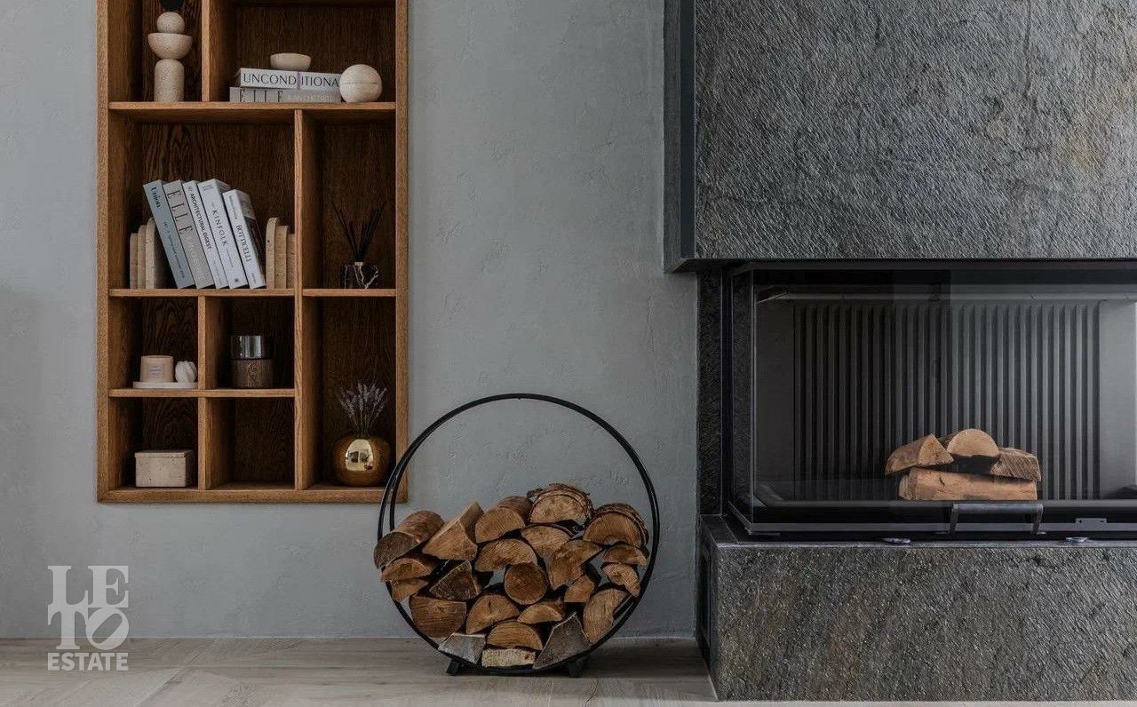В отделке использовались премиальные отделочные материалы: мрамор, дровяной камин облицован сланцем, столешница сделана из кварца, весь керамогранит в доме Parselanosa Group, отделка стен из ценных пород дерева.