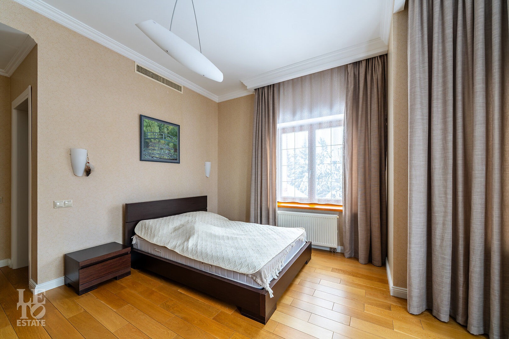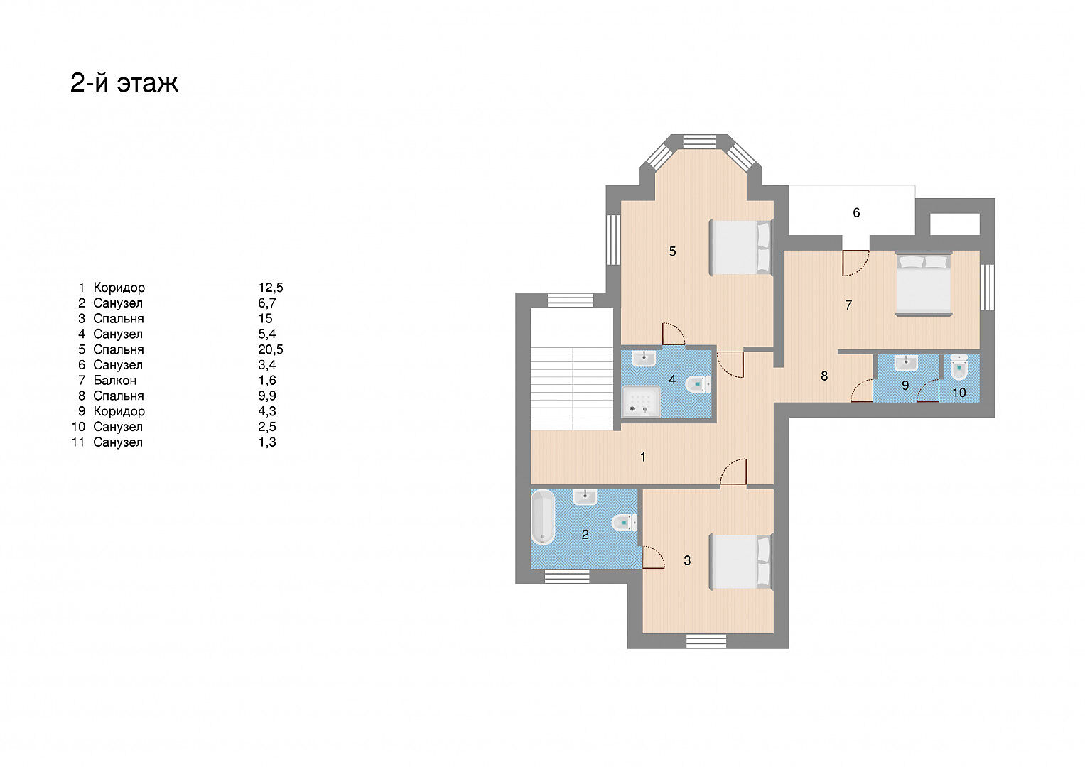 Второй этаж: спальня с ванной, санузлои и выходом на болкон, 2 спальни с собственными санузлами.