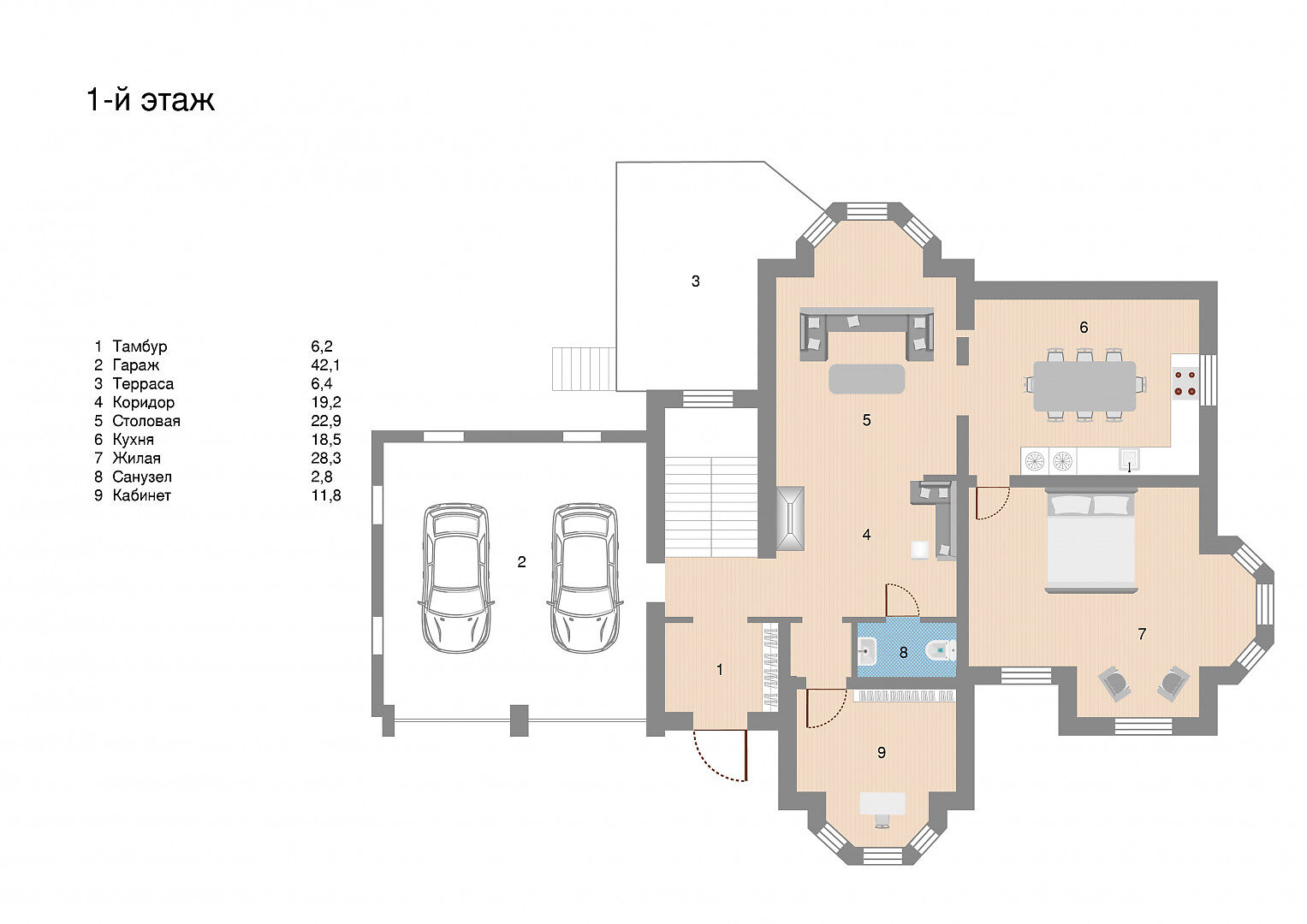Первый этаж: тамбур, гараж, терраса, столовая, кухня, спальня, санузел, кабинет.