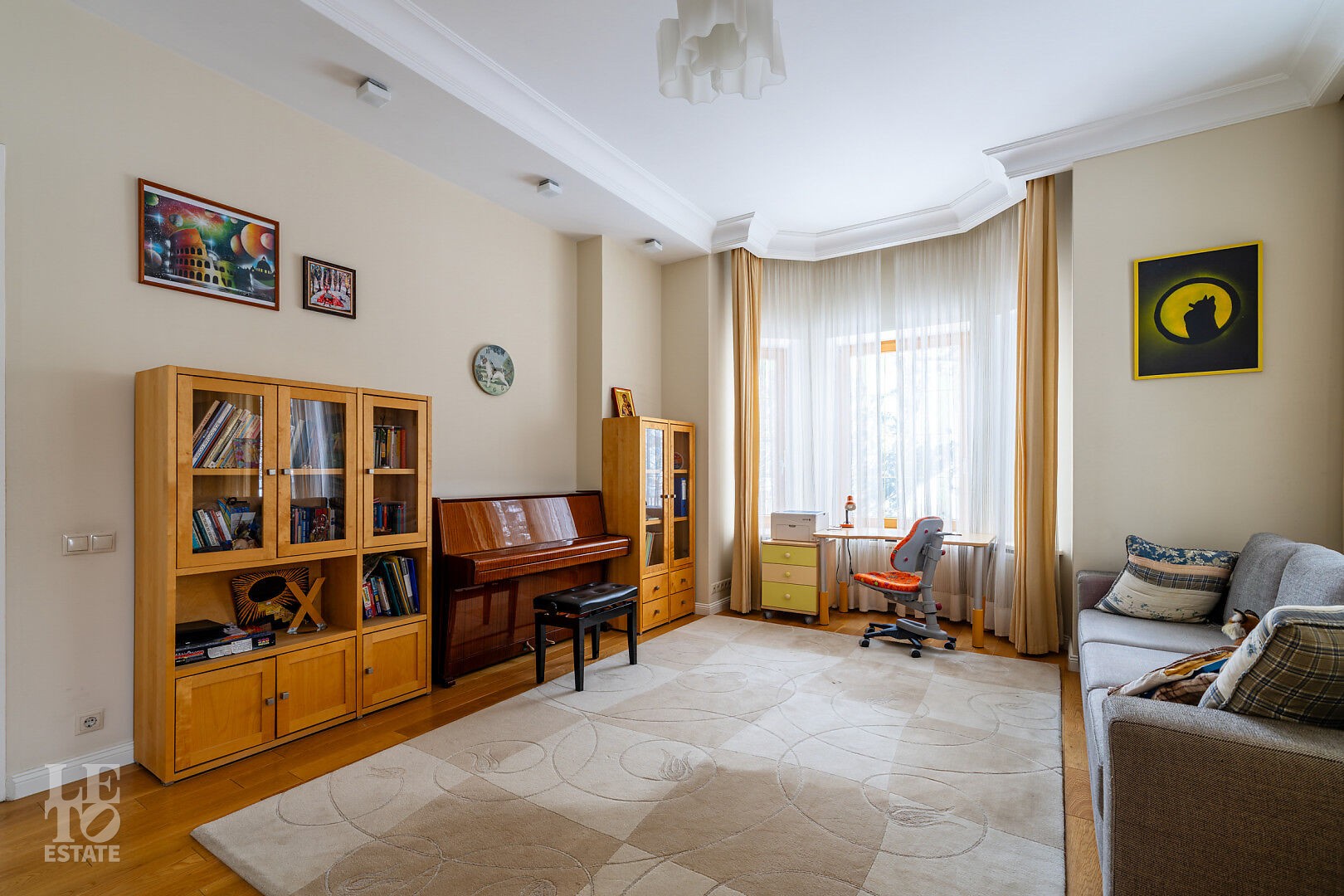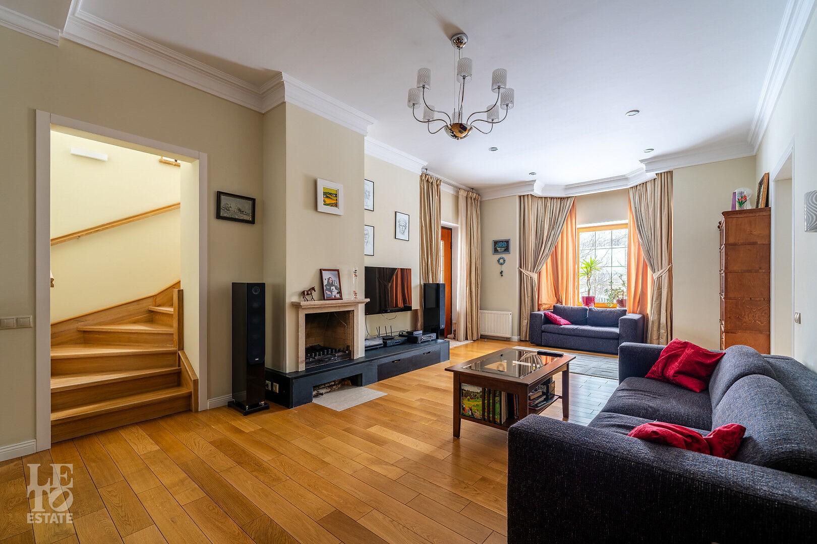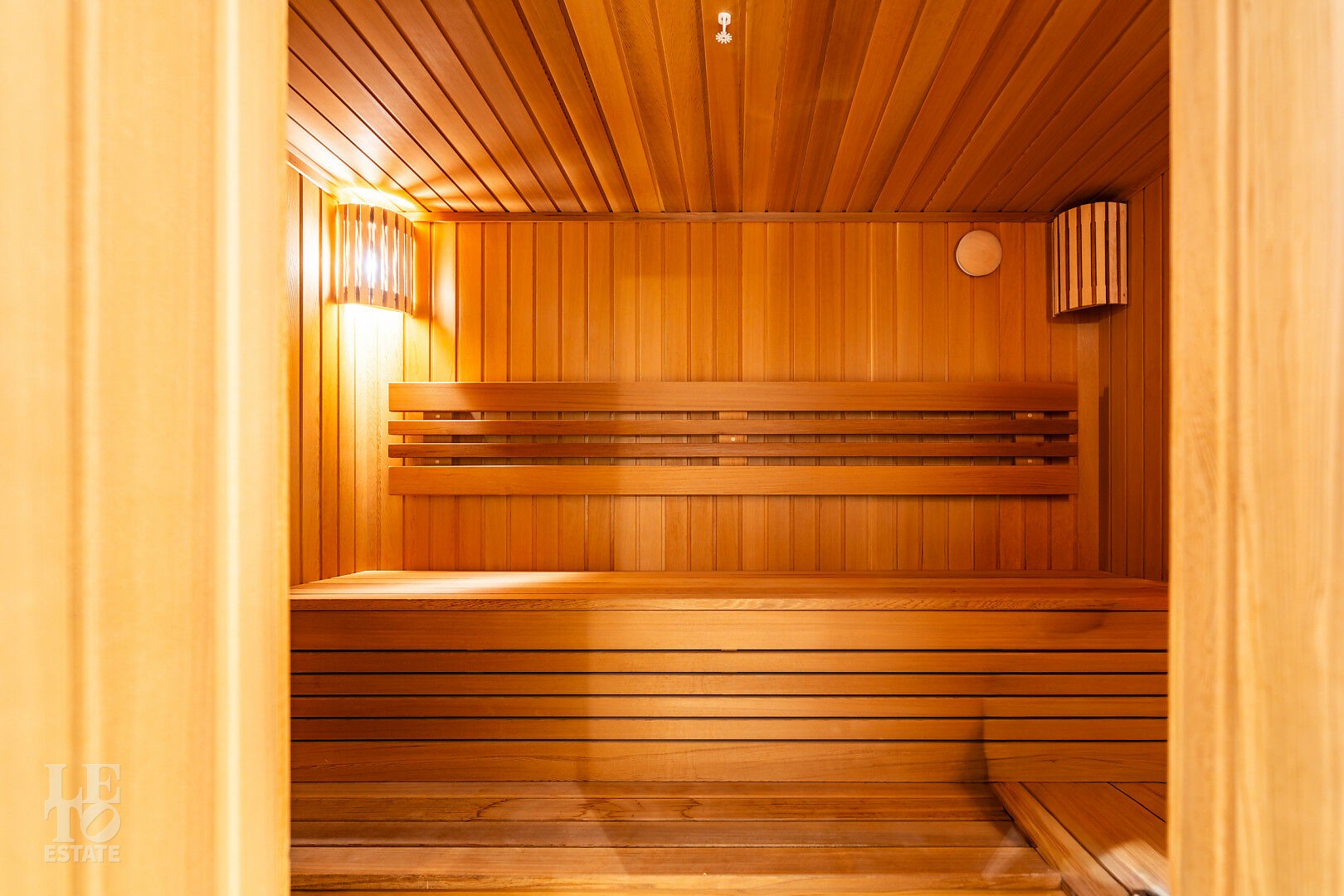 Общая площадь дома — 360 кв. м. Планировка продумана до мелочей: большая гостиная с зонами для ТВ и камина, полностью оборудованная кухня, кабинет и спальня на первом этаже. Пять спален, просторная зона для спорта и йоги, сауна и отдельная комната для персонала.