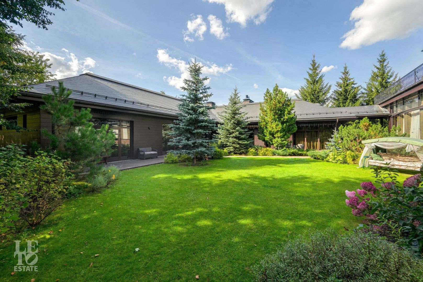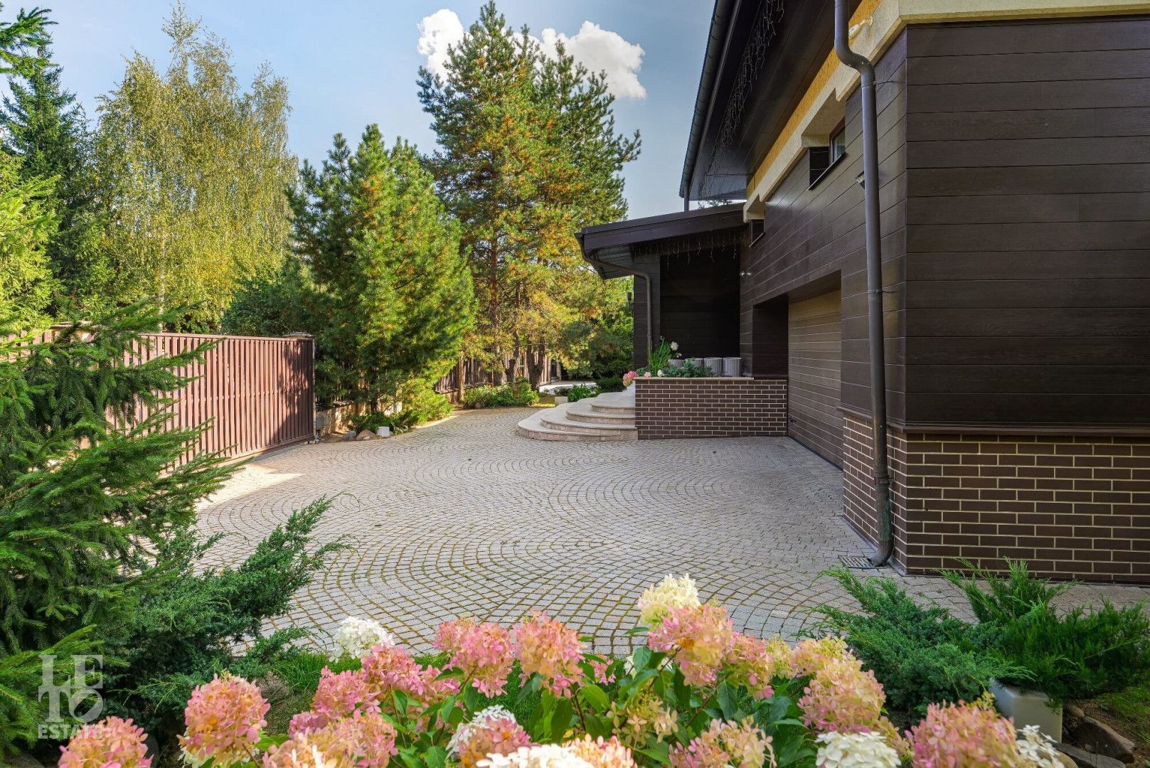 На живописной поляне растут пышные сосны и ели, декоративные кустарники и цветы, уложен газон, организовано несколько зон отдыха. Ровный солнечный участок, имеет 2 въезда и парковку перед домом на 6 автомобилей. По периметру растут взрослые деревья, вокруг дома вымощены дорожки и организовано вечернее освещение.