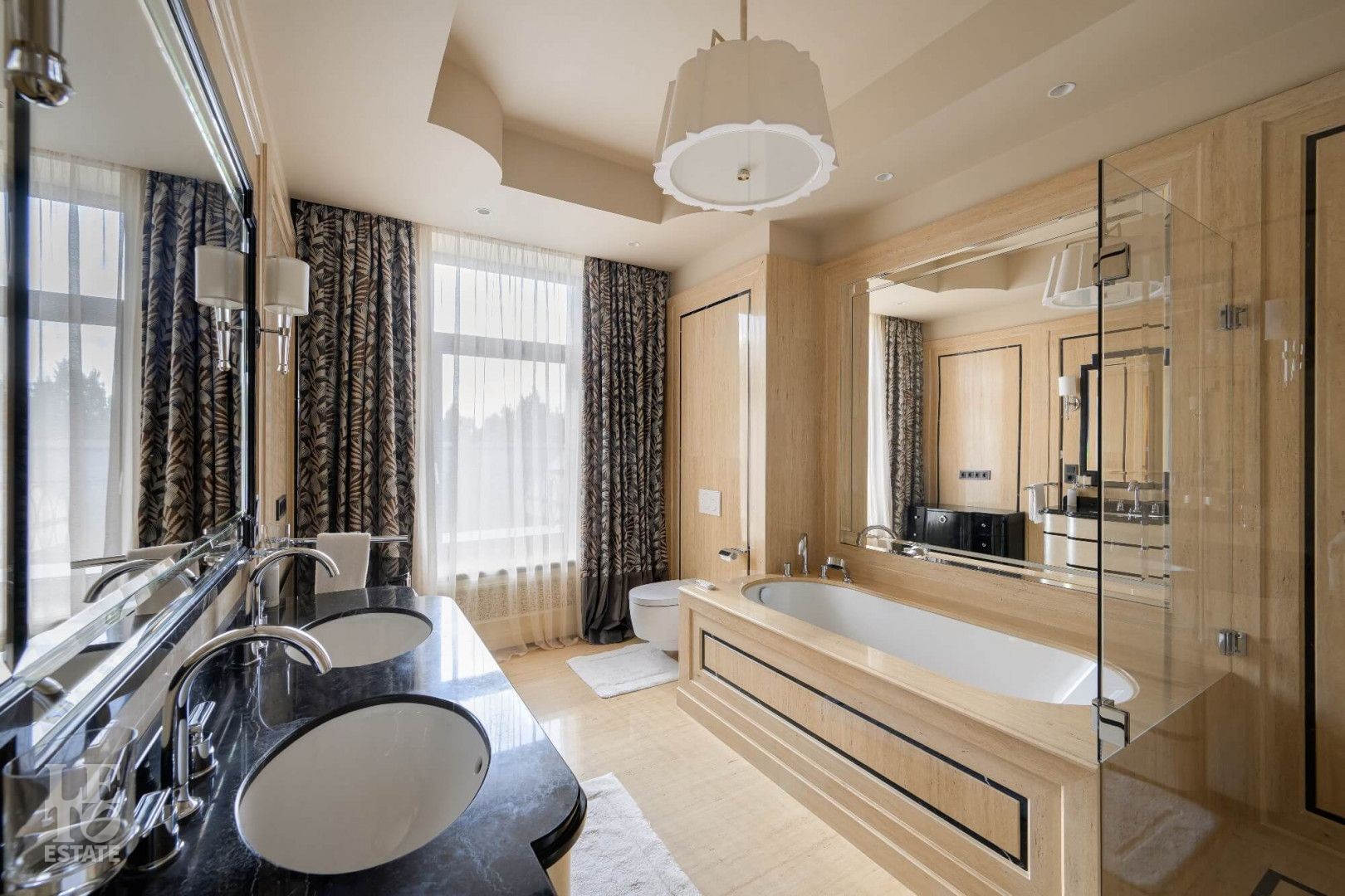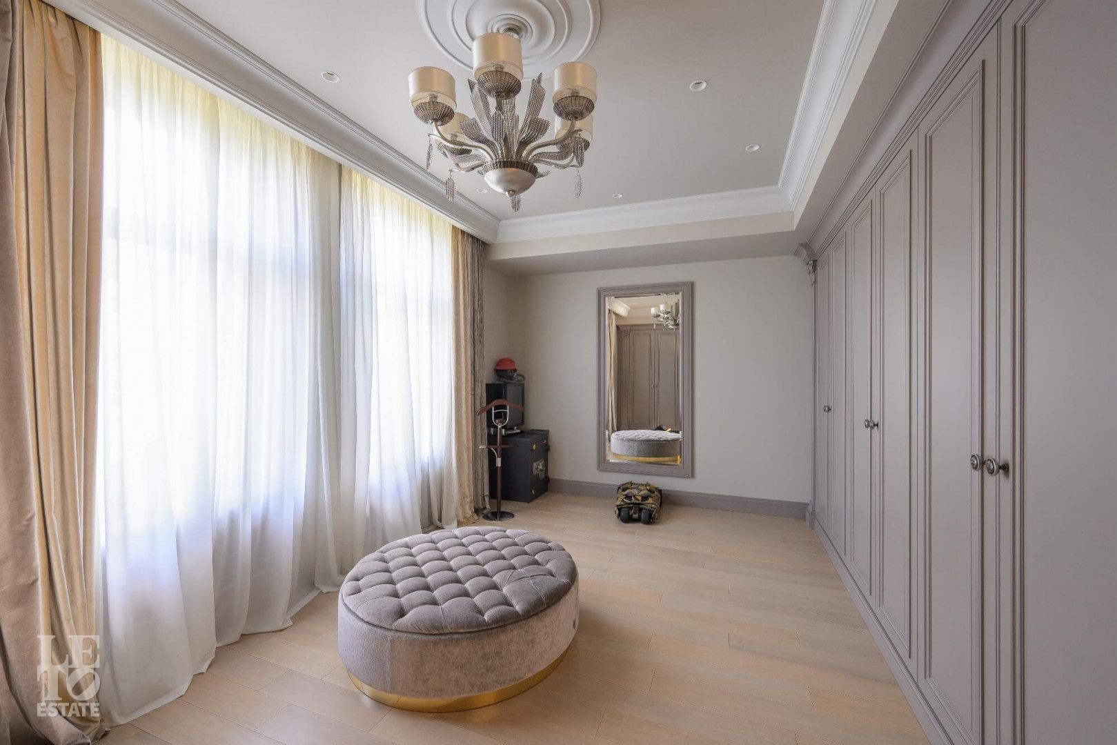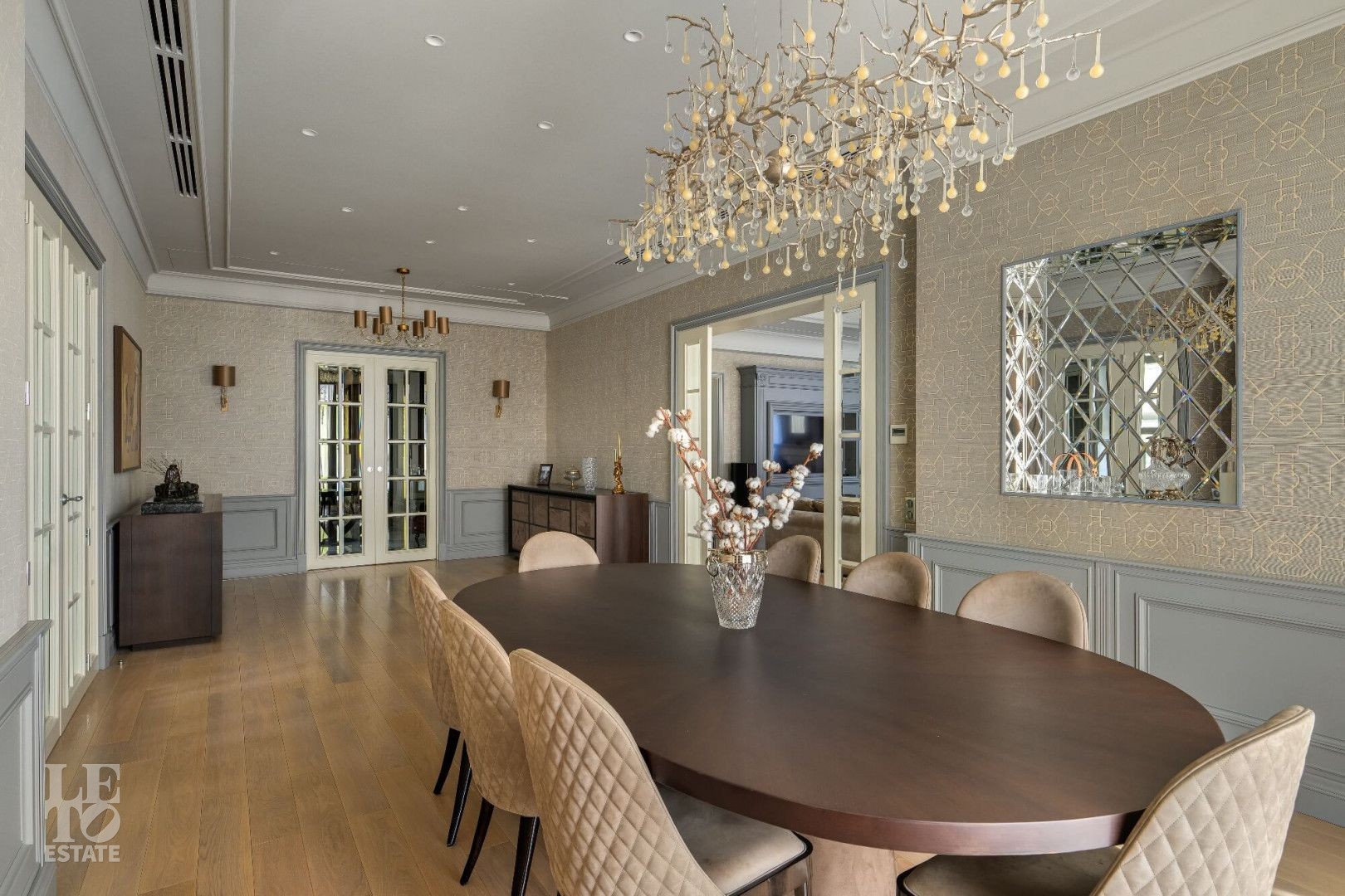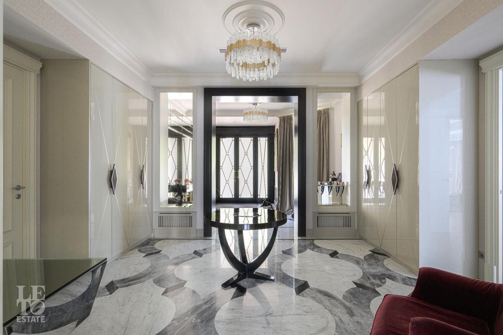 Интерьер выполнен в современном классическом стиле с искусно подобранными с душой предметами интерьера: стильными люстрами и светильниками, зеркалами, эксклюзивными аксессуарами.