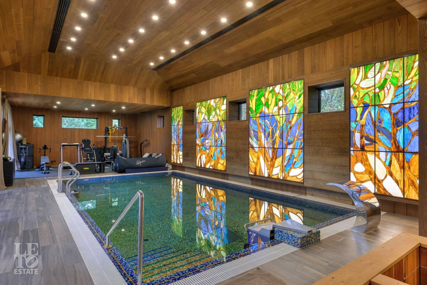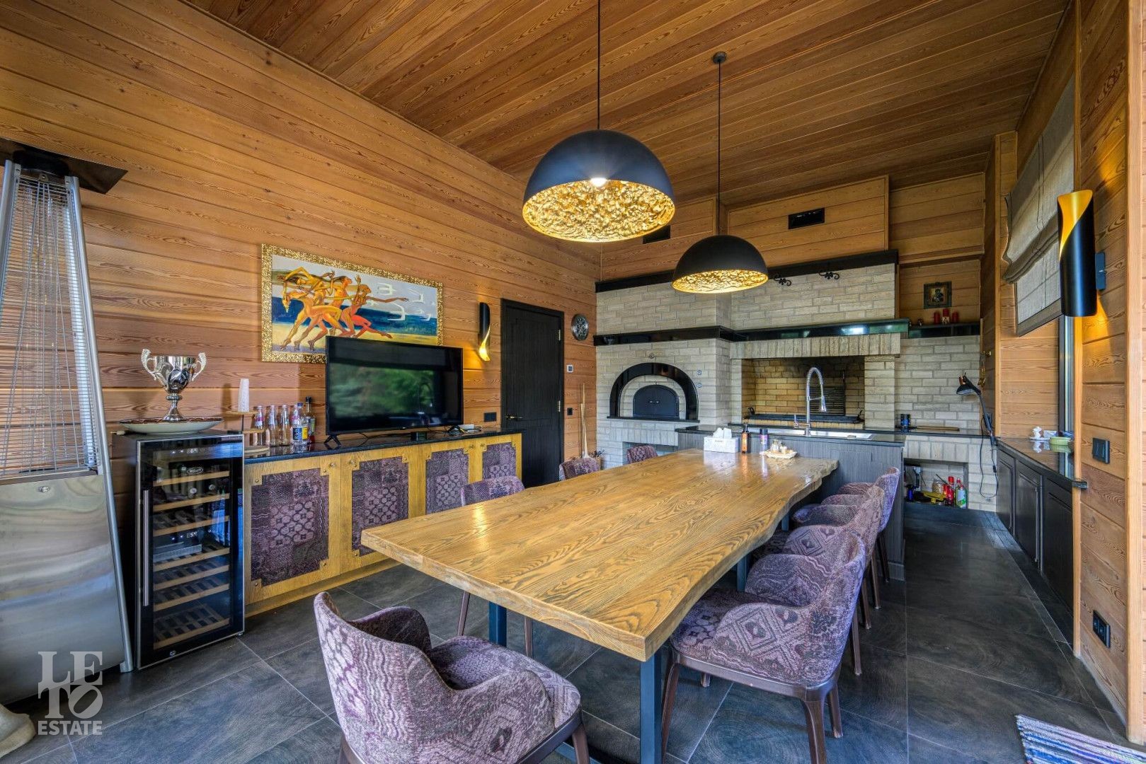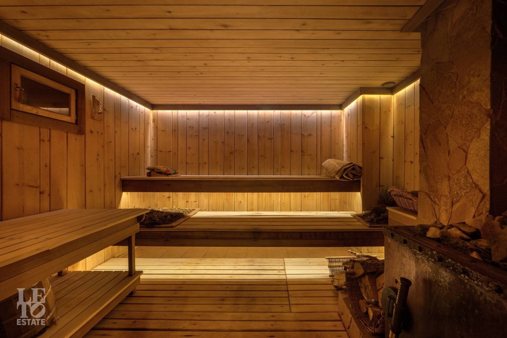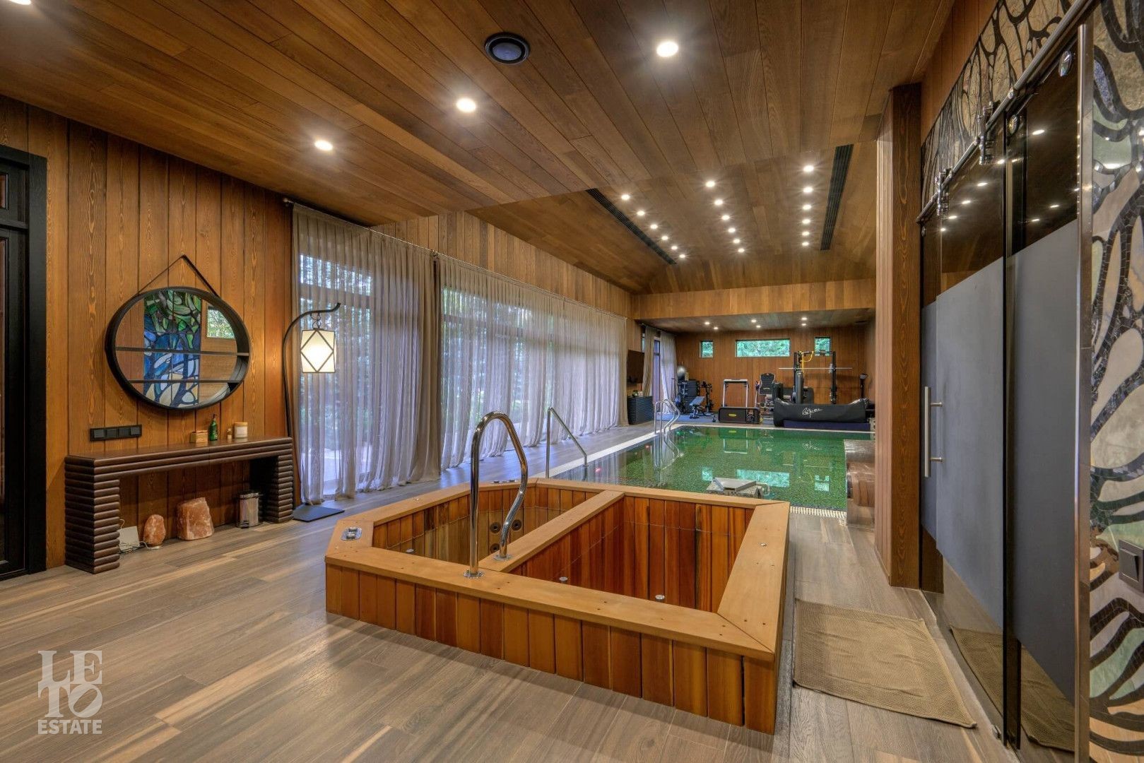 Первый этаж: бассейн 9*4 м с противотоком, джакузи, русская баня на дровах, хаммам, две купели, раздевалка с душевой, комната отдыха с камином, помещение под барбекю и большая терраса на улице.