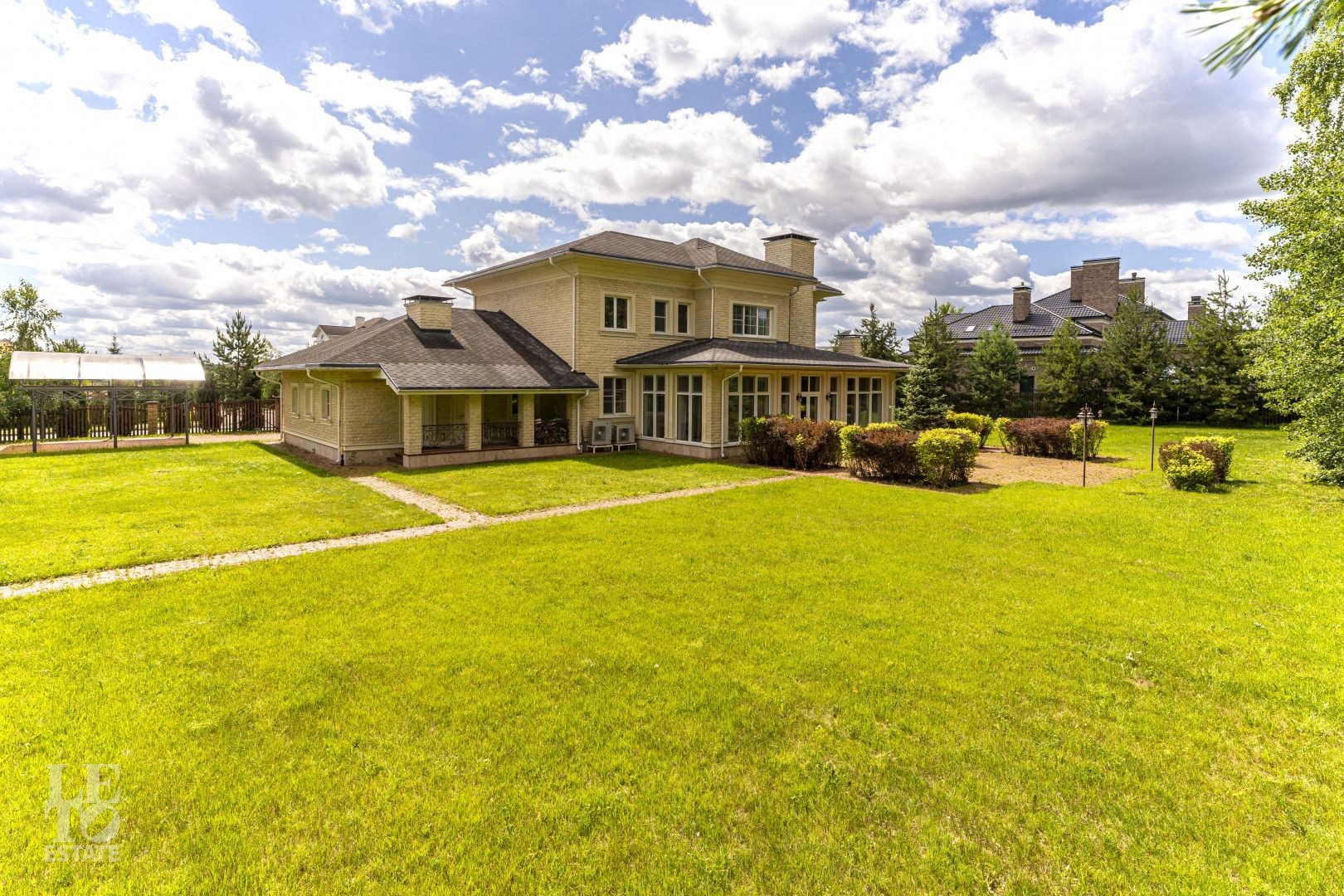 На участке 30 соток растут декоративные кустарники и деревья. Сделан дренаж, установлено освещение, вымощены дорожки. Участок полностью огорожен, установлены ворота с электроприводом.