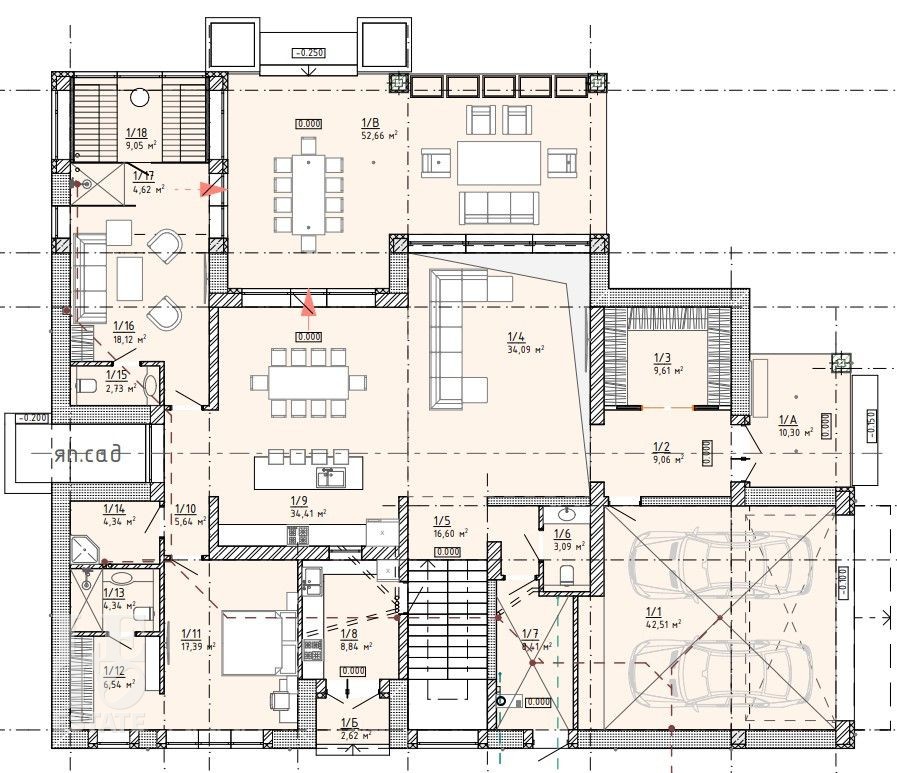 План 1 этажа: гараж, тамбур, кухня-столовая с вторым светом, гостиная, гардеробная, с\у, мастер-спальня, кабинет, техническая кухня, тех. помещение, кладовая.
