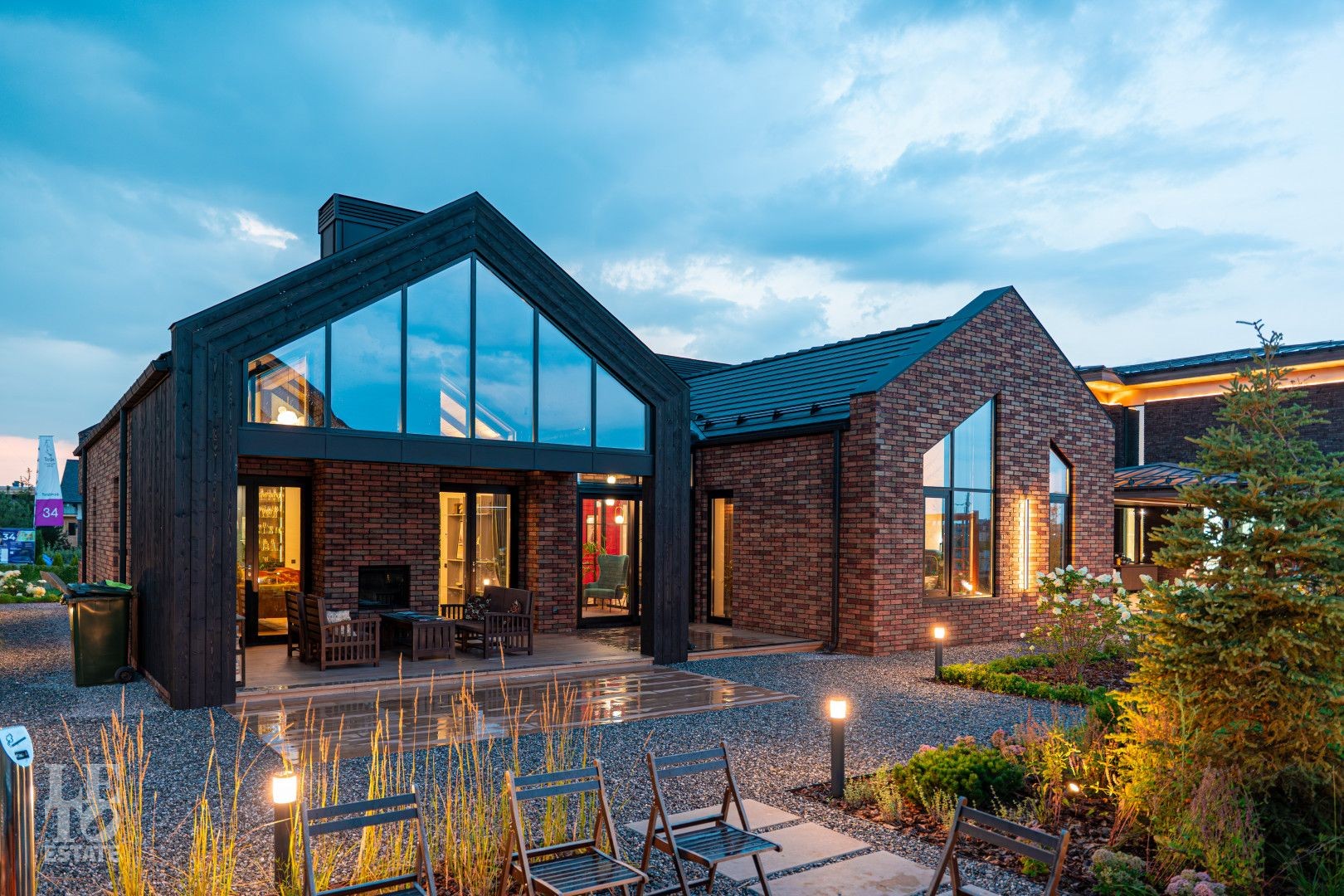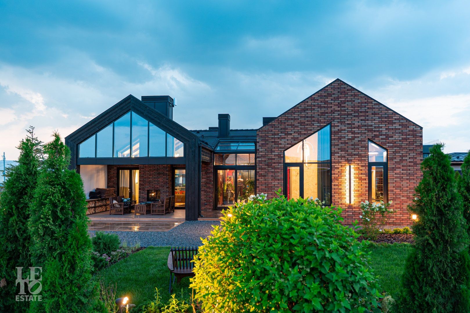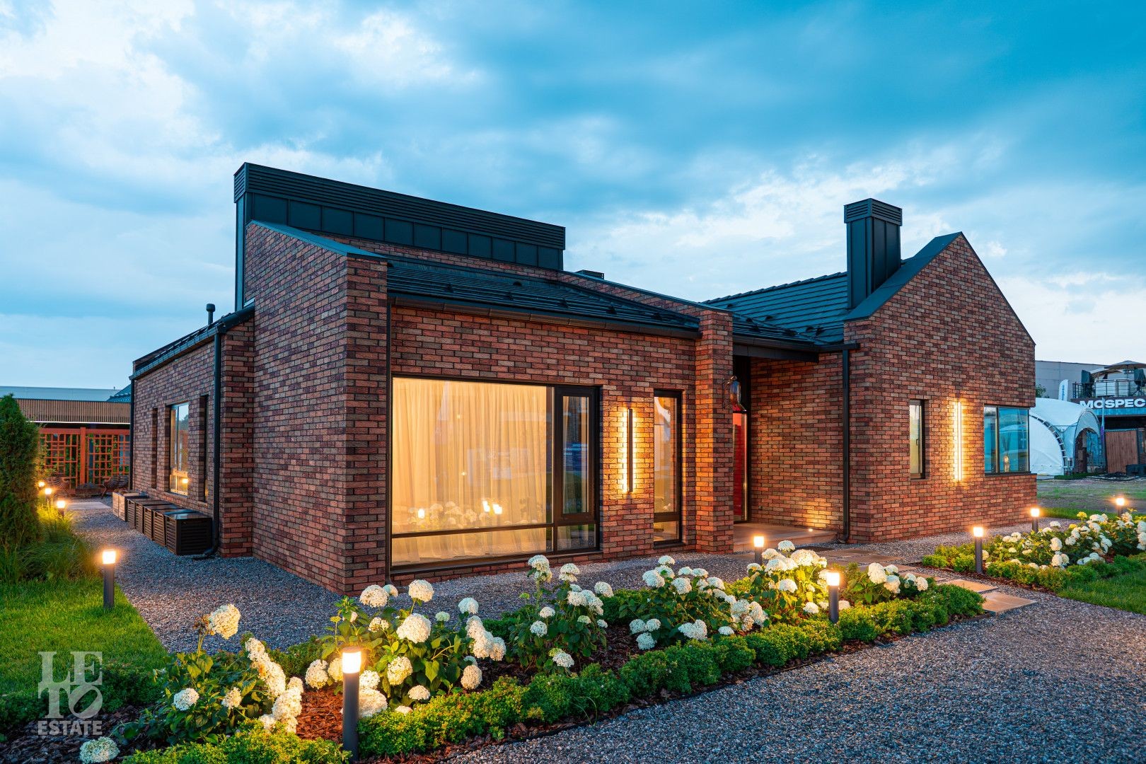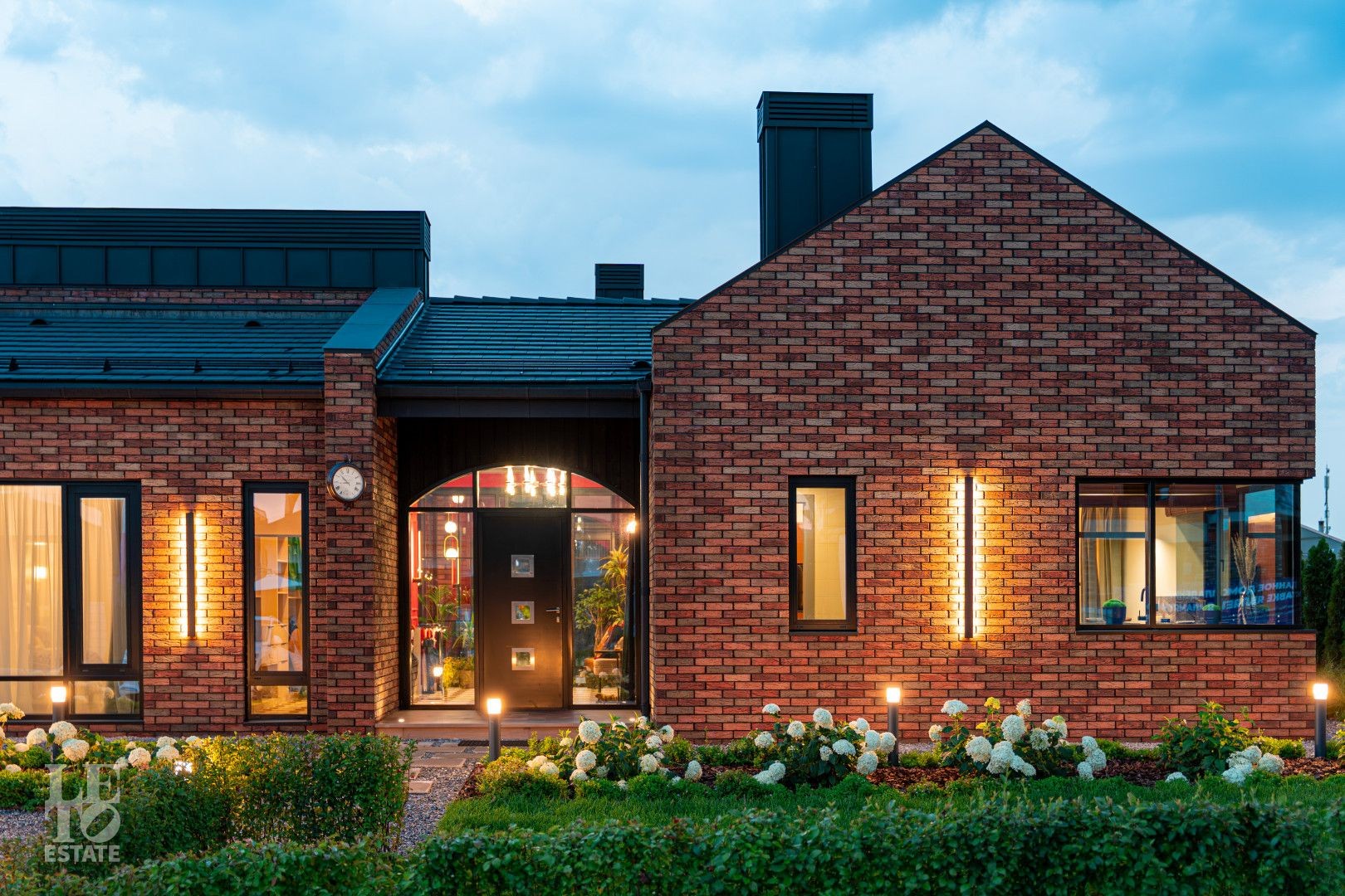 Архитектурный шедевр, в котором хочется жить. Фасад дома, одетый в уникальную кладку из трех оттенков кирпича Faber-Jar, играет объемом и глубиной, создавая неповторимый образ английского стиля. Его визитная карточка — грандиозный витраж и панорамное остекление, которое стирает границу между изысканным интерьером и природой вашего сада.