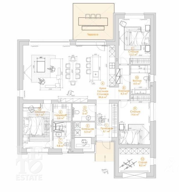 Кухня-гостиная, две спальни, мастер-спальня с су и гардеробной, с\у, терраса, котельная.