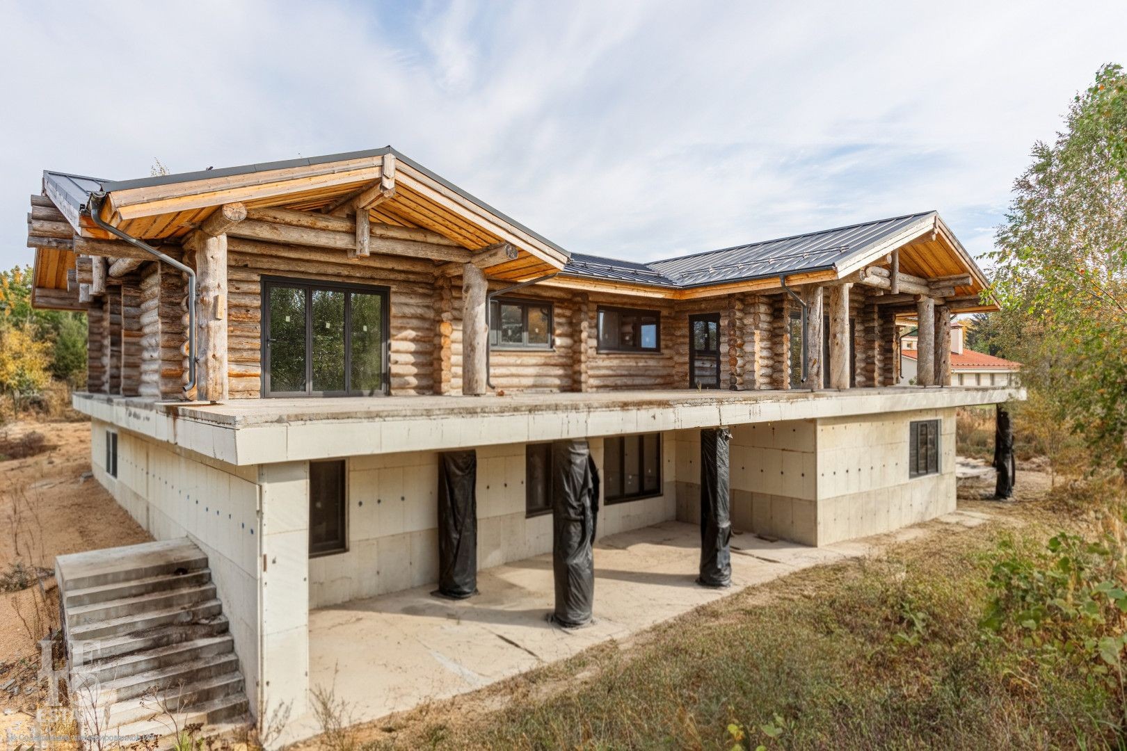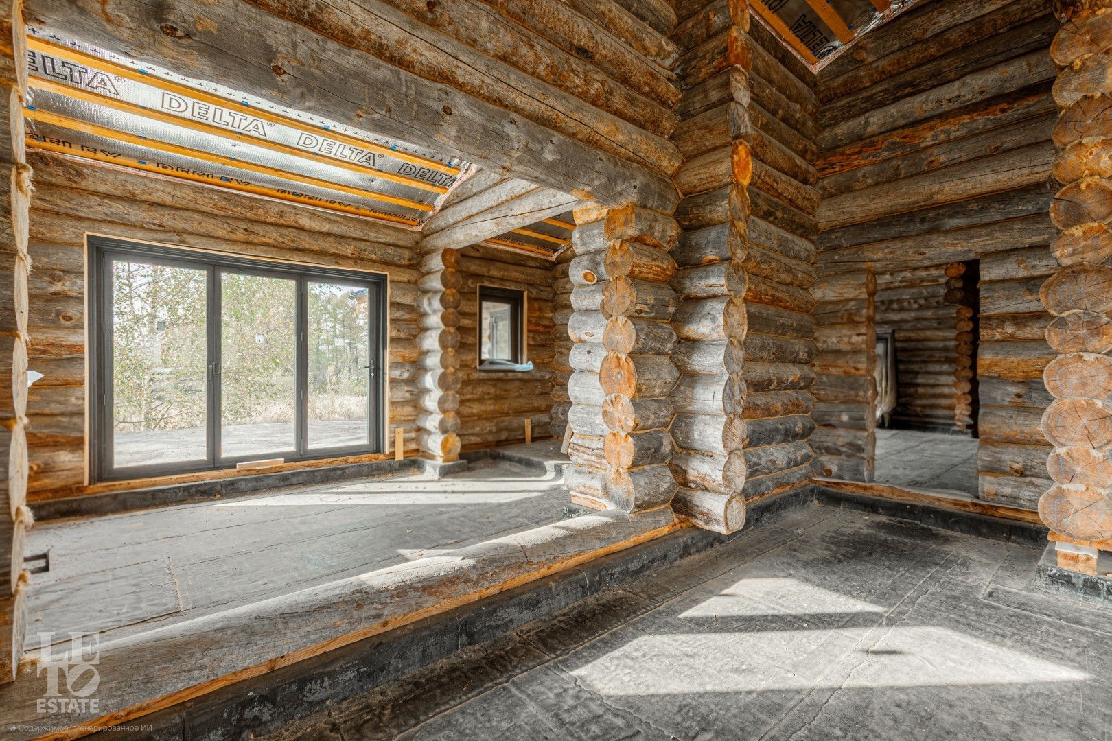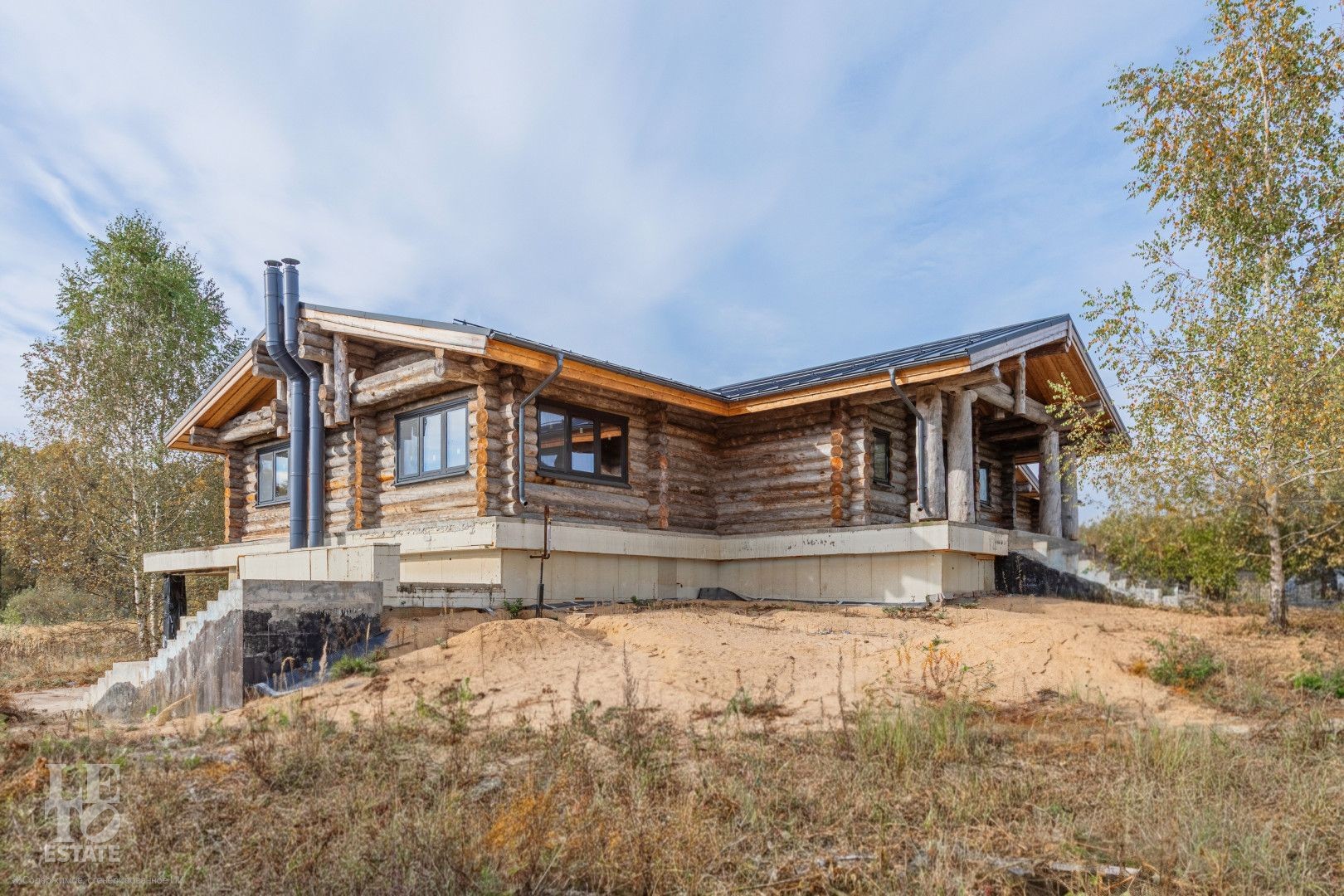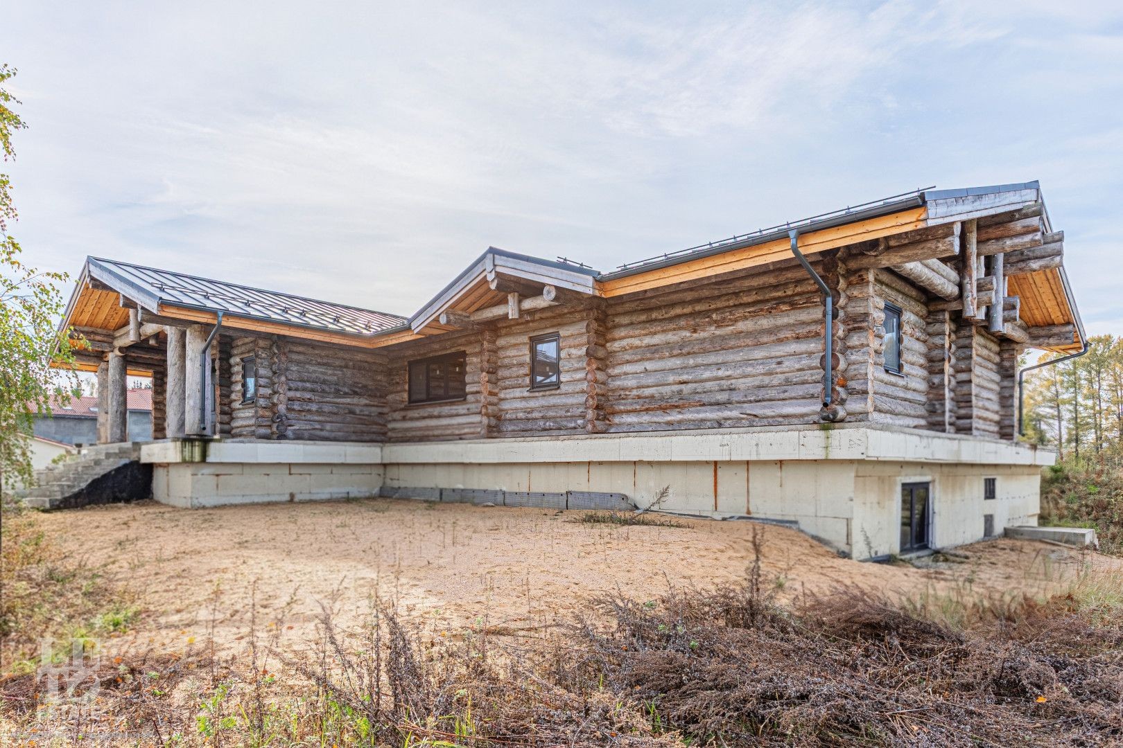 Основная часть дома (первый этаж) возвышается над основательным монолитным цокольном этажом высотой 4 метра. Первый этаж выполнен из сухостойной сосны, привезенной из Карелии компанией ARTKELO. Натуральный цвет дерева подчеркивает текстуру и безупречность материала.