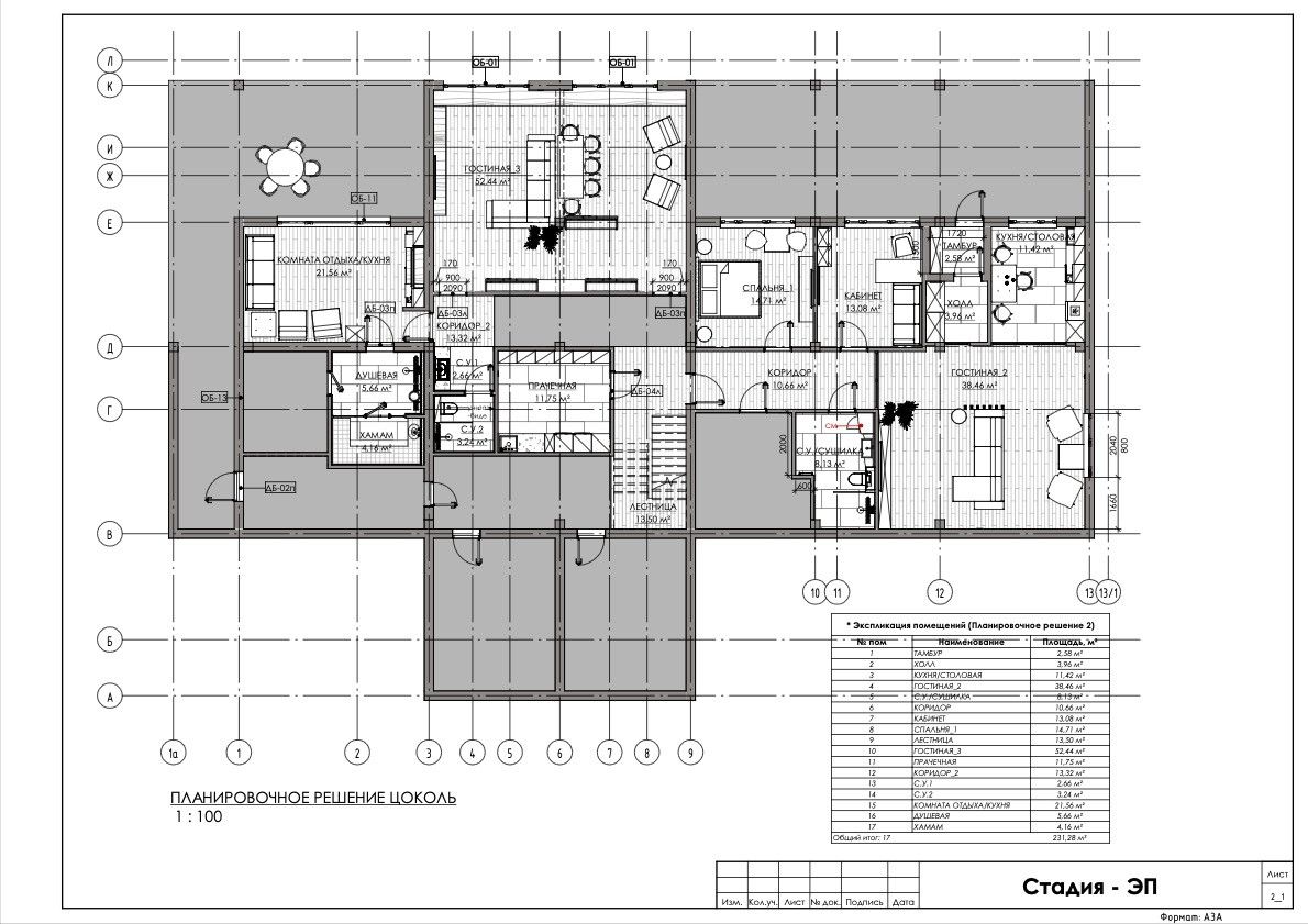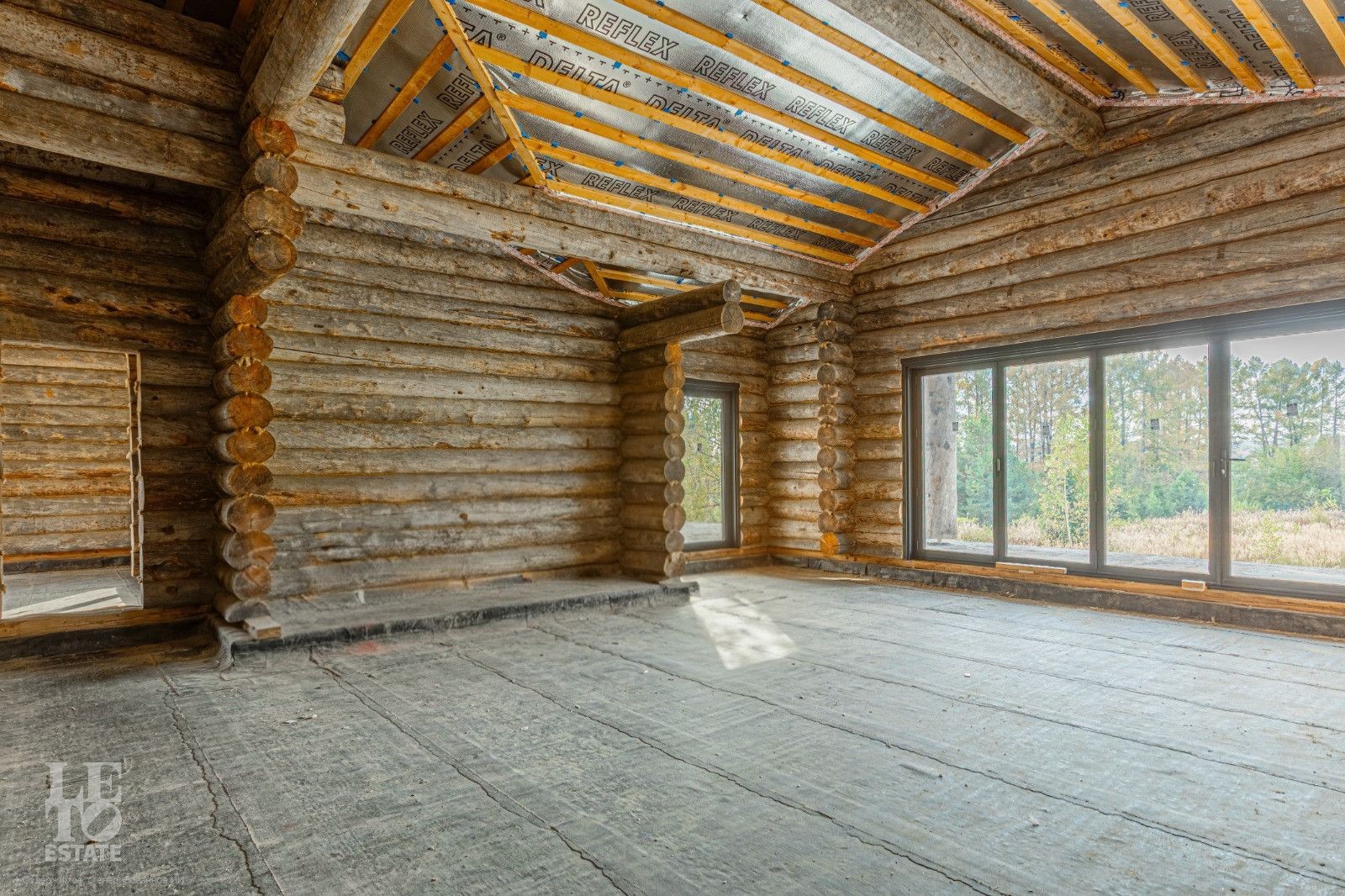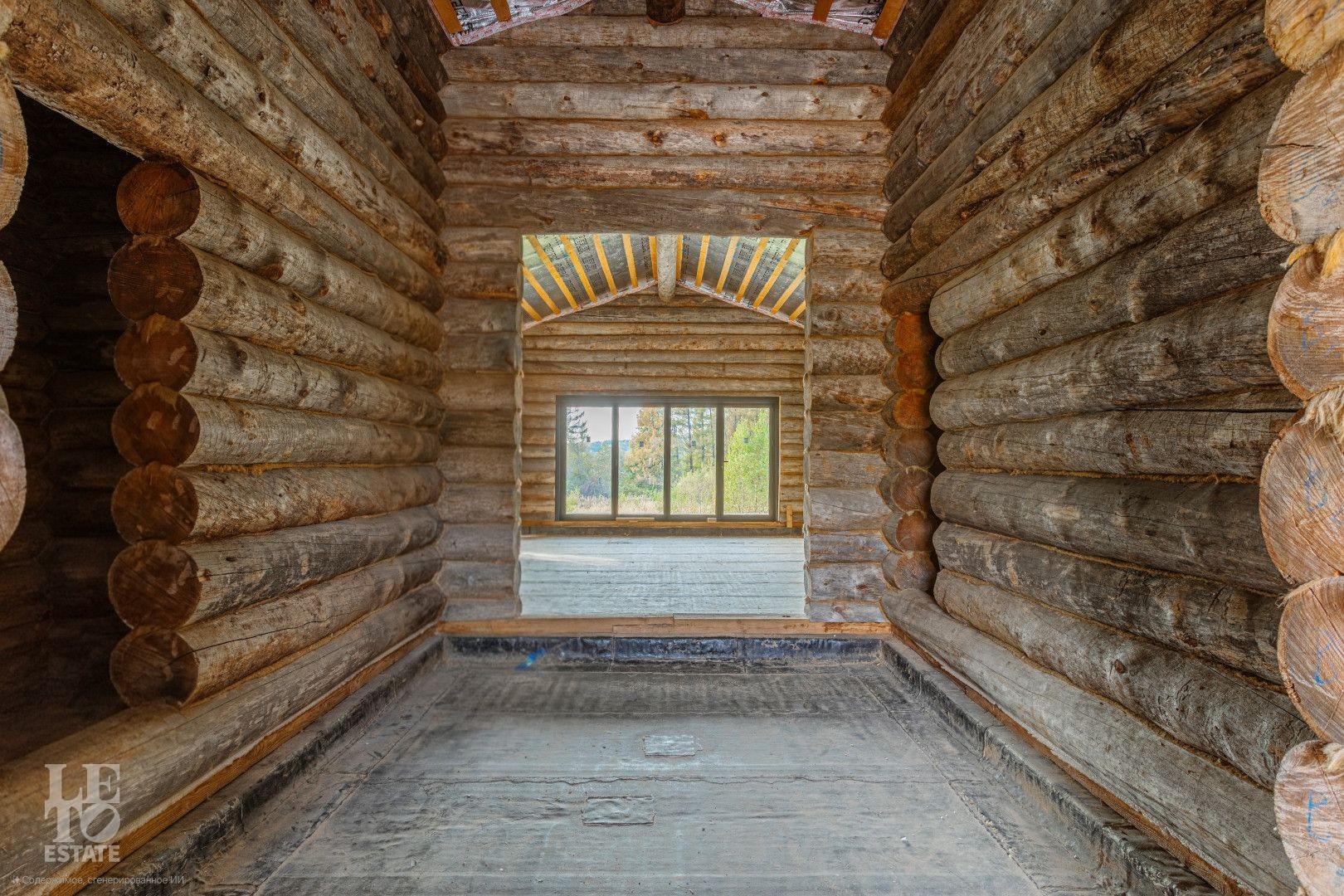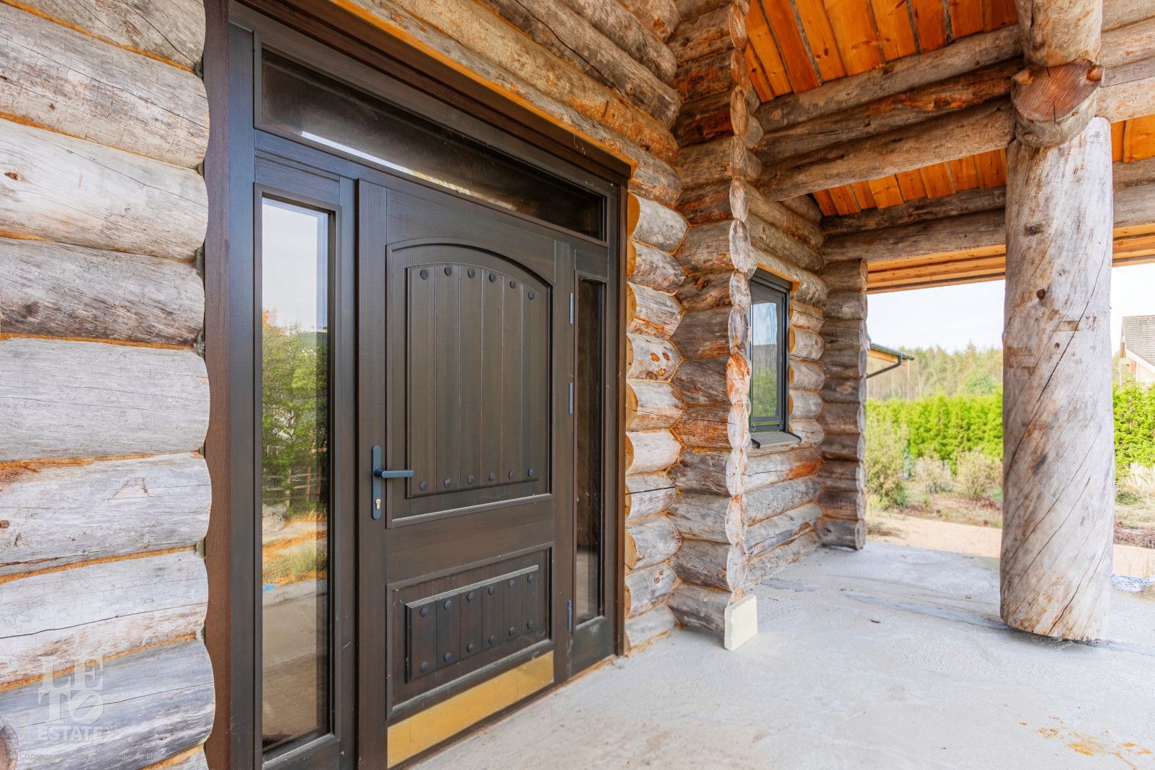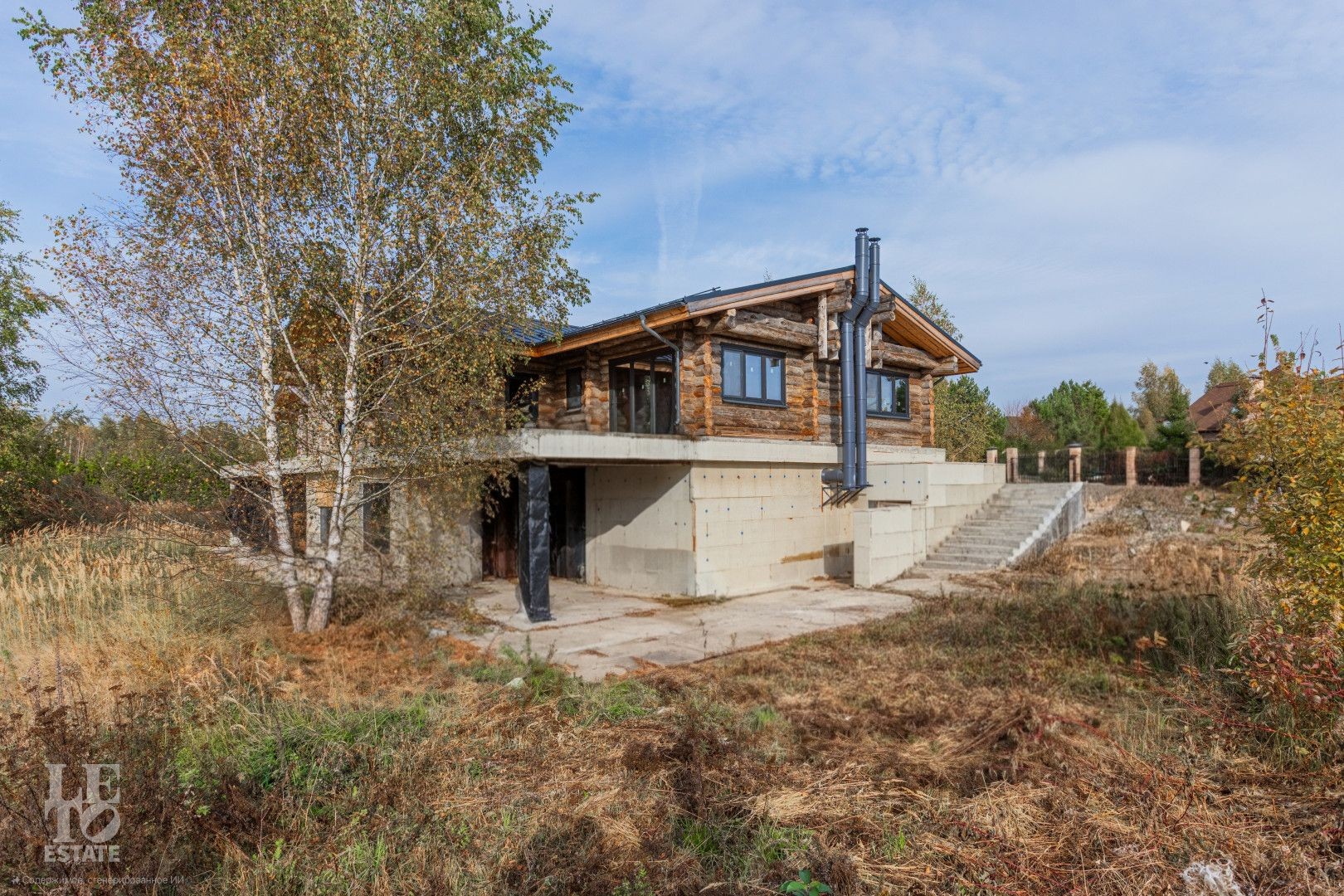 Основная часть дома (первый этаж) возвышается над основательным монолитным цокольном этажом высотой 4 метра. Первый этаж выполнен из сухостойной сосны, привезенной из Карелии компанией ARTKELO. Натуральный цвет дерева подчеркивает текстуру и безупречность материала.