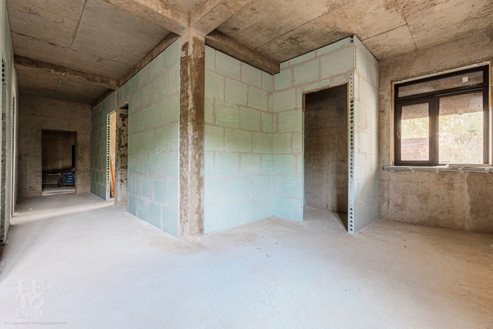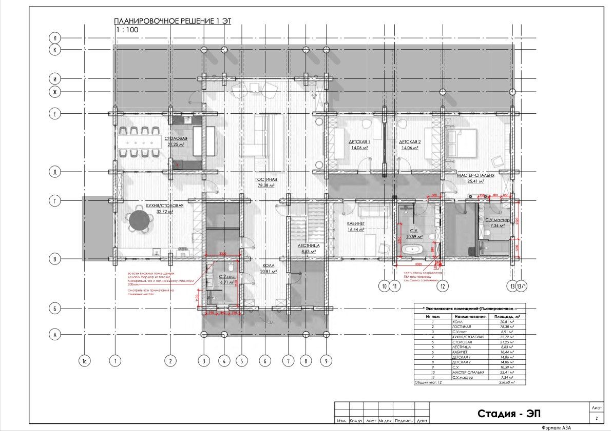 Прихожая, гардеробная, гостевой санузел, гостиная с камином и выходом на большую террасу, кухня – столовая с выходом на террасу, мастер-блок с гардеробной и санузлом, две детский спальни, кабинет, санузел.