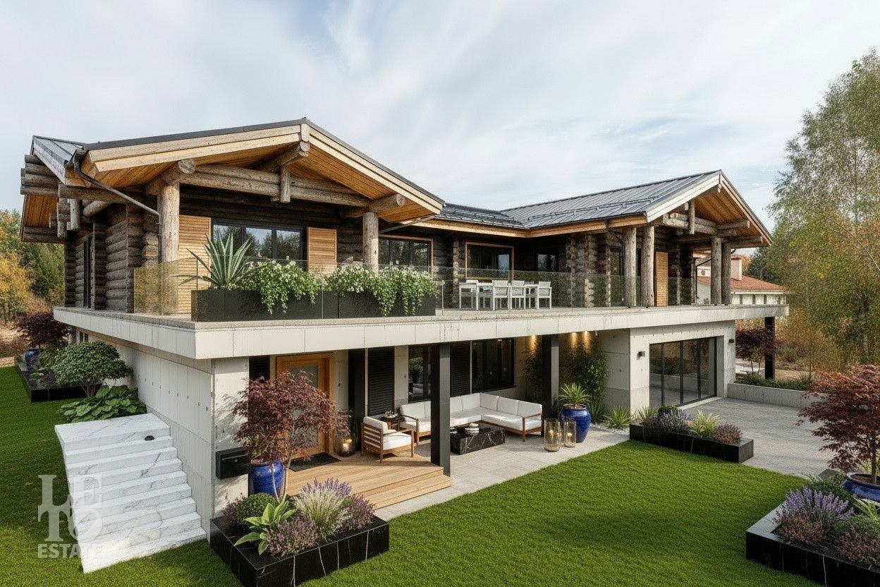 Особенностью проекта является величественное архитектурное решение, которое сочетает в себе мощь и природу. А также важно отметить, что Первый этаж дома выполнен из сухостойной сосны КЕЛО, который является самым экологичным и долговечным материалом для домов.