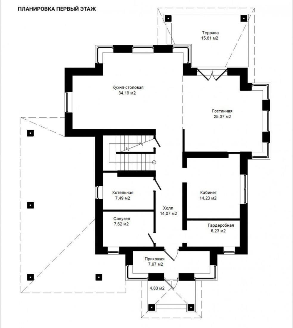 Первый этаж: прихожая, гардеробная, кабинет, гостиная, терраса, кухня-столовая, котельная, кладовая, санузел;