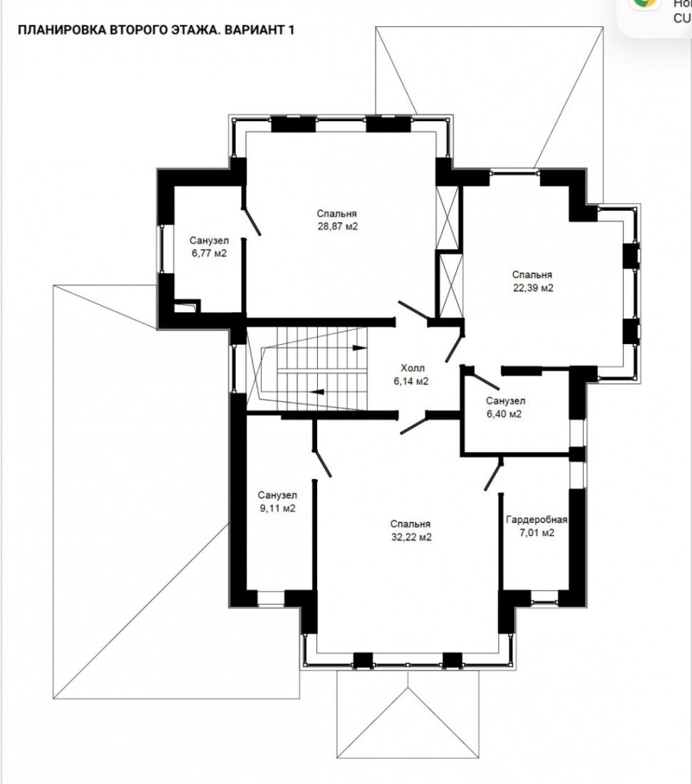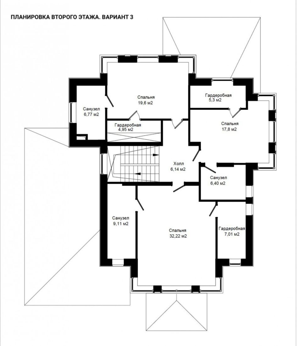 Второй этаж: мастер-спальня с собственной гардеробной и санузлом, две спальни с индивидуальными санузлами.