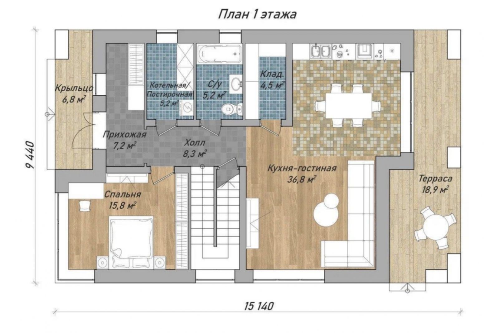 Первый этаж: Холл, гардеробная, котельная/постирочная, гостевая спальня, санузел, кладовая, кухня-гостиная, просторная терраса