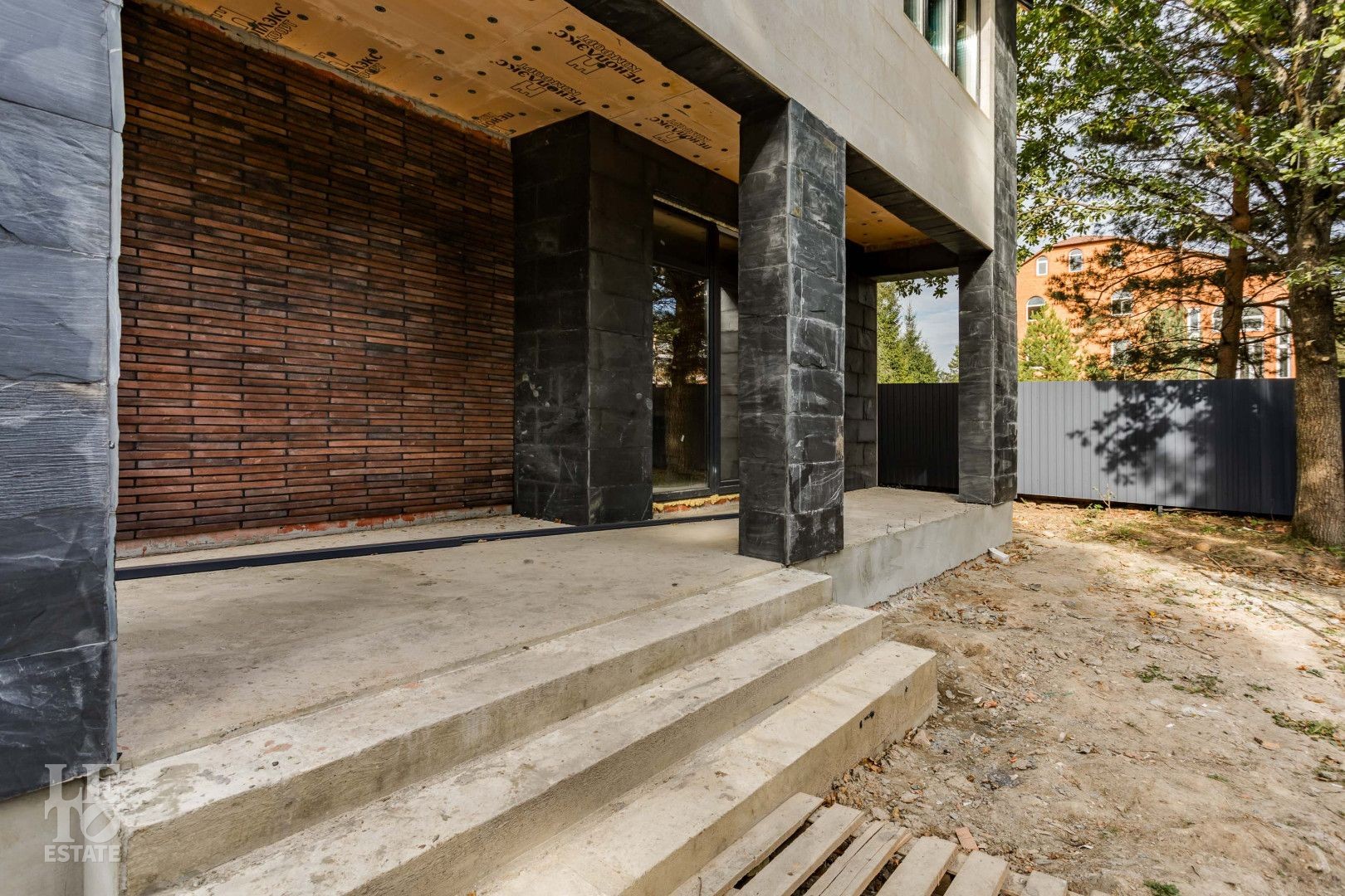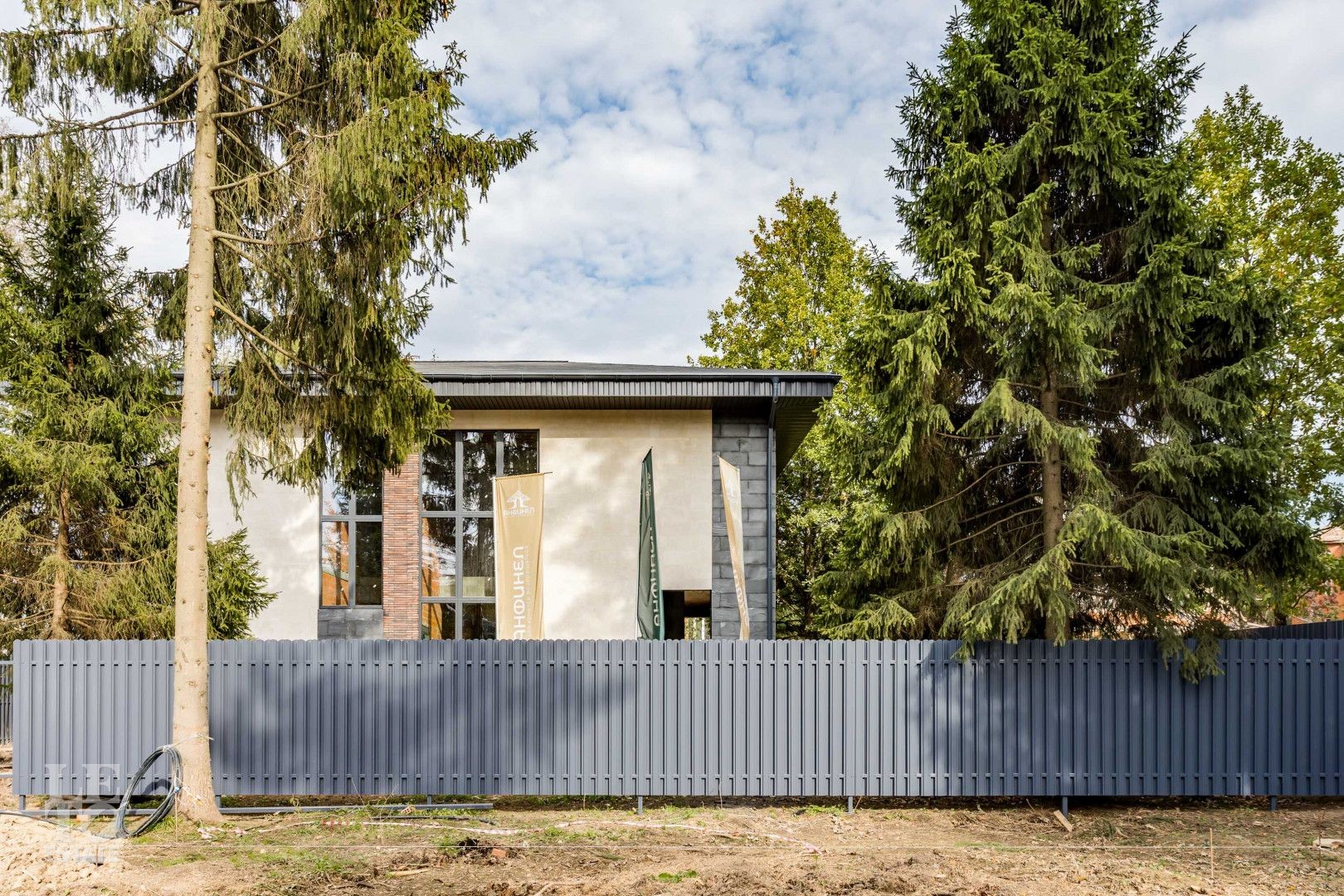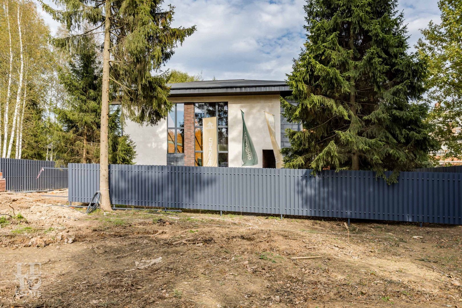 Участок огорожен. Внутренние заборы – металлические, высота 1,8 м. Фасадное ограждение – кирпичные столбы, бетонная лента, горизонтальный штакетник, подсветка. Калитка с закладной под домофон. Откатные ворота с закладной под автоматику.