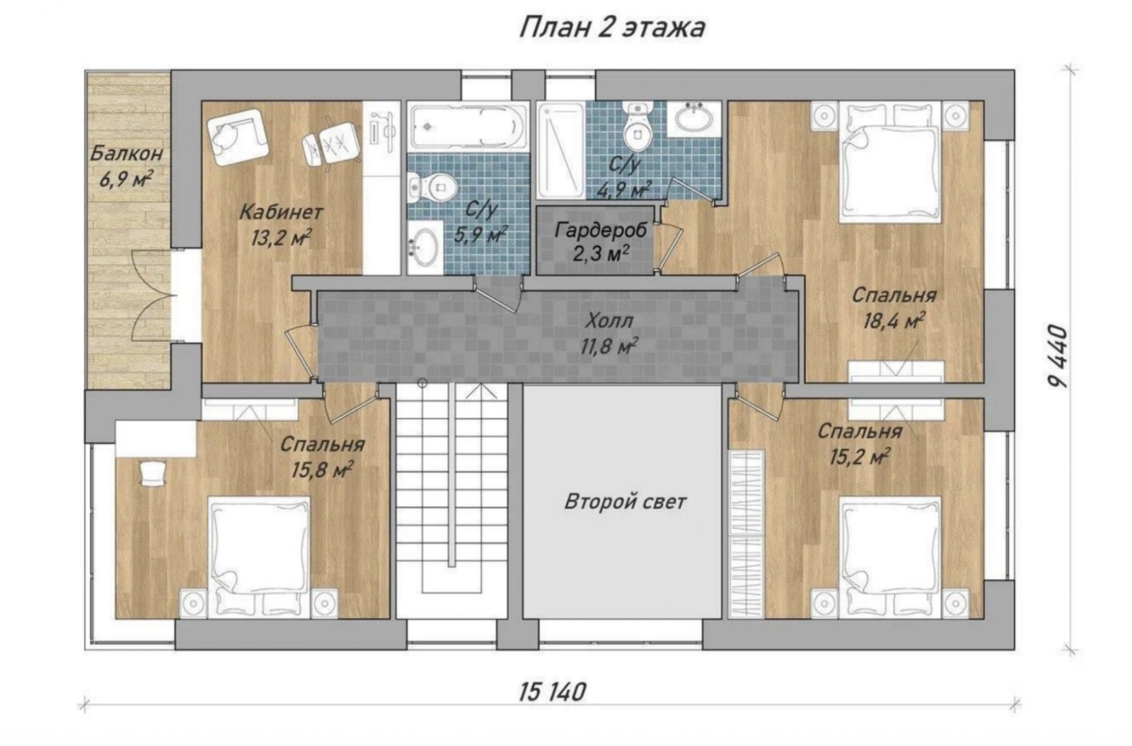Второй этаж: холл второго этажа, санузел, две изолированные спальни, кабинет с выходом на балкон, мастер-спальня с собственными гардеробной и санузлом.