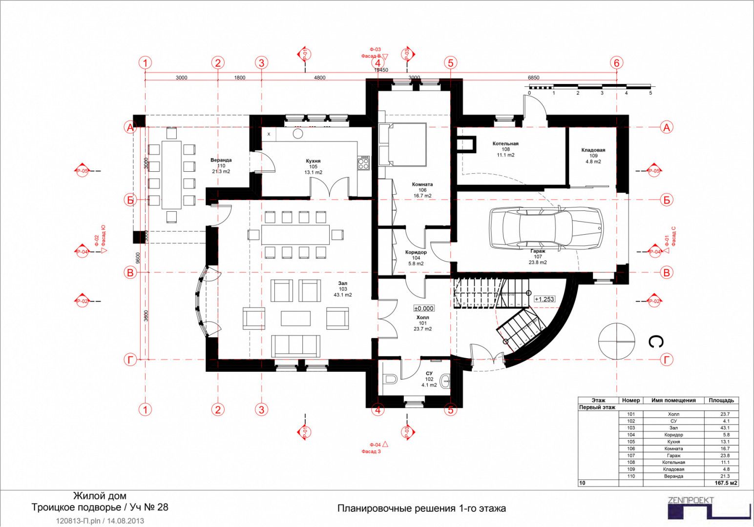 Первый этаж - прихожая, холл, кухня - столовая с выходом на террасу, гостиная, гостевая спальня, санузел, гараж на 1 м/м, котельная.
