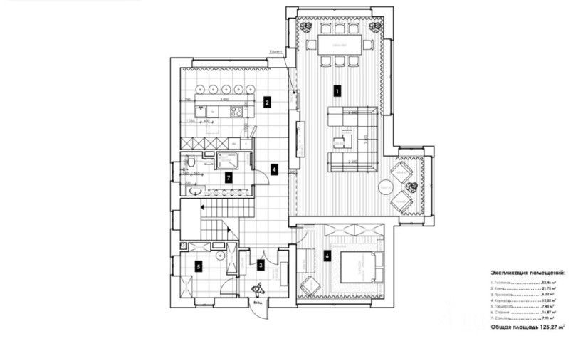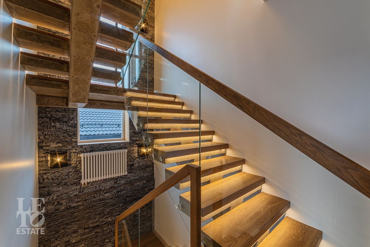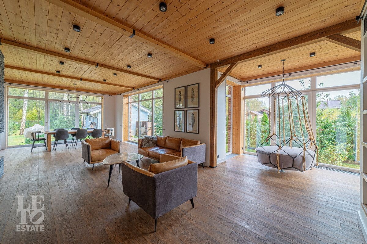 Внутреннее пространство дома оформлено в современном стиле с использованием приятных благородных оттенков, что создает ощущение простора, гармонии и спокойствия, а также уютную и стильную обстановку.