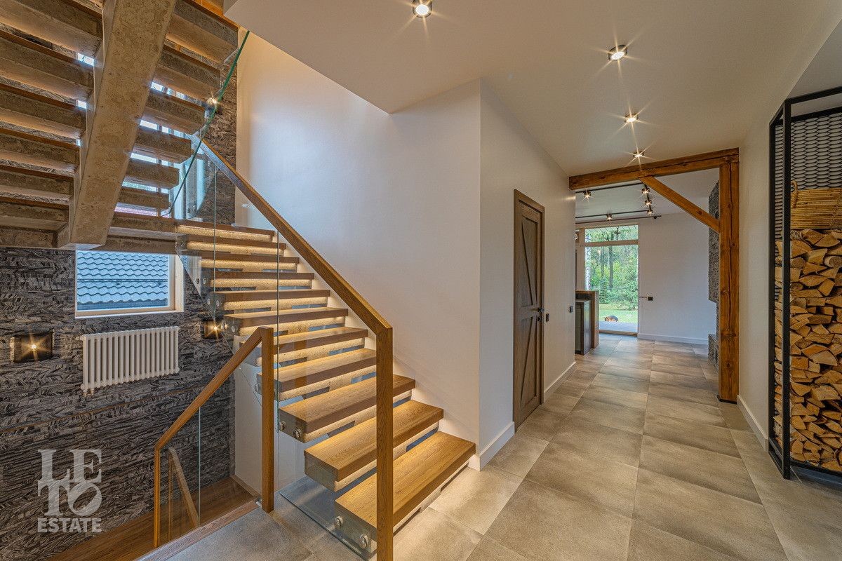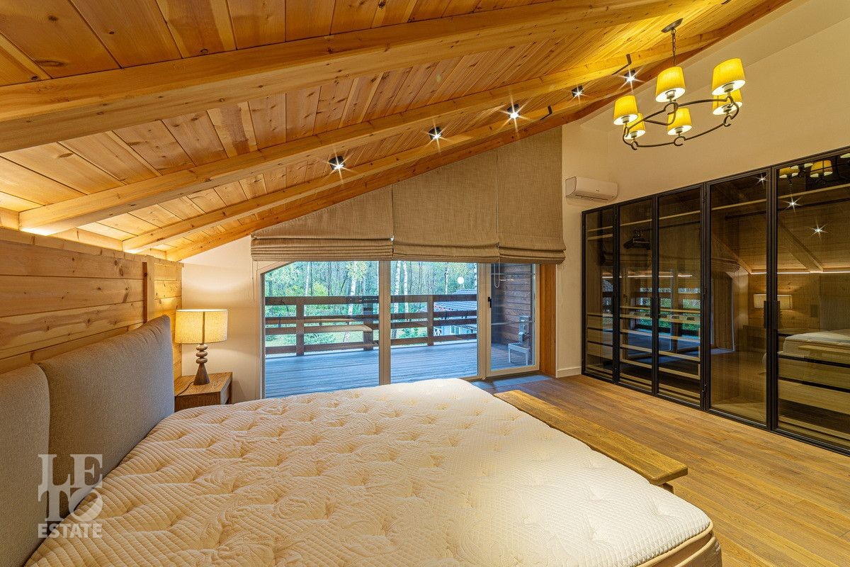 Особый шарм дому добавляет панорамное остекление на первом этаже, которое заполняет помещение светом и позволяет наслаждаться красивыми видами на участок примыкающий к лесу. Высокие потолки и просторные террасы создают атмосферу пространства и свободы.