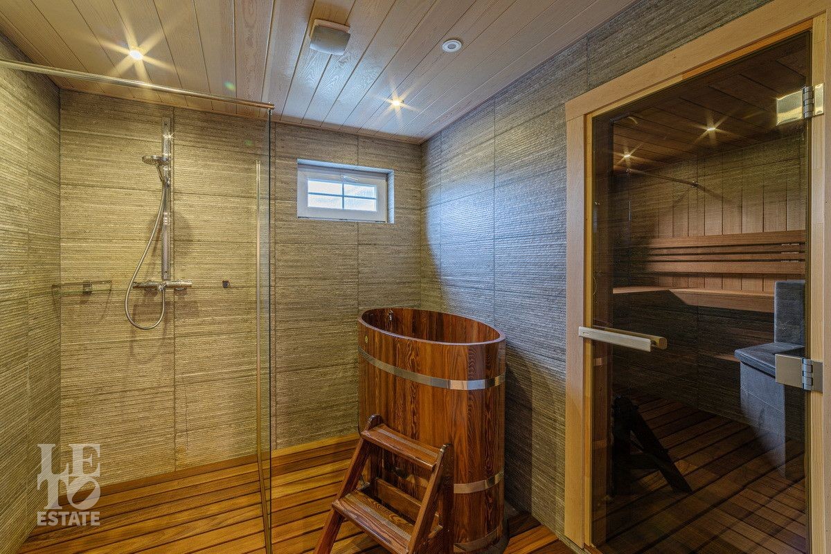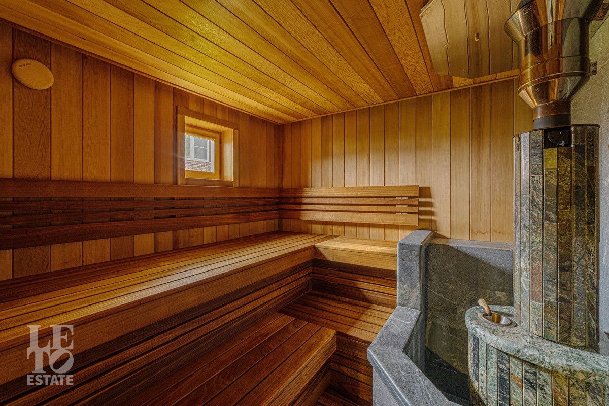 Для полноценного отдыха, на участке построена отдельная баня площадью 60 кв.м. из клееного бруса, парная отделана деревом Абаш в комбинацией с гималайской соль. Так же на участке возведен теплый гараж на две машины, помещением для персонала и навесом общей площадью 80 кв.м.