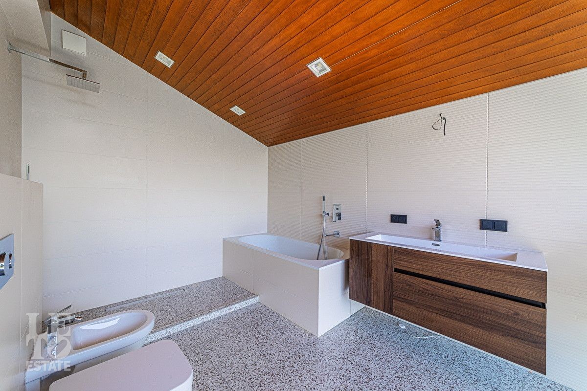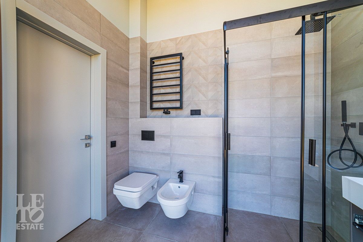 Второй этаж: Мастер спальня с гардеробной и ванной комнатой, две спальни со своими санузлами, терраса над гаражом, на террасу выведены все коммуникации.