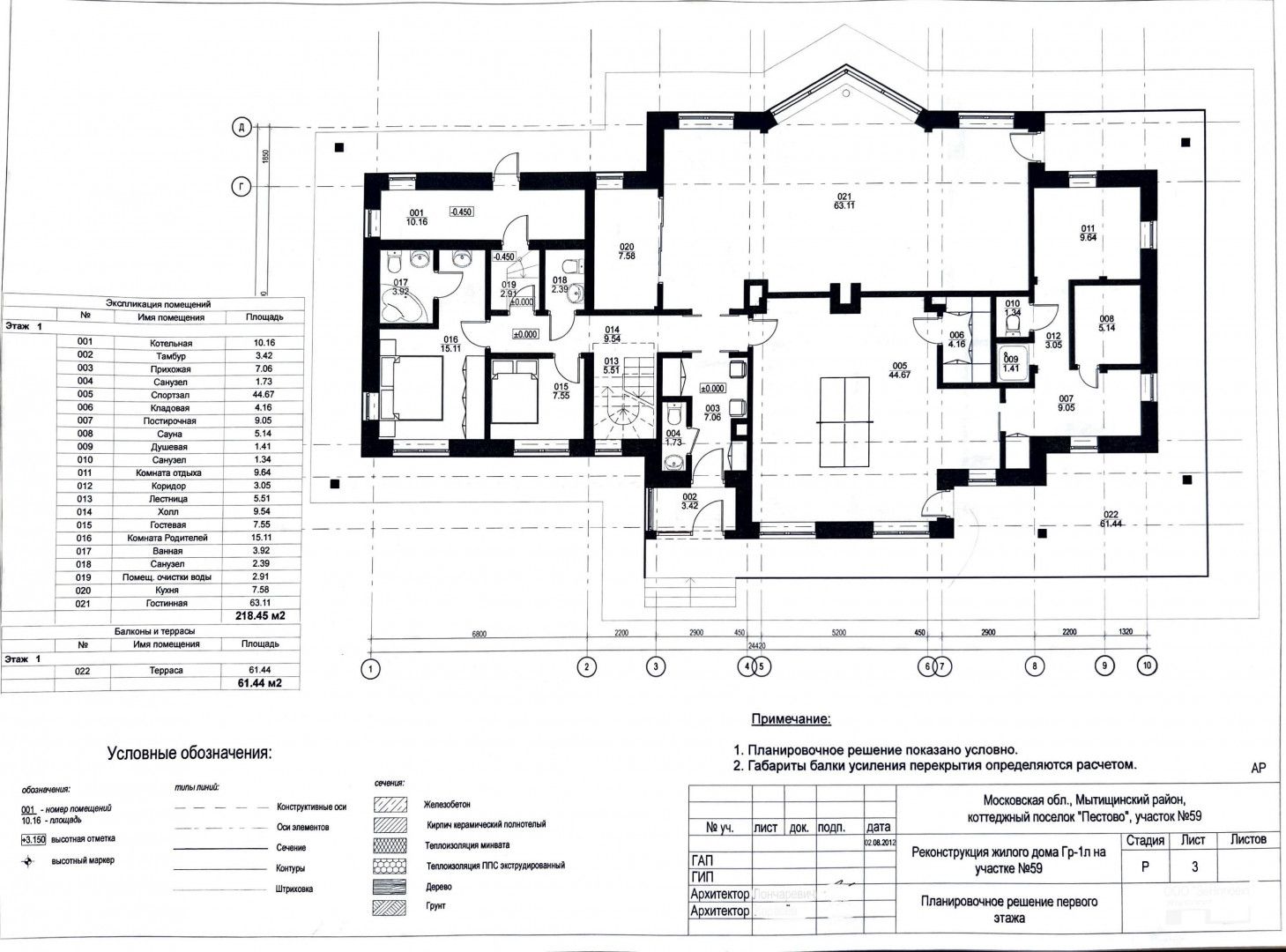 Первый этаж: Прихожая, кухня, гостиная-столовая, комната отдыха, гостевая комната, сауна, блок для персонала с кухней, санузлом и спальней, постирочная, три санузла, душевая, котельная, терраса по периметру дома.