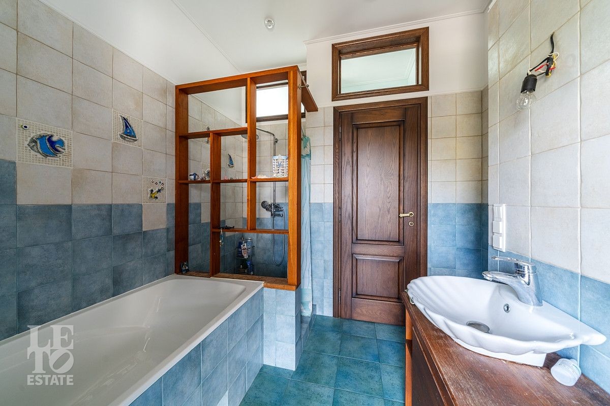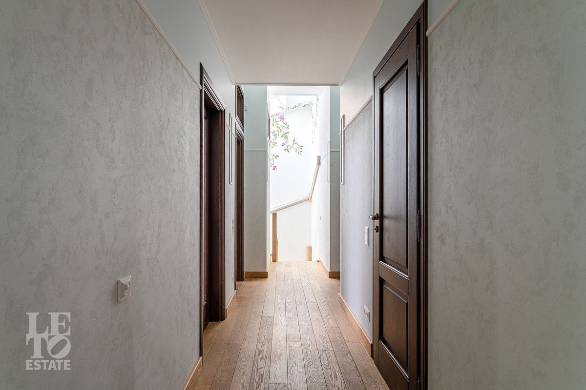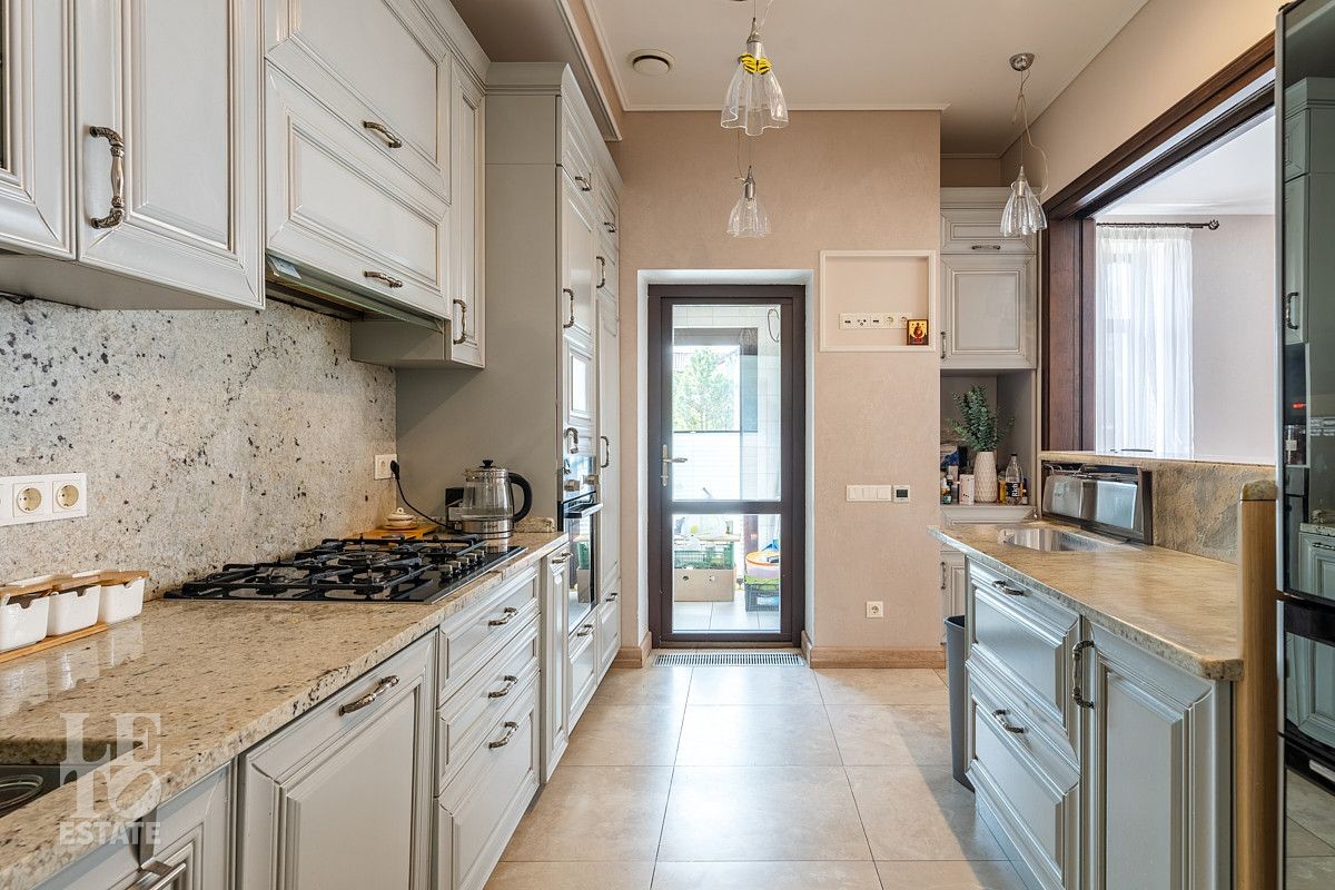 На первом этаже дома расположены большая светлая гостиная-столовая с панорамными окнами и выходом на террасу, кухня с подсобным помещением и выходом на террасу, гостевая спальня, два гостевых санузла, просторная комната с гардеробной и выходом на террасу, сауна с душевой и санузлом, оборудованная постирочная и котельная, блок для персонала с отдельным входом.