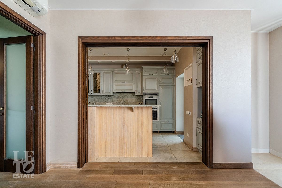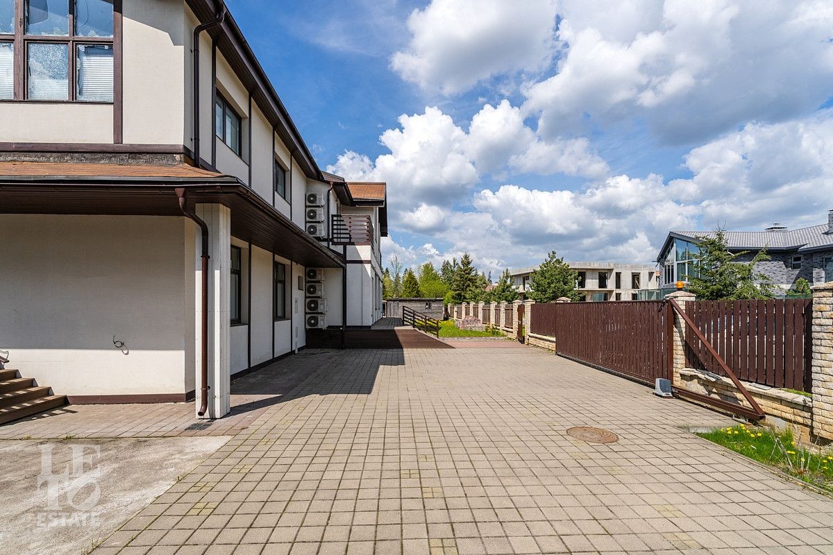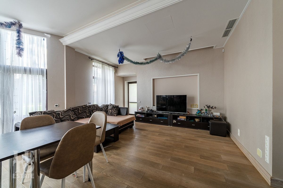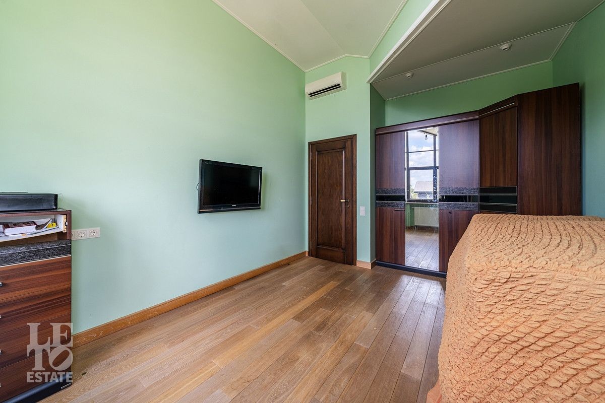 На первом этаже дома расположены большая светлая гостиная-столовая с панорамными окнами и выходом на террасу, кухня с подсобным помещением и выходом на террасу, гостевая спальня, два гостевых санузла, просторная комната с гардеробной и выходом на террасу, сауна с душевой и санузлом, оборудованная постирочная и котельная, блок для персонала с отдельным входом.