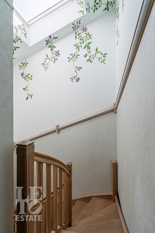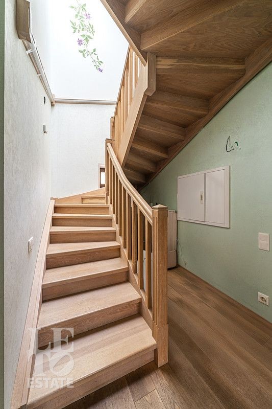 Лестница выполнена из массива дуба, на полу первого - этажа паркетная доска, второго этажа - инженерная доска.