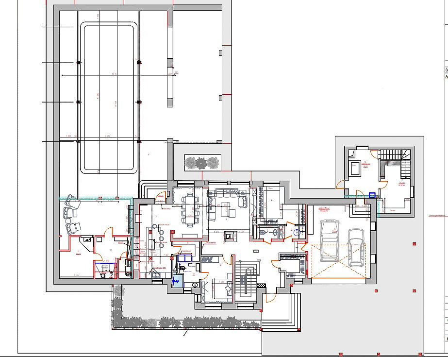 Первый этаж - прихожая, гардеробная, санузел, постирочная, гараж на две машины, кладовая, котельная, кухня-столовая и гостиная с камином - панорамное остекление которой выходит на великолепный участок, гостевая спальня, санузел, спа-комплекс с дровяной баней и бассейном, теплая веранда с полноценной кухней, барбекю зоной и столовой способной уместить большую компанию;