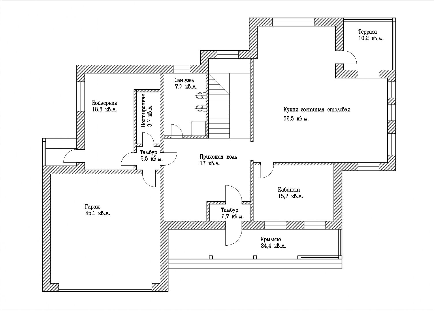 Первый этаж: крыльцо, тамбур, прихожая, гараж, тамбур, бойлерная, крыльцо, постирочная, санузел, кухня-гостинная-столовая, терраса, кабинет.