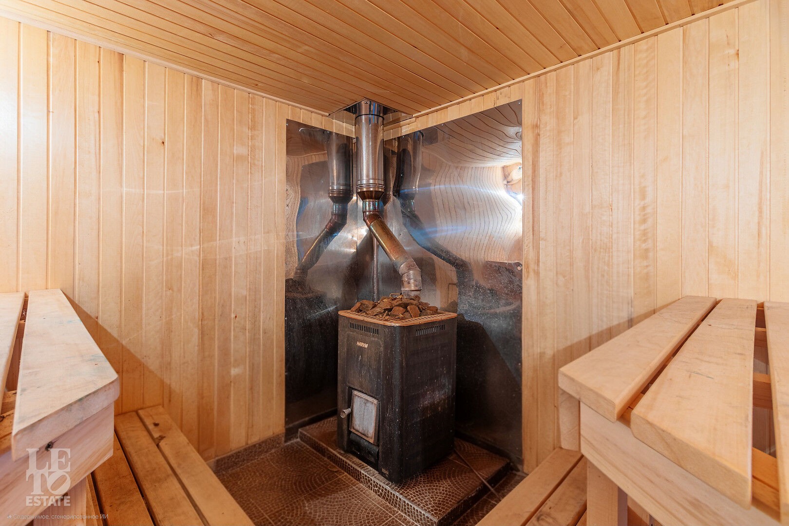 Пристройка блок и фиброцементный сайдинг. Бассейн 8,2х3,7 м (глубина 1,25-1,7 м), сауна с дровяной печью, гостевая комната с санузлом и собственным выходом наружу.