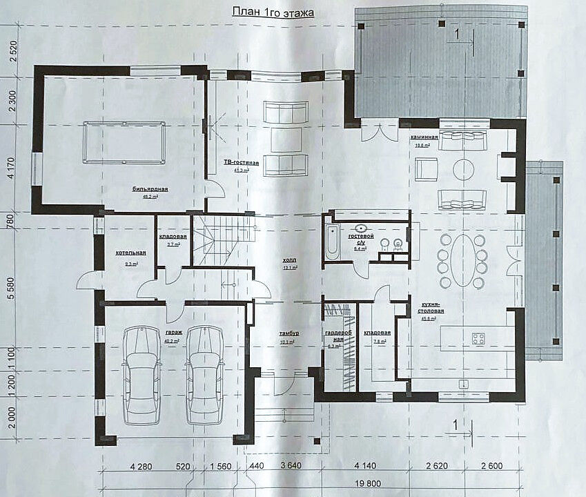 Первый этаж - прихожая, гардеробная, гостиная, библиотека с камином, кухня столовая с застекленной террасой и выходом на участок, кладовая, санузел, гараж на два м/м, котельная, чемоданная;