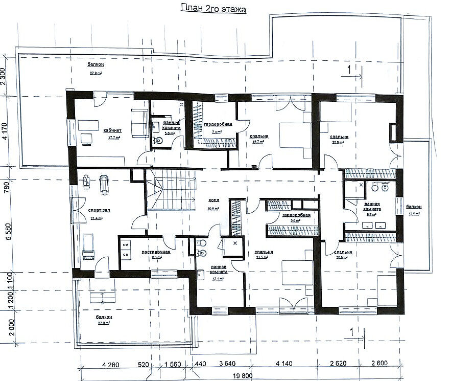 Второй этаж - спортзал, постирочная, мастер-спальня со своей ванной комнатой и гардеробной, гостевая спальня, санузел, три спальни, санузел, из каждой спальни предусмотрен выход на крытую террасу, которая располагается по периметру всего этажа.