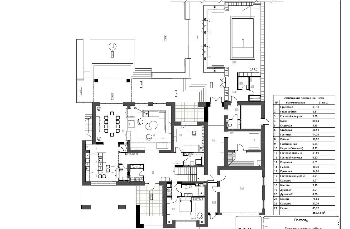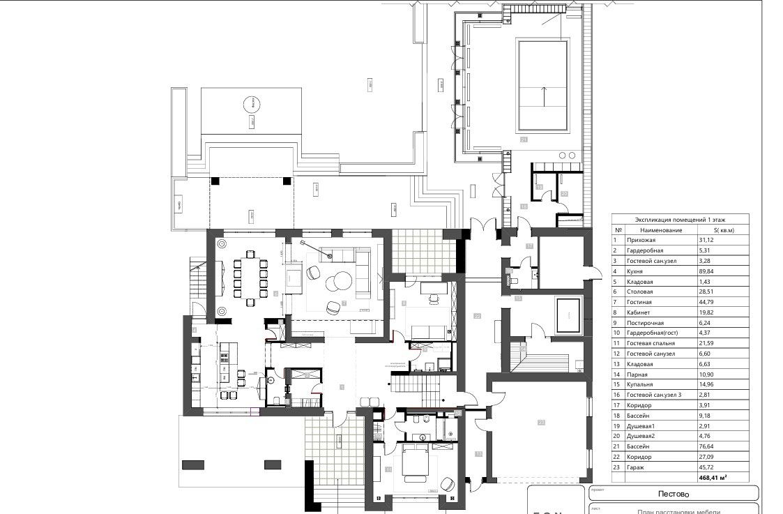 Первый этаж: прихожая, гардеробная, гостевой санузел, кухня, кладовая, столовая, гостиная со вторым светом, кабинет, постирочная, гостевая спальня со своим санузлом и гардеробной, парная с купелью и душевой зоной, зона отдыха с кухней, санузел, бассейн, котельная, гараж на две машины, кладовая, квартира для персонала с отдельным входом;