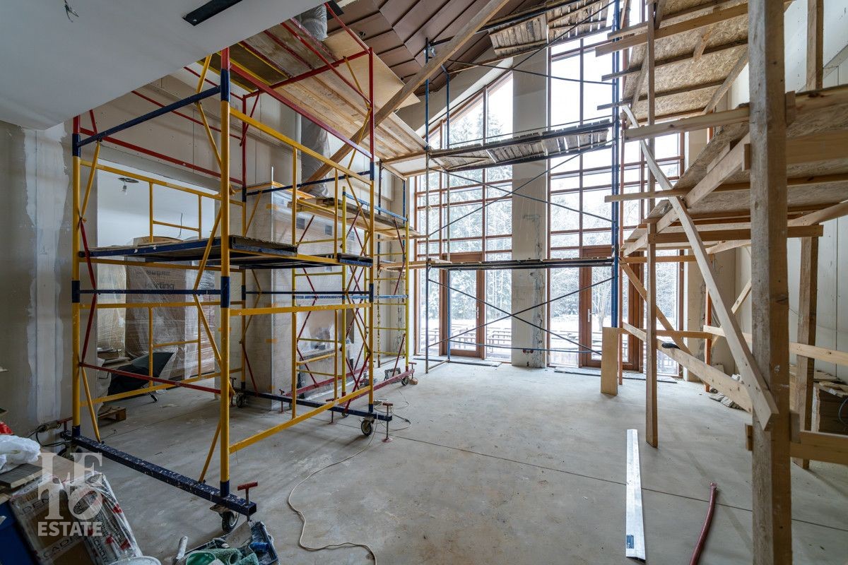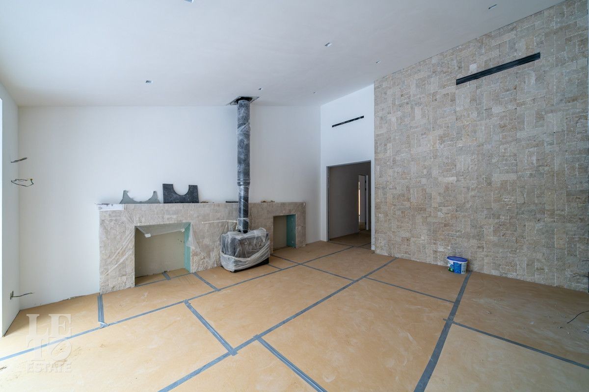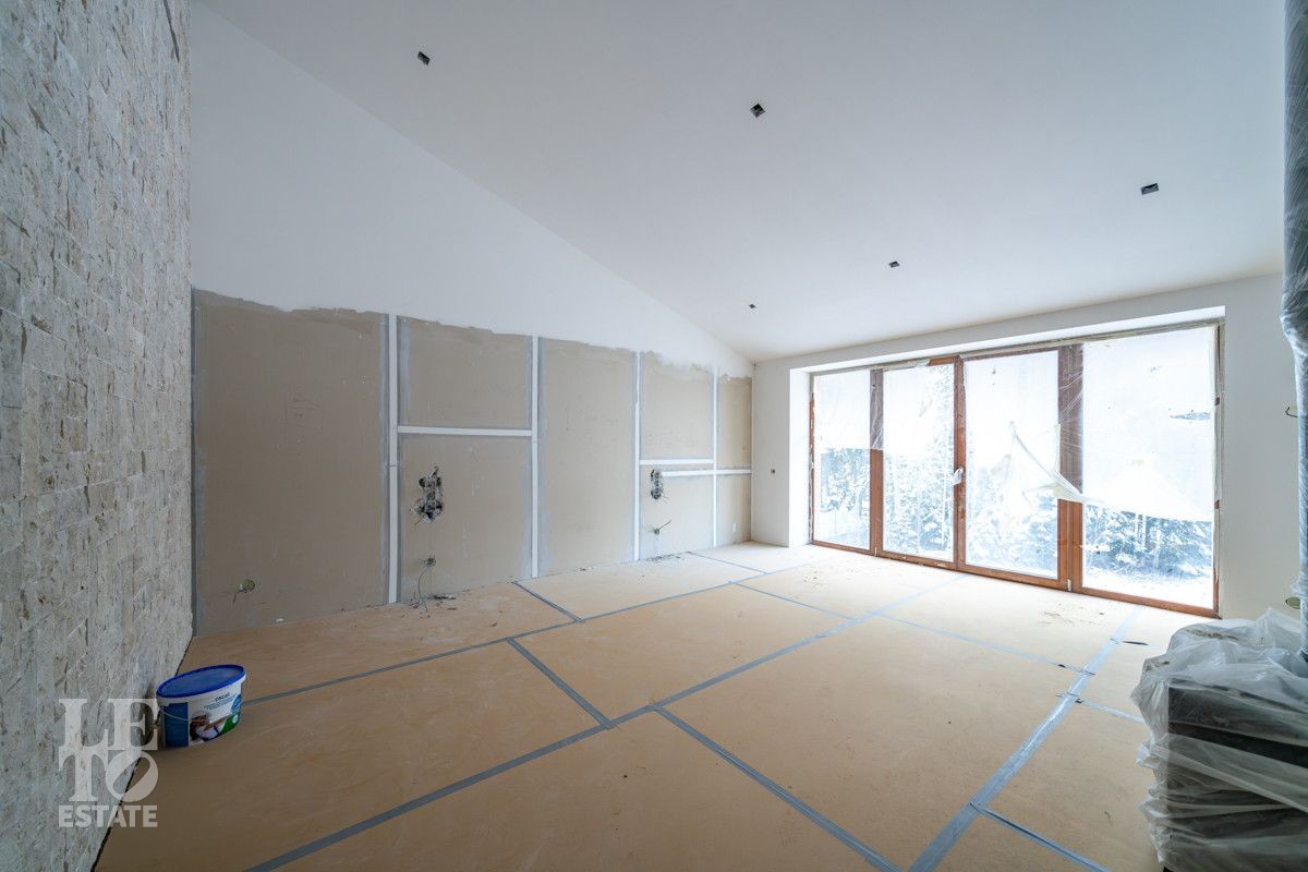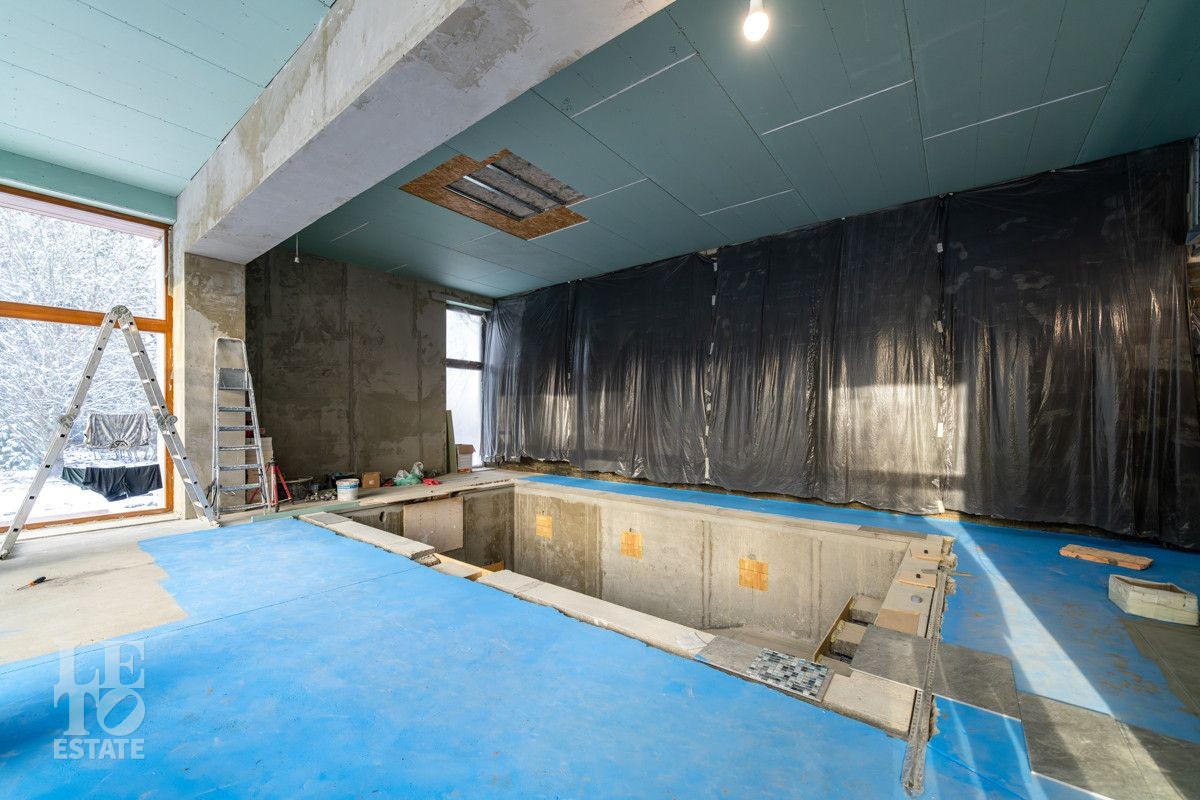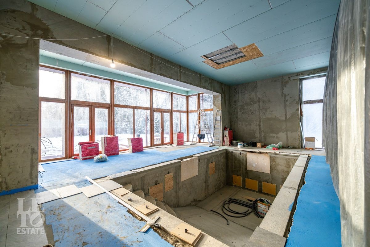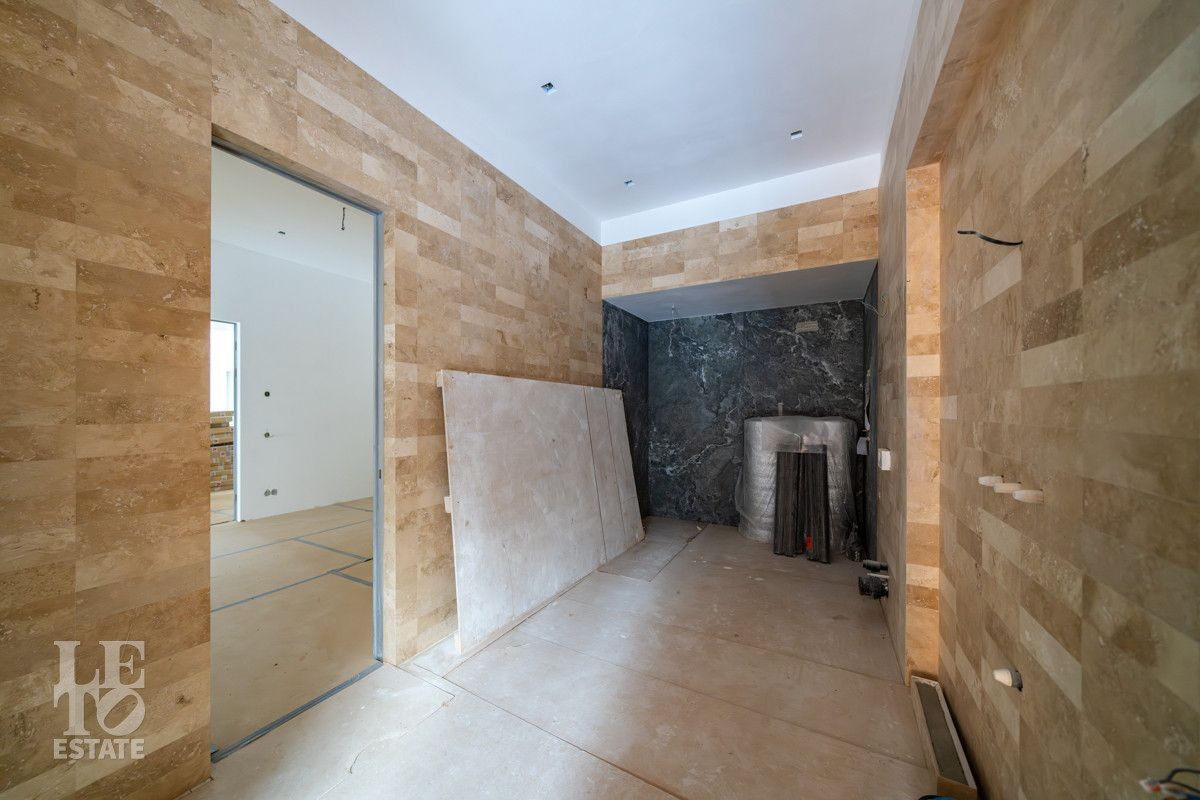 В доме выполнено большое количество внутренних строительных и отделочных работ и состояние доведено до финишной отделки: выполнены перегородки, оштукатурены и подготовлены под финишную покраску стены, выполнена вся разводка инженерных коммуникаций по дому, отлита лестница по всем трем этажам, пол- на первом этаже и в санузлах снабжен водяным обогревом, выполнена и разведена по дому приточно –вытяжная вентиляция. На цокольном этаже установлена отдельная вентиляция для организации климат-контроля в зоне бассейна. На первом этаже на полу уложен керамогранит, санузлы доведены до 90%-ной готовности, установлены встроенные части сантехнического оборудования. На втором этаже также готовы санузлы, уложен паркет и декоративный камень. По дому проведена вся электрика и установлена система "умного дома". Закуплены все внутренние двери, закуплена вся кухня с техникой и мебелью .