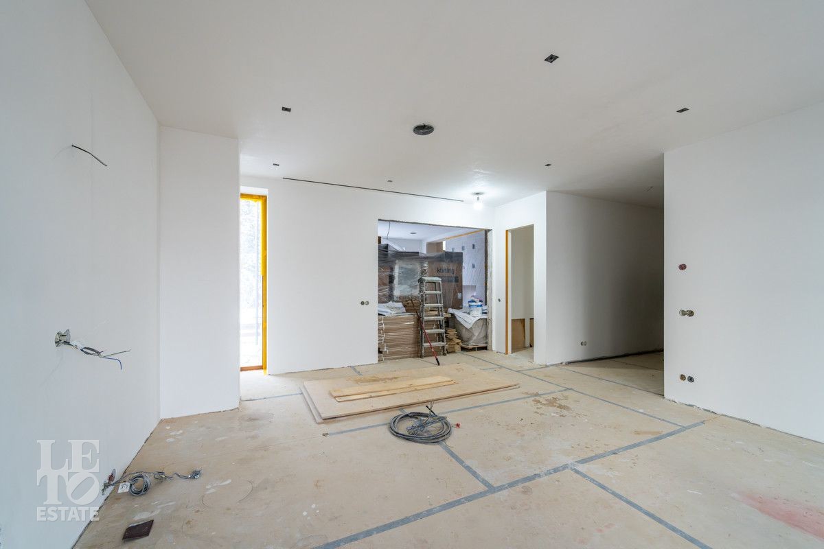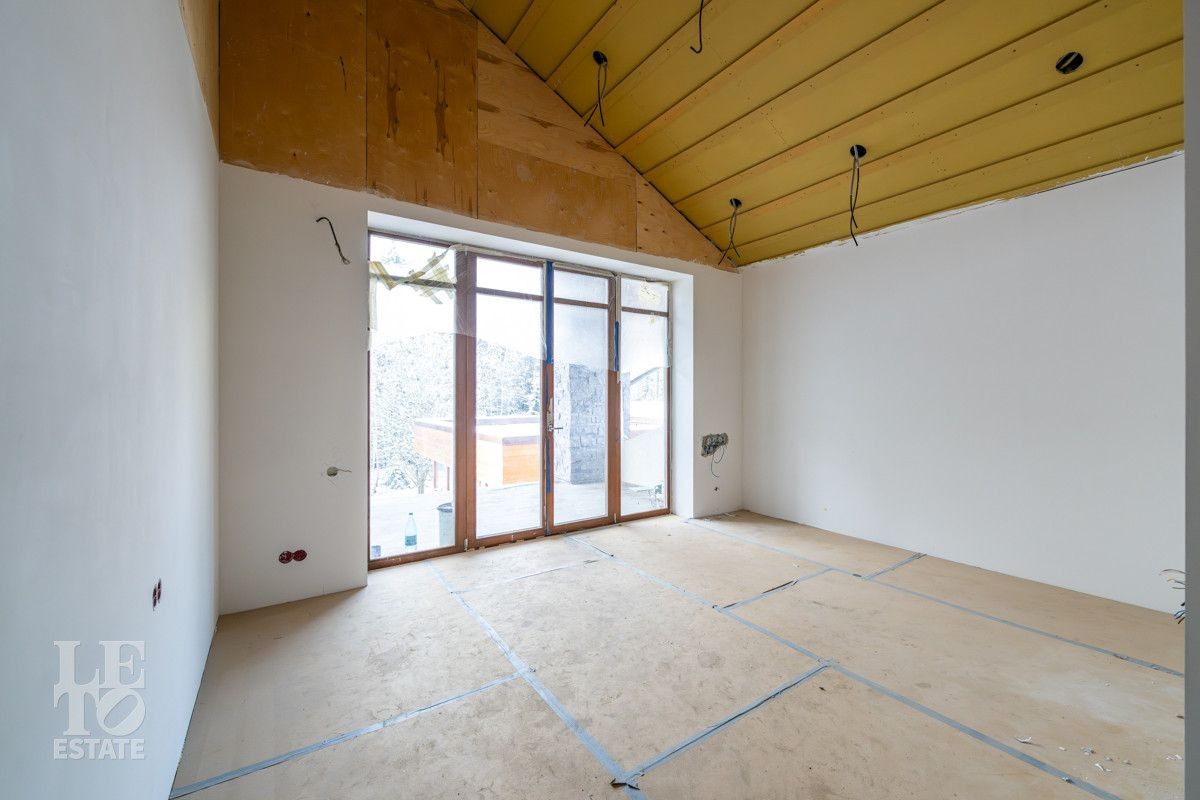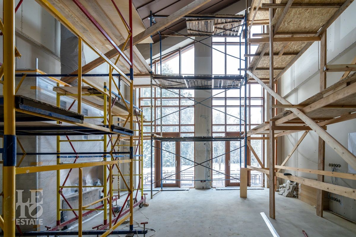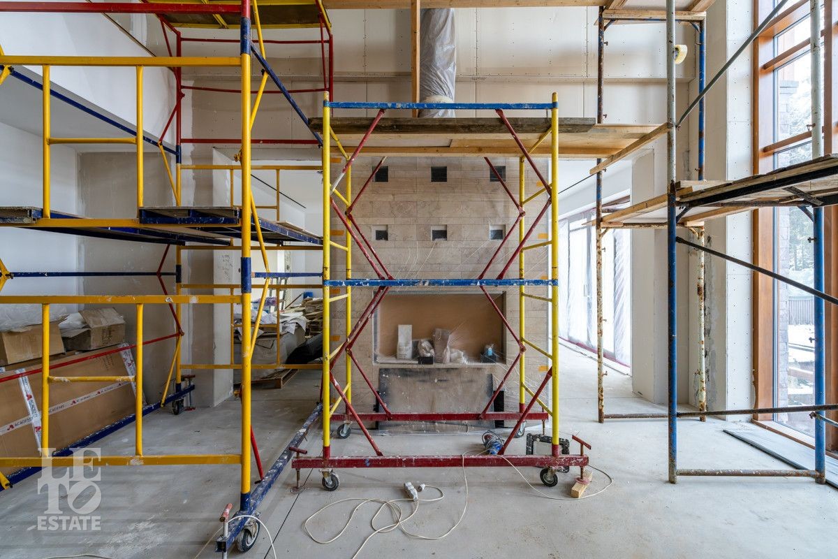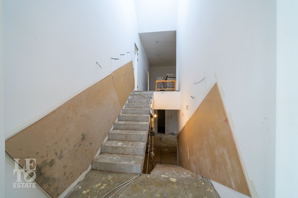В доме выполнено большое количество внутренних строительных и отделочных работ и состояние доведено до финишной отделки: выполнены перегородки, оштукатурены и подготовлены под финишную покраску стены, выполнена вся разводка инженерных коммуникаций по дому, отлита лестница по всем трем этажам, пол- на первом этаже и в санузлах снабжен водяным обогревом, выполнена и разведена по дому приточно –вытяжная вентиляция. На цокольном этаже установлена отдельная вентиляция для организации климат-контроля в зоне бассейна. На первом этаже на полу уложен керамогранит, санузлы доведены до 90%-ной готовности, установлены встроенные части сантехнического оборудования. На втором этаже также готовы санузлы, уложен паркет и декоративный камень. По дому проведена вся электрика и установлена система "умного дома". Закуплены все внутренние двери, закуплена вся кухня с техникой и мебелью .