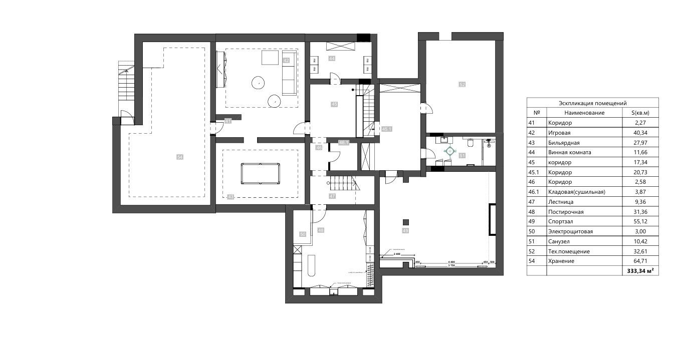 Цокольный этаж: игровая, бильярдная, спортивный зал, санузел, сушильная, кладовая, винная комната, электрощитовая, хранение, постирочная, тех. помещение под бассейном;