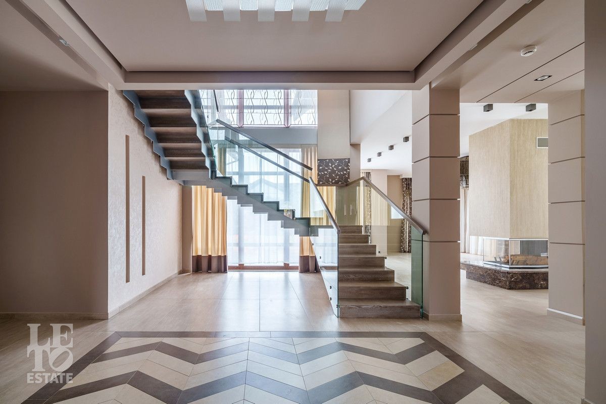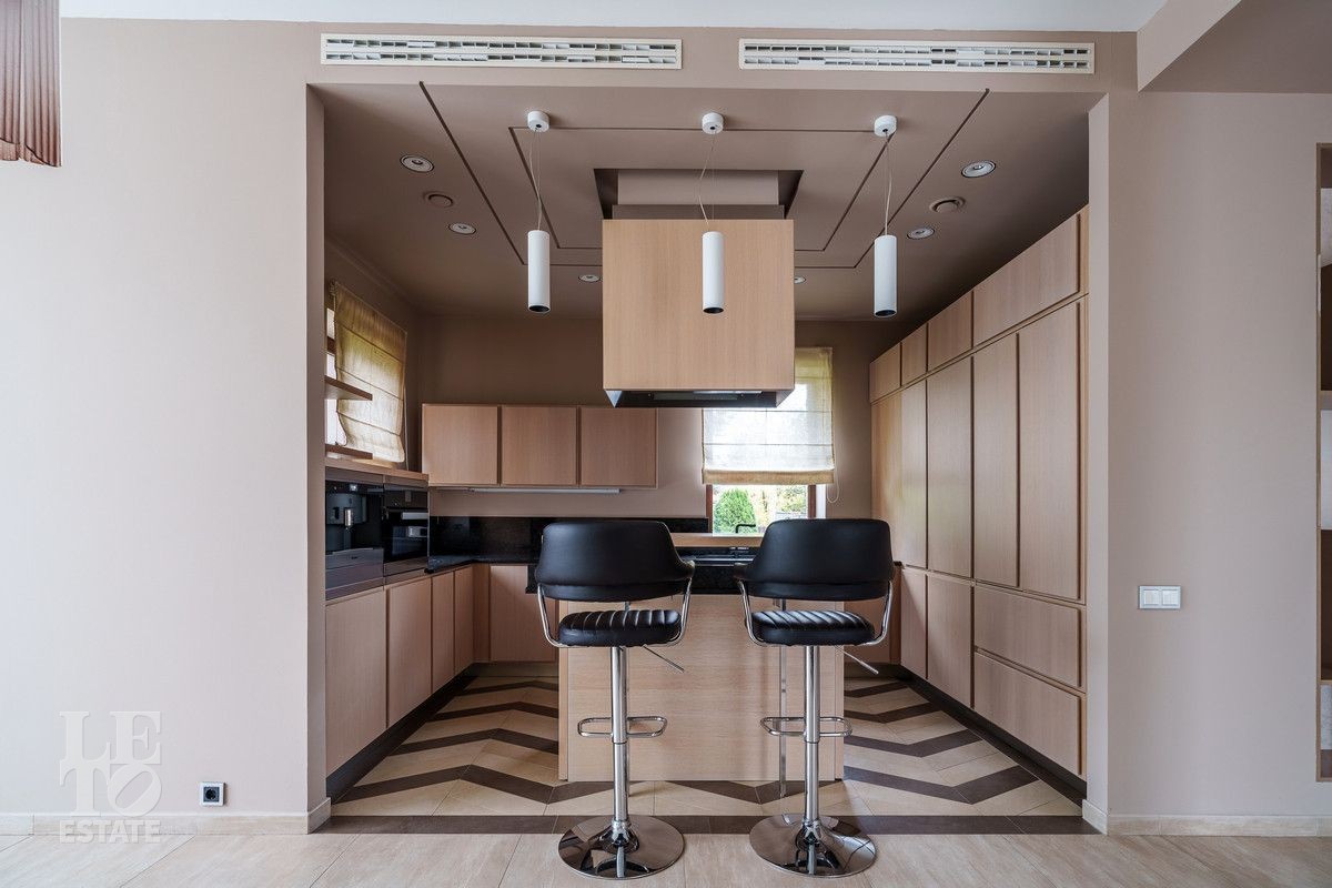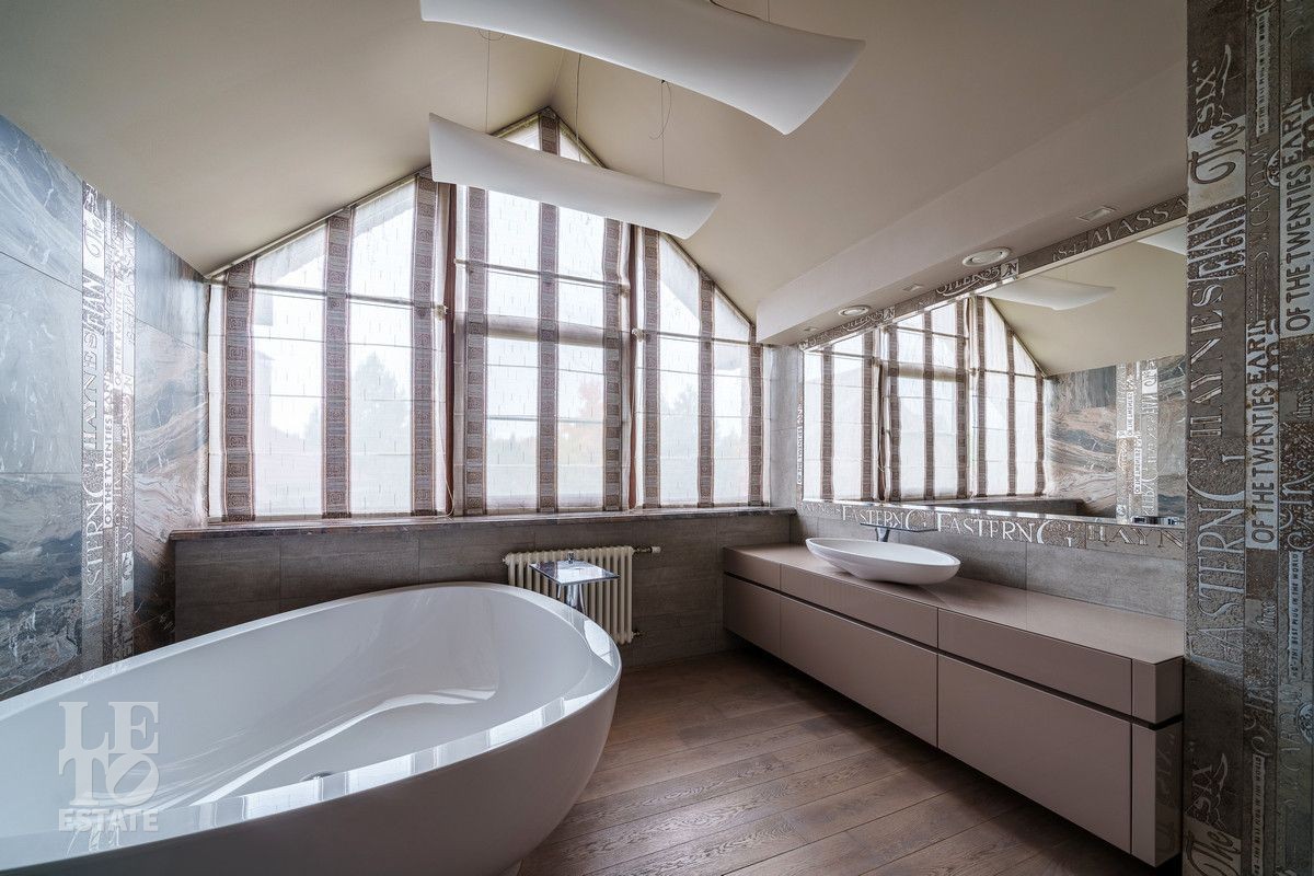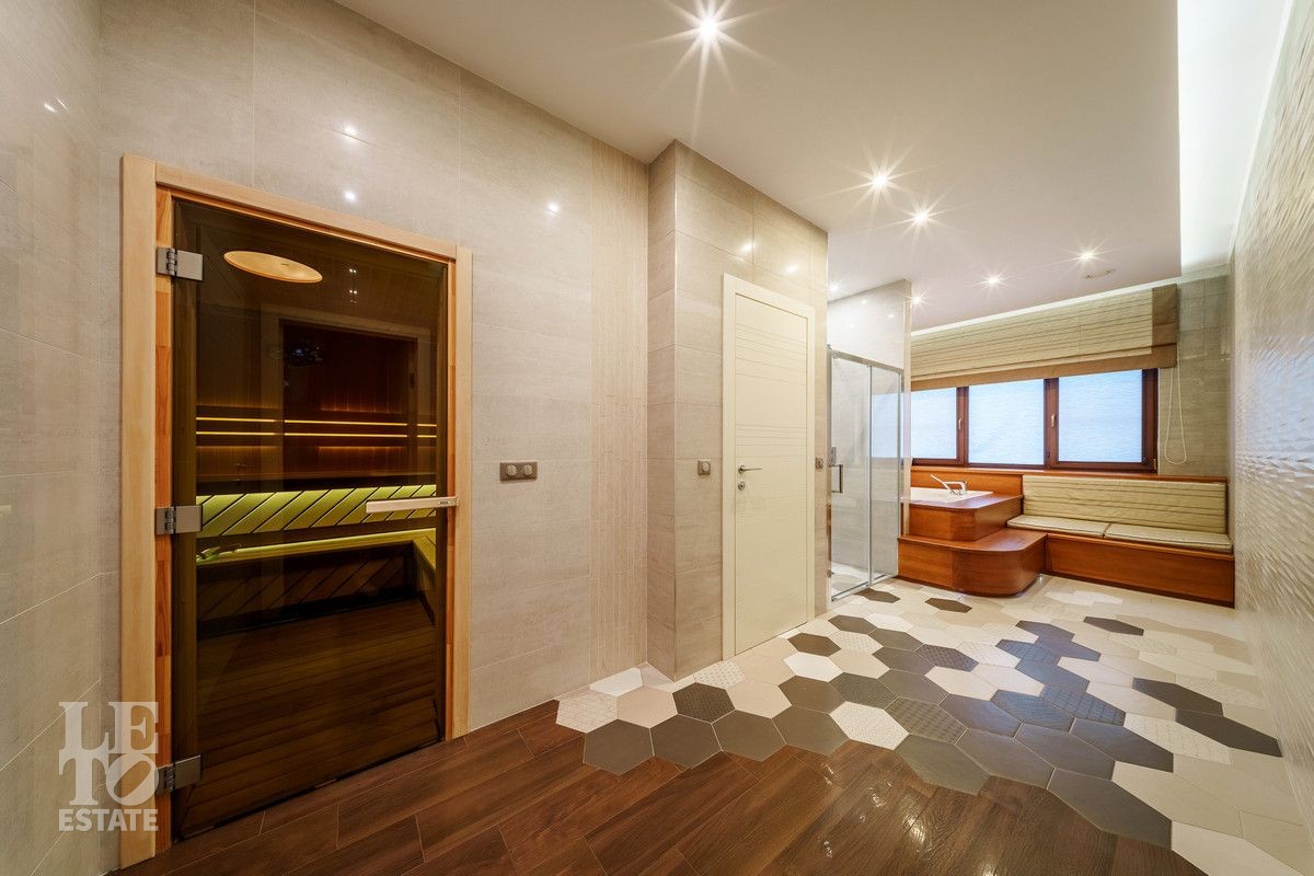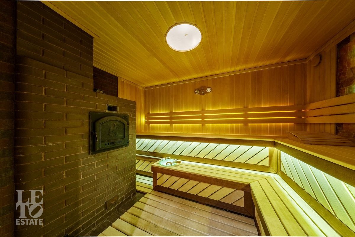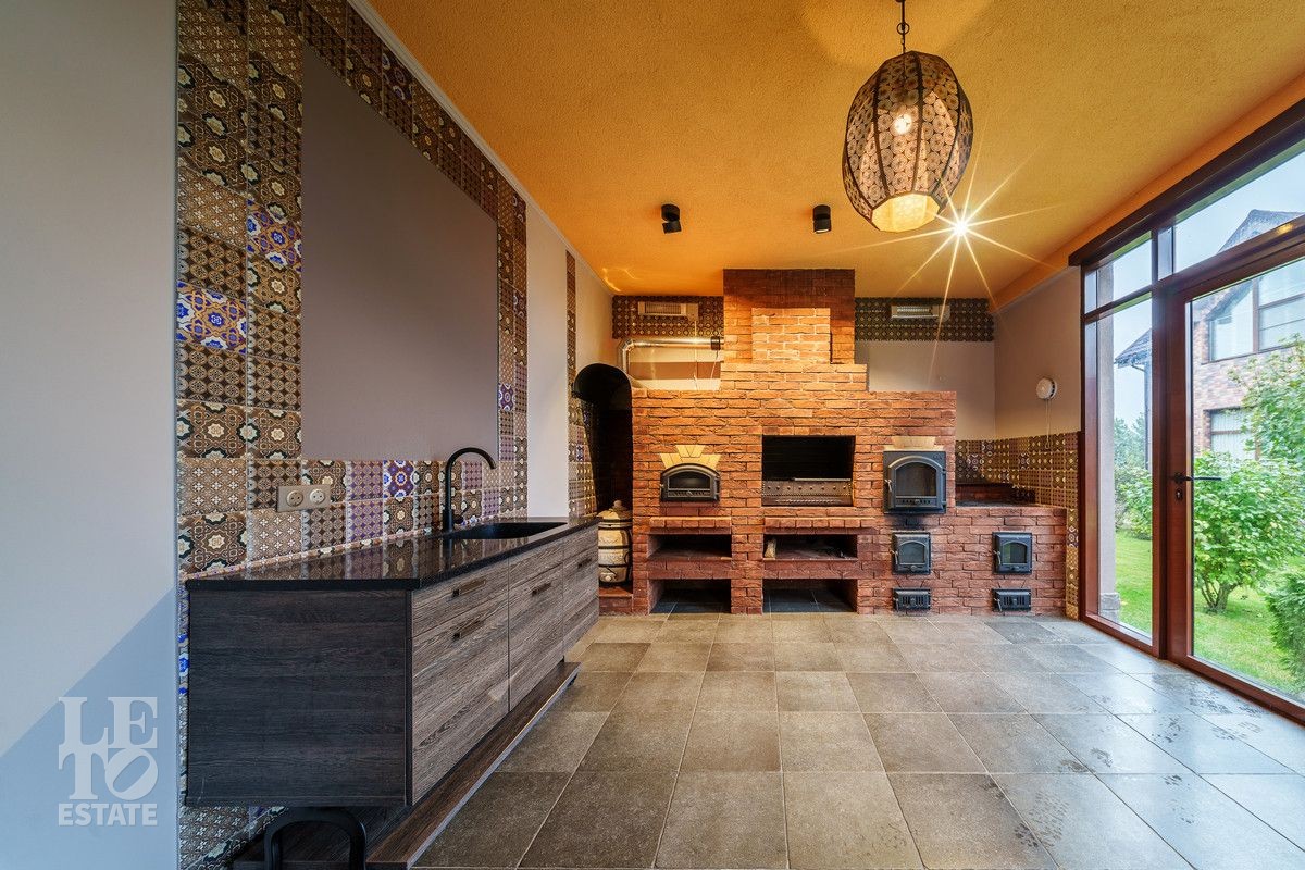 В основном доме удобно сочетаются большие зоны остекления с функциональным зонированием на главные места притяжения: кухня, столовая и гостиная с двухсторонним камином с выходом на террасу. Полы в доме на первом этаже выполнены из керамогранита с проложенным теплым водяным полом. Полы в жилых комнатах и в холлах выполнены из массива дуба и находятся в идеальном состоянии. Вся техника премиальных мировых брендов (Miele, Neff, Bosch) установлена в санузлах и на кухне. Все жилые комнаты оснащены кондиционерами, по дому разведена приточно-вытяжная вентиляция.