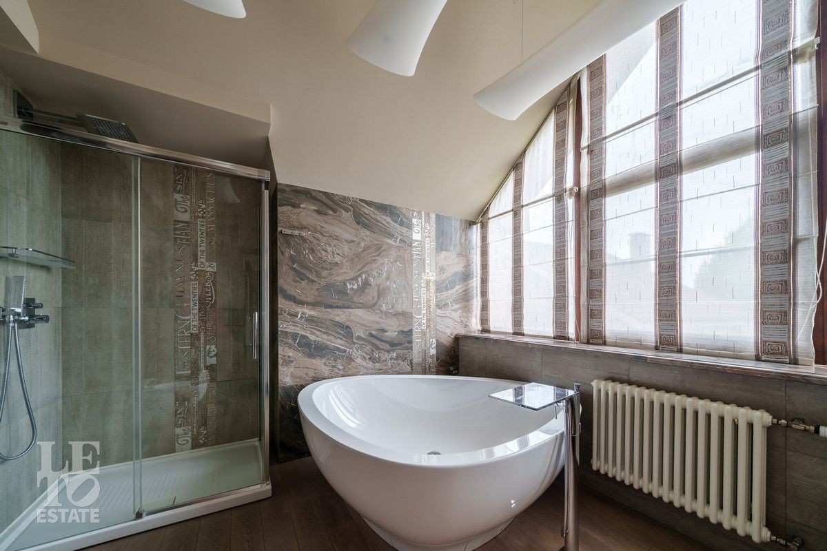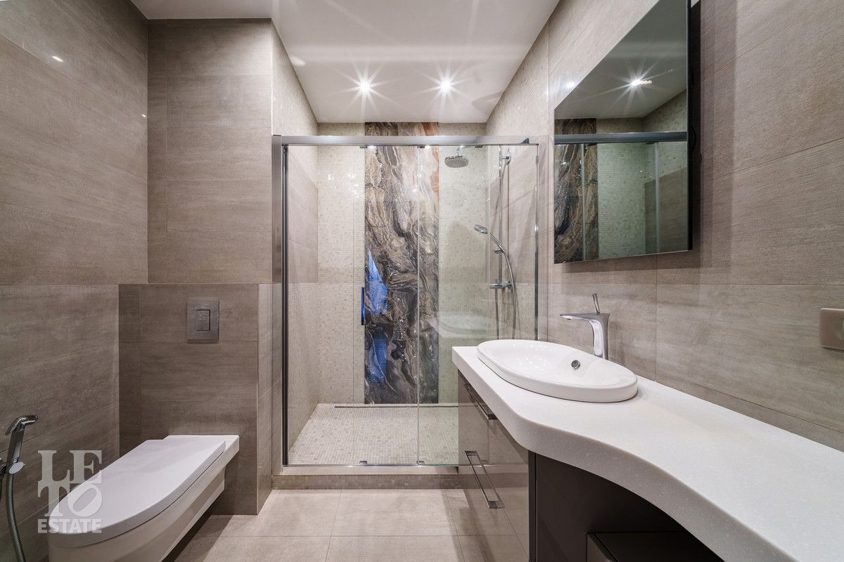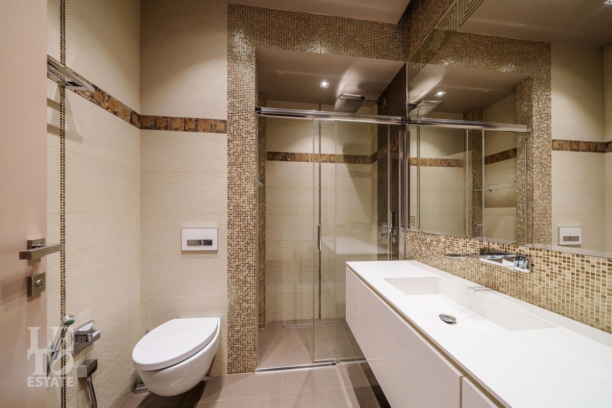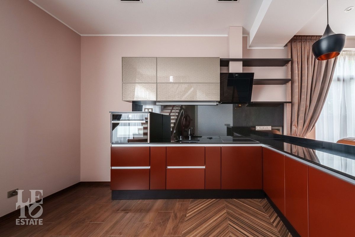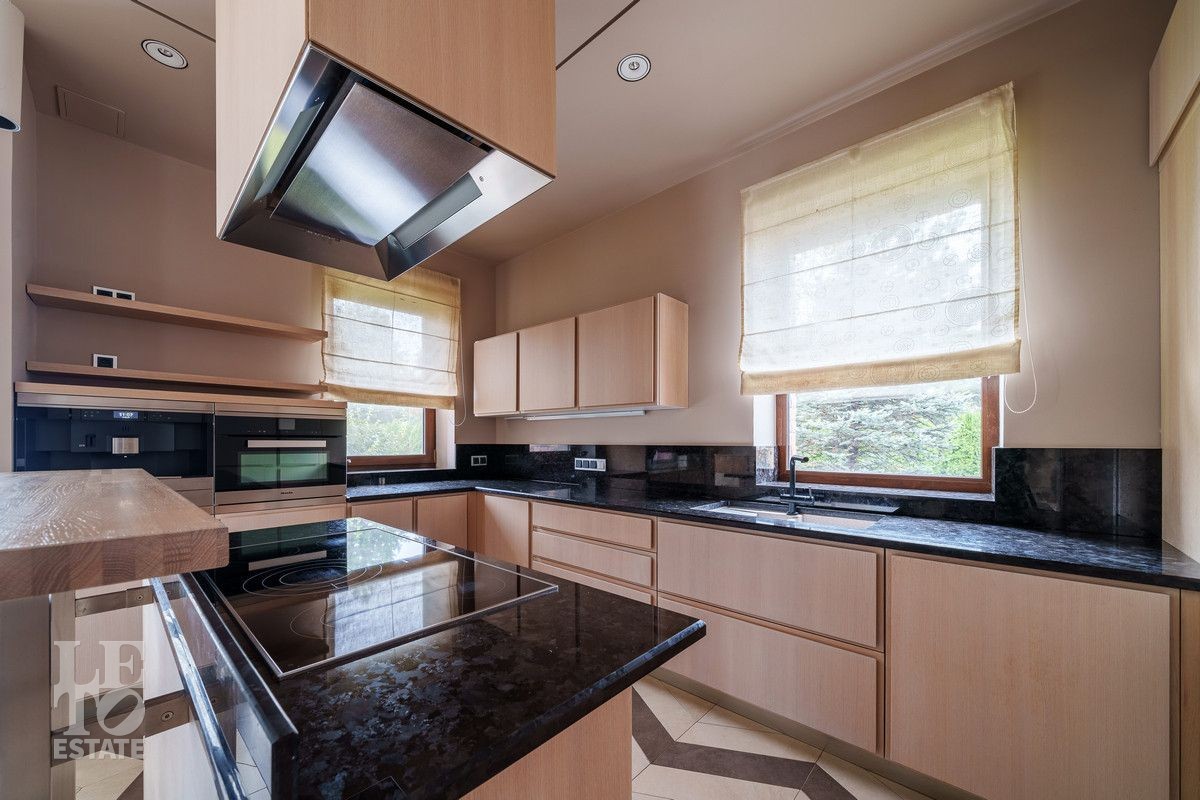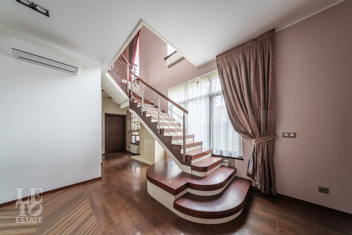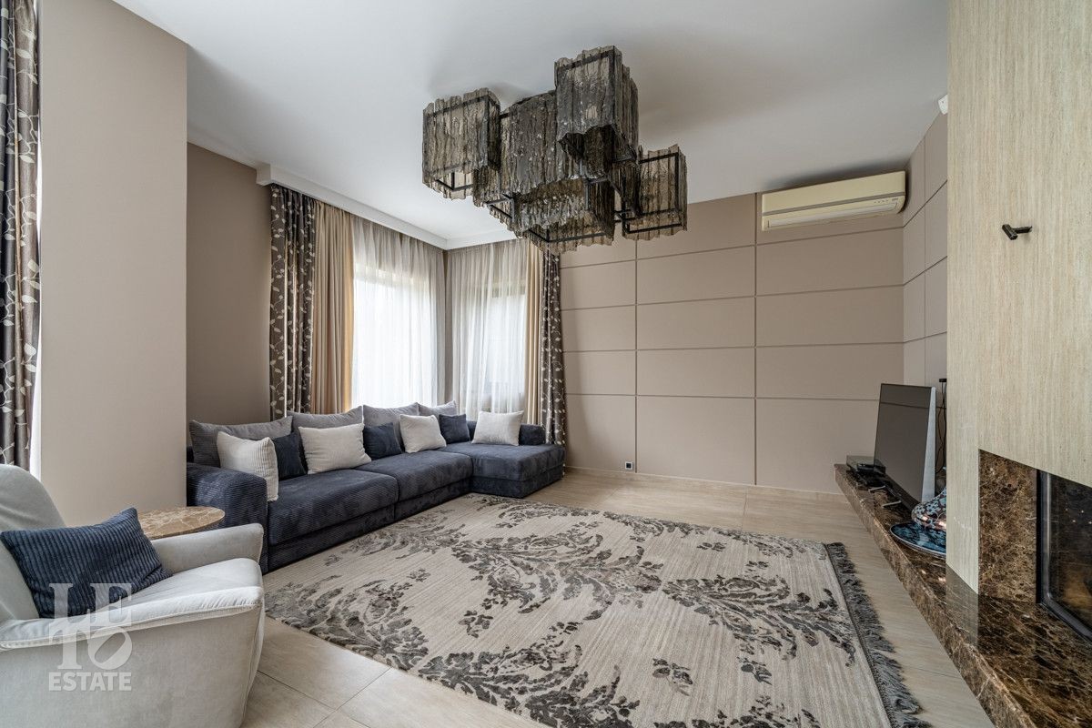 В основном доме удобно сочетаются большие зоны остекления с функциональным зонированием на главные места притяжения: кухня, столовая и гостиная с двухсторонним камином с выходом на террасу. Полы в доме на первом этаже выполнены из керамогранита с проложенным теплым водяным полом. Полы в жилых комнатах и в холлах выполнены из массива дуба и находятся в идеальном состоянии. Вся техника премиальных мировых брендов (Miele, Neff, Bosch) установлена в санузлах и на кухне. Все жилые комнаты оснащены кондиционерами, по дому разведена приточно-вытяжная вентиляция.