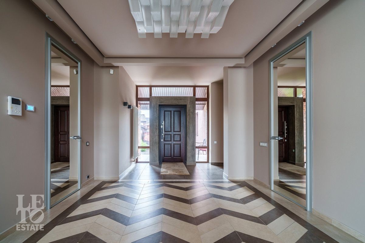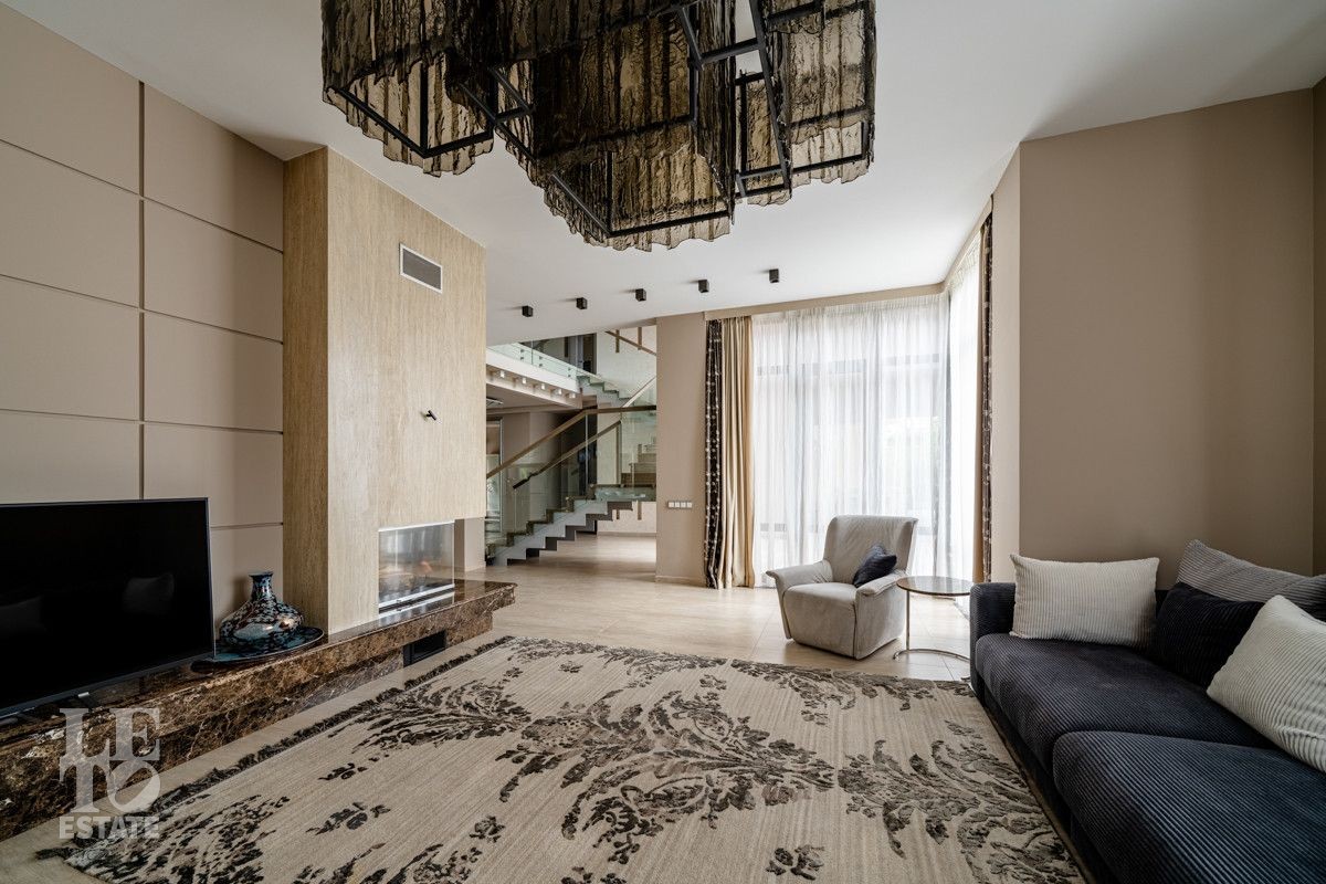 Первый этаж: гараж на два автомобиля, котельная-бойлерная с системой водоочистки, холл, две гардеробные, кухня с барной стойкой, столовая, гостиная с двусторонним камином и выходом на террасу, гостевая спальня, постирочная, санузел с душевой;